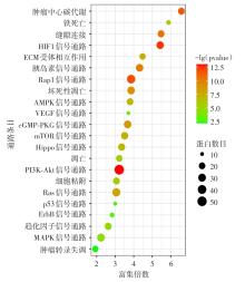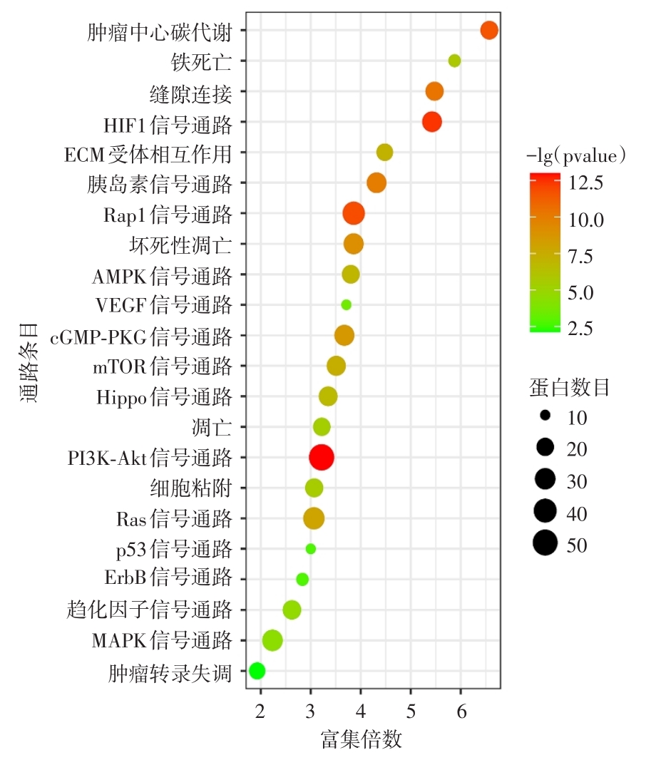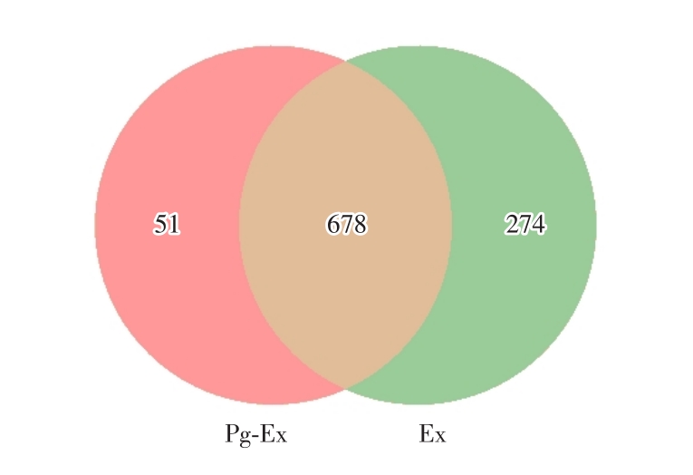 目的 研究牙龈卟啉单胞菌(Porphyromonas gingivalis,Pg)对食管鳞癌Eca109细胞分泌的外泌体(exosome,Ex)蛋白表达及相关功能和信号通路的影响。 方法 纳米液相色谱-串联质谱分析Nano-LC-MS/MS鉴定Pg感染和未感染的Eca109细胞外泌体蛋白,通过生物信息学方法找出差异蛋白,并对差异蛋白进行GO富集分析和KEGG通路分析。 结果 Nano-LC/MS分析检测到Pg-Ex和Ex分别有729、952种蛋白质,与Ex相比,Pg-Ex有387个蛋白表达上调、294个蛋白表达下调。这些差异蛋白主要参与调节细胞增殖、分化、黏附、迁移、血管生成、趋化、免疫反应等生物过程;富集在肿瘤中心碳代谢、PI3K-Akt信号通路、HIF-1信号通路、Rap1信号通路、缝隙连接、Ras信号通路、mTOR信号通路、胰岛素信号通路、cGMP-PKG信号通路、ECM受体相互作用、趋化因子信号通路、VEGF信号通路等信号通路。 结论 这些差异蛋白所参与的功能及信号通路提示Pg通过调控肿瘤细胞增殖、迁移、血管生成和免疫反应参与食管癌发生发展。