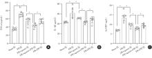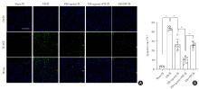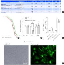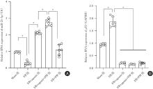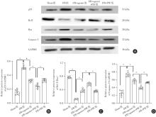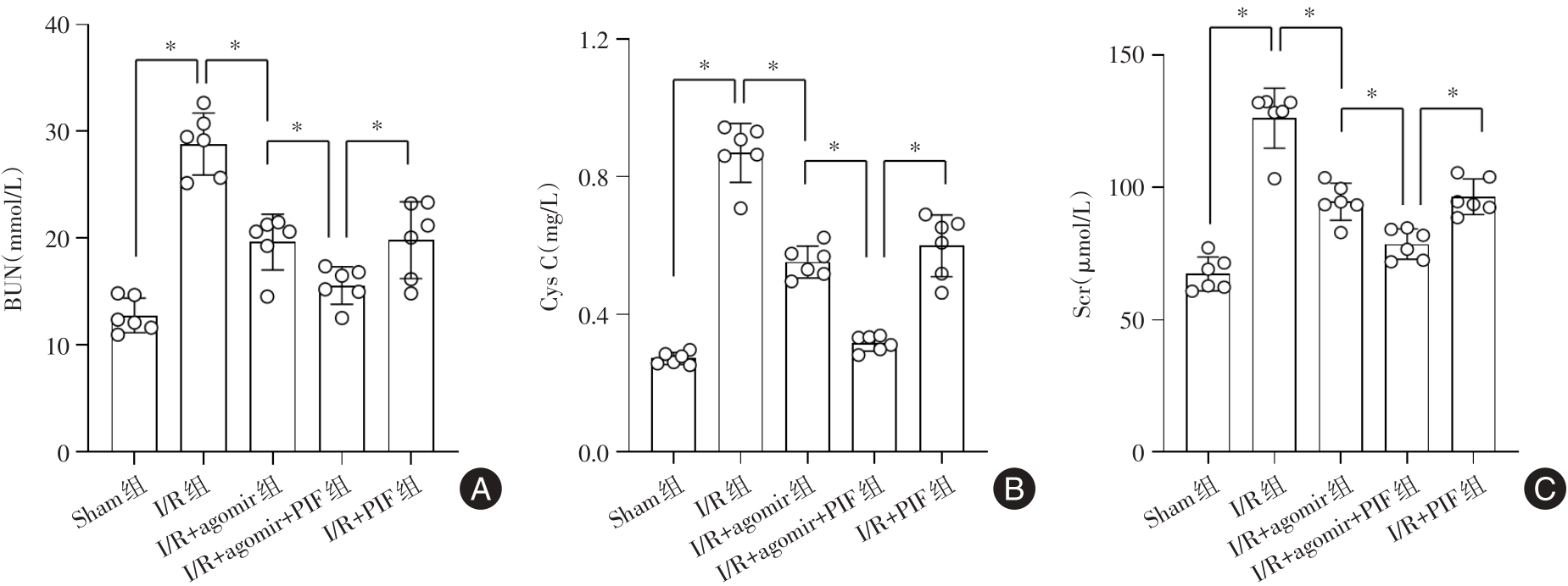 目的 观察miR-21-3p对肾缺血/再灌注(ischemia/reperfusion,I/R)损伤小鼠的影响,并探讨其肾脏保护作用是否与通过miR-21-3p/p53信号通路而调控凋亡水平有关。 方法 体内实验随机分为Sham、I/R、I/R + agomir、I/R + agomir + PIF、I/R + PIF共5组。建立小鼠肾缺血/再灌注(I/R)损伤模型;构建过表达miR-21-3p(agomiR-21-3p)小鼠,同时给予p53抑制剂Pifithrin-α(PIF)处理;采用双荧光素酶报告基因实验验证miR-21-3p与p53的互作;检测小鼠血清中肾功能指标小鼠胱抑素 C(Cys C)、尿素氮(BUN)、肌酐(Scr)的含量,以及炎症指标肿瘤坏死因子-α(TNF-α)、白细胞介素-1β(IL-1β)、超敏C反应蛋白(hs-CRP)含量水平;此外,TUNEL染色观察肾细胞凋亡情况,并检测肾组织(细胞)匀浆中细胞凋亡相关基因p53、Bax、Bcl2、Caspase-3的表达水平。 结果 与Sham组比较,I/R组小鼠肾细胞miR-21-3p表达明显降低;而与I/R组相比,I/R + agomir组、I/R + PIF组和I/R + agomir + PIF组miR-21-3p表达均明显升高(P < 0.05),而p53表达趋势相反;双荧光素酶报告基因实验证实miR-21-3p与p53存在互作关系;与Sham组比较,其他肾组织细胞凋亡率均升高;但是与I/R组相比,I/R + agomir组、I/R + PIF组和I/R + agomir + PIF组凋亡率降低,I/R + agomir + PIF组损伤最低(P < 0.05)。 结论 miR-21-3p可以通过靶向下调p53表达来抑制凋亡的发生,从而减轻肾I/R小鼠的肾损伤,发挥肾脏保护作用。