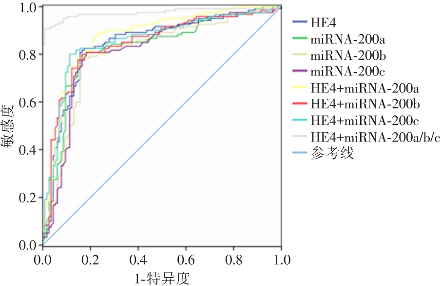 目的 研究血清人附睾蛋白4(human epididymal protein,HE4)联合外泌体中的微小RNA(miRNA)-200a/200b/200c用于糖链抗原125(sugar chain antigen,CA125)阴性卵巢上皮癌(epithelial ovarian carcinoma,EOC)早期诊断的价值。 方法 选取CA125阴性EOC患者120例作为研究对象,设为研究组;另选取同期收治的115例卵巢上皮良性肿瘤患者作为良性组,107例于武汉市第一医院体检的健康女性作为对照组。比较3组HE4、CA125、miRNA-200a、miRNA-200b、miRNA-200c水平,通过受试者工作特征(ROC)曲线分析各项血清指标鉴别CA125阴性EOC及卵巢上皮良性肿瘤的价值。 结果 研究组HE4及miRNA-200a、miRNA-200b、miRNA-200c水平显著高于良性组、对照组,差异有统计学意义(P < 0.05)。经ROC分析证实,血清HE4及miRNA-200a、miRNA-200b、miRNA-200c能够用于CA125阴性EOC的诊断,且HE4+miRNA-200a/b/c联合诊断相对于单独及两两诊断可获得更高的曲线下面积,均有P < 0.05。经logistic逐步回归分析证实,HE4 ≥ 163.110 pmol/L、miRNA-200a ≥ 2.700 2-△△CT、miRNA-200b ≥ 1.665 2-△△CT、miRNA-200c ≥ 1.395 2-△△CT为CA125阴性EOC发生的危险因素(P < 0.05)。 结论 血清HE4及miRNA-200a、miRNA-200b、miRNA-200c可用于CA125阴性EOC的早期诊断中,且四项指标联合诊断具有更高的敏感度与特异性,值得临床医师关注。