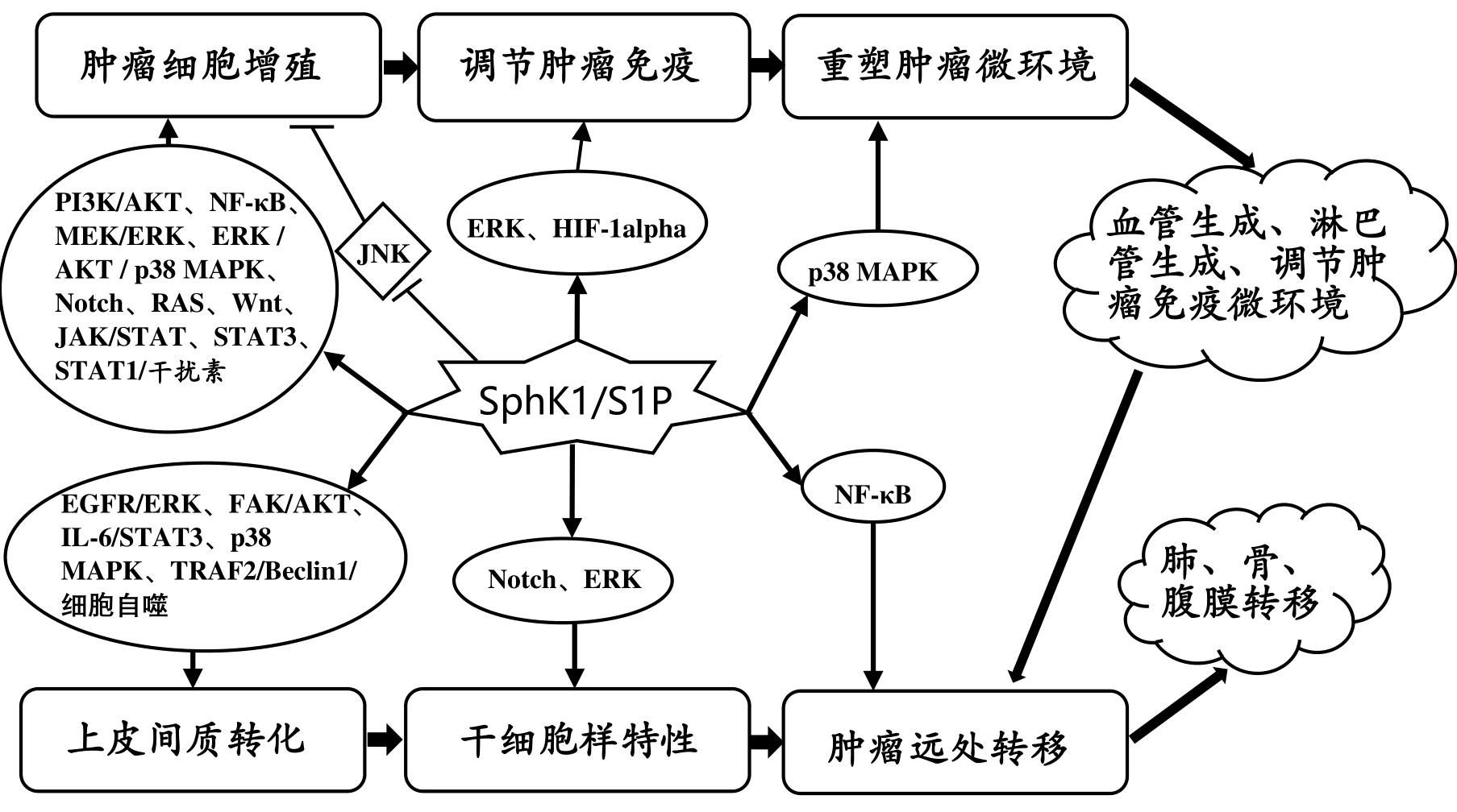 鞘磷酸激酶1(sphingosin kinase 1,SphK1)是一种鞘磷脂代谢产物的调节因子,催化鞘氨醇转变为鞘氨醇-1-磷酸(sphingosine 1 phosphate acid,S1P)。SphK1/S1P在多种癌症中过表达,本文回顾SphK1/S1P在肿瘤恶性生物学行为如肿瘤细胞增殖、上皮间质转化、获得干细胞样特性、重塑肿瘤微环境、调节肿瘤免疫功能、促进肿瘤细胞远处转移中的作用及机制,表明SphK1/S1P在肿瘤多个恶性生物学行为中起关键作用。
