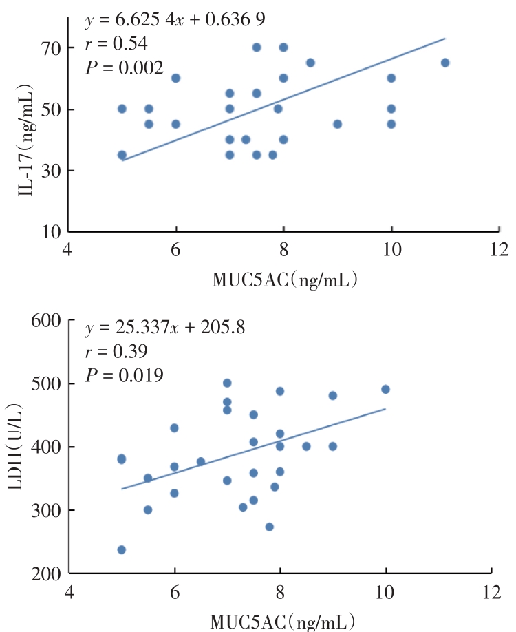 Objective To investigate the expression of mucin 5AC (MUC5AC) in airway of children with mycoplasma pneumoniae pneumonia(MPP), and to provide clinical value for early diagnosis and treatment of MPP mucus plug. Methods A total of 94 children with MPP who were hospitalized for alveolar lavage from April 2022 to October 2022 were included in the MPP group. According to whether mucus plug was observed under the first fiberoptic bronchoscope, the MPP group was divided into mucus plug group (n = 41) and non-mucus plug group (n = 53). Relevant clinical data and laboratory examination data were collected. Results Compared with non mucus plug group, the mucus plug group had a longer heat duration and hospital stay, and the levels of CRP, LDH,PCT, D-dimer, MP-DNA copy value of lavage fluid, IL-17, MUC5AC were all increased,with statistically significant differences (P < 0.05). MUC5AC was positively correlated with LDH and IL-17 levels (r = 0.54, P = 0.002; r = 0.39, P = 0.019). The ROC curve plotted based on the level of MUC5AC had an area under the ROC curve of 0.811, a sensitivity of 86.2% and a specificity of 71.4% for predicting formation of mucus plug in MPP. Conclusions There was an increase in the level of MUC5AC in children with mucus plug group in MPP, and the level of MUC5AC had a certain value for predicting mucus plug formation.