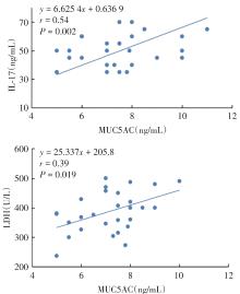 目的 探讨黏蛋白5AC(MUC5AC)在儿童肺炎支原体肺炎(MPP)患者呼吸道中的表达,为MPP黏液栓早期诊断及治疗提供临床帮助。 方法 纳入2022年4-10月住院进行肺泡灌洗的 MPP 患儿共94 例,根据首次纤维支气管镜下是否观察到黏液栓,将MPP组分为黏液栓组41 例及非黏液栓组 53例。收集两组相关临床资料及实验室检查数据。 结果 与非黏液栓组比较,黏液栓组的热程和住院时间均较长,C反应蛋白(CRP)、 乳酸脱氢酶 (LDH)、降钙素原(PCT)、D二聚体、灌洗液肺炎支原体DNA(MP-DNA)拷贝数值、白细胞介素17(IL-17)、MUC5AC水平均升高,差异有统计学意义(P < 0.05)。MUC5AC与IL-17、LDH均呈正相关(分别r = 0.54,P = 0.002;r = 0.39,P = 0.019),以MUC5AC水平绘制受试者工作特征曲线,其曲线下面积为0.811,预测MPP黏液栓形成的灵敏度为86.2%,特异度为71.4%。 结论 MPP黏液栓形成患儿MUC5AC表达水平增高;MUC5AC对MPP黏液栓的形成具有一定的预测价值。