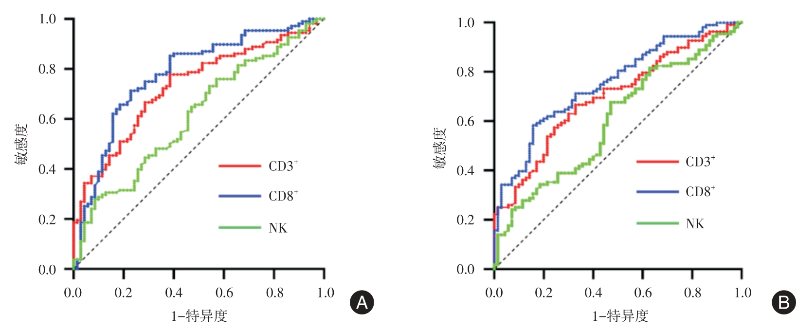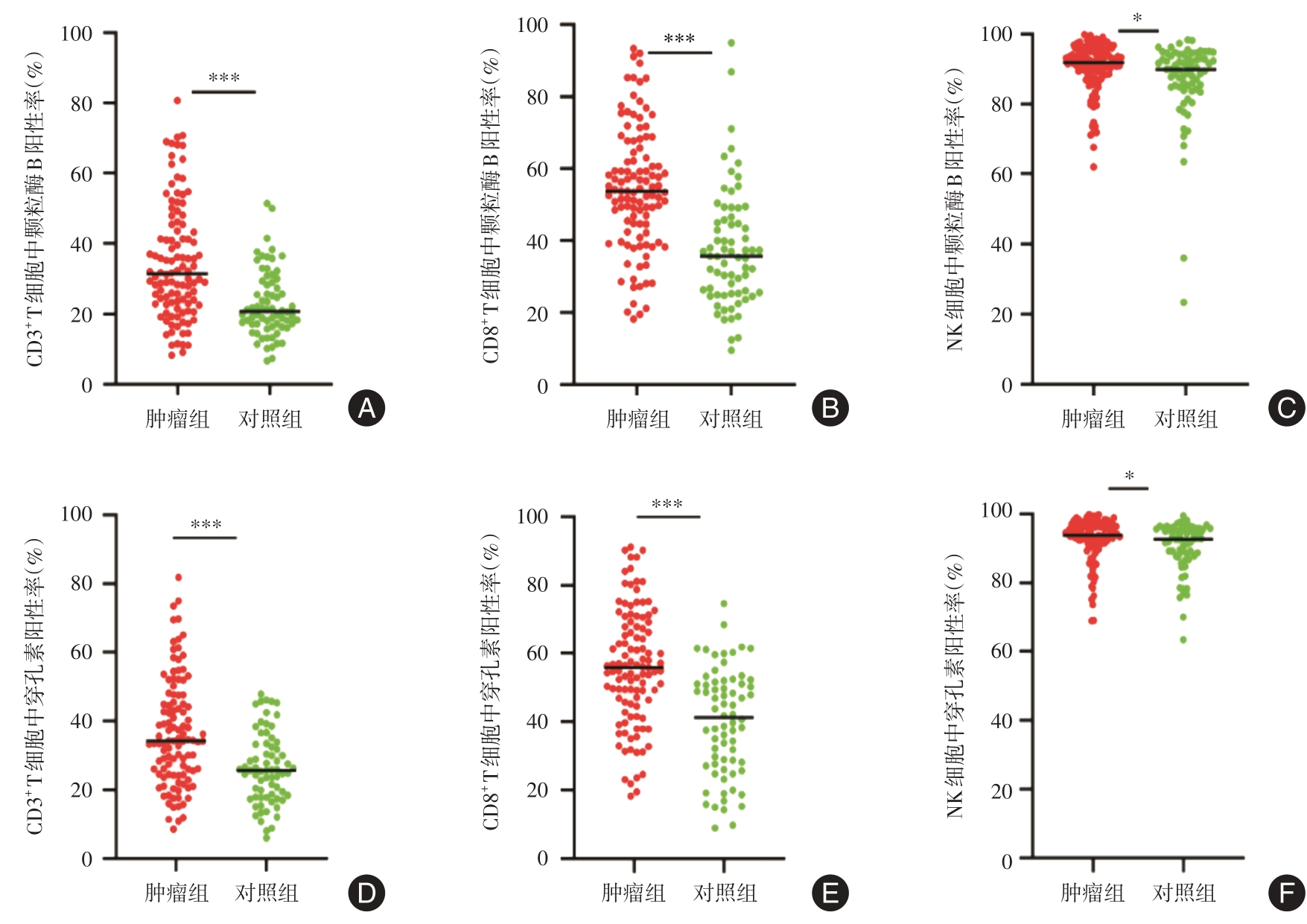 目的 分析乳腺癌患者外周血T淋巴细胞及NK细胞中颗粒酶B和穿孔素的表达对乳腺癌的诊断价值,明确颗粒酶B和穿孔素的表达与乳腺癌分子分型、肿瘤分期等临床病理特征的相关性及其对乳腺癌治疗效果的评价。 方法 应用流式细胞术检测108例乳腺癌和70例乳腺良性疾病患者样本中CD3+T细胞、CD8+T细胞及NK细胞中颗粒酶B和穿孔素的表达;采用受试者工作特征(ROC)曲线评估各指标对乳腺癌的诊断效能,比较不同临床病理特征乳腺癌患者颗粒酶B和穿孔素的表达及治疗前后各指标的变化。 结果 乳腺癌患者T淋巴细胞亚群与NK细胞中颗粒酶B和穿孔素表达均高于对照组,差异均有统计学意义(P < 0.05)。ROC曲线分析结果显示,CD3+T细胞、CD8+T细胞及NK细胞中颗粒酶B和穿孔素阳性率的曲线下面积(AUC)大于0.5。CD3+T细胞中颗粒酶B和穿孔素的表达与乳腺癌肿瘤大小及临床分期呈正相关(P < 0.05),CD8+T细胞中颗粒酶B也与乳腺癌肿瘤大小及临床分期呈正相关(P < 0.05)。乳腺癌患者淋巴结转移组中CD3+T细胞中颗粒酶B和穿孔素表达明显高于无淋巴结转移组(P < 0.05)。乳腺癌患者治疗后外周血T淋巴细胞中颗粒酶B和穿孔素表达高于治疗前(P < 0.05)。 结论 外周血CD3+T细胞、CD8+T细胞和NK细胞中颗粒酶B及穿孔素的表达对于诊断乳腺癌有一定的参考价值,且与肿瘤大小、淋巴结转移及临床分期有关,可辅助临床上乳腺癌的早期筛查、诊断及治疗效果评价。