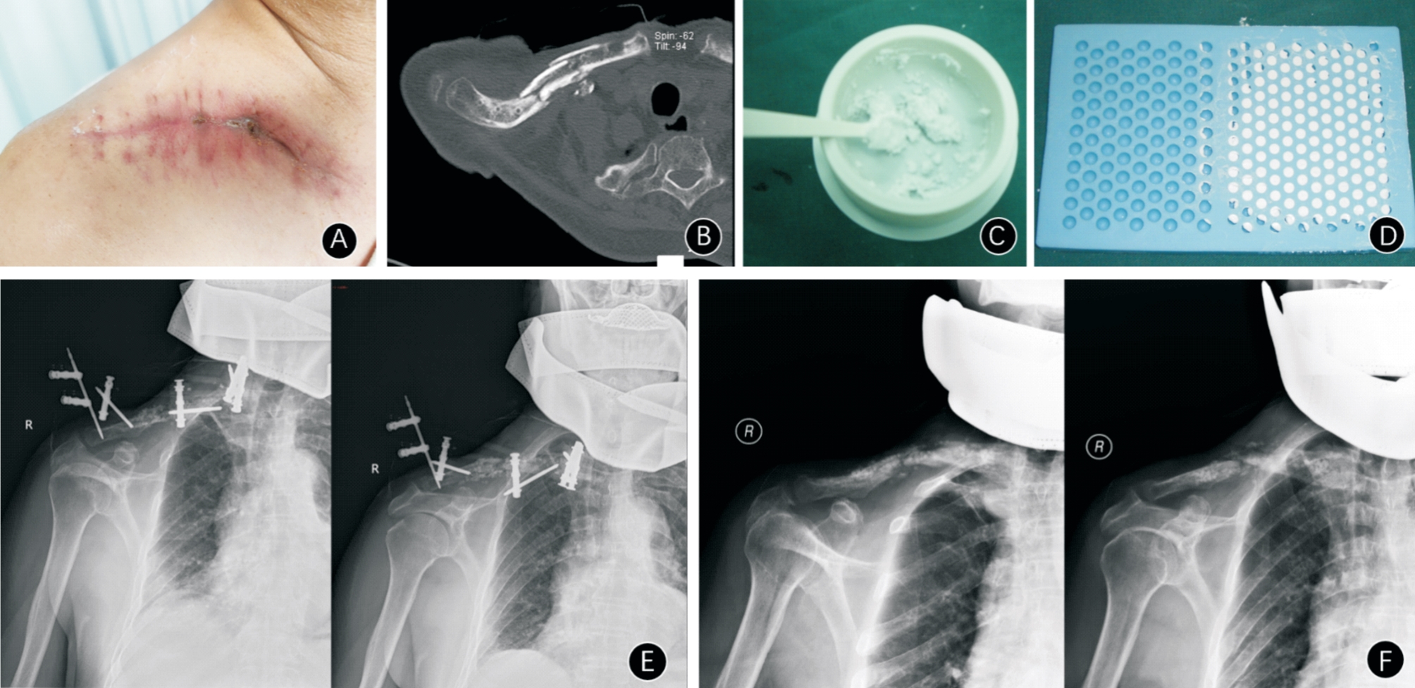 目的 探讨病灶清除联合载抗生素人工骨治疗锁骨骨髓炎的疗效。 方法 回顾性分析2012年1月至2022年6月河南省洛阳正骨医院(河南省骨科医院)收治的45例锁骨骨髓炎患者资料。根据手术方法不同分为两组,观察组(n = 24)采用病灶清除联合载抗生素人工骨植入术;对照组(n = 21)采用病灶清除术。比较两组患者手术时间、引流管放置时间和伤口愈合时间,术前及术后14 d白细胞(WBC)、C反应蛋白(CRP)、红细胞沉降率(ESR)等血清炎性指标控制情况,术前与术后1个月视觉模拟评分(VAS)及术后12个月Constant肩关节功能评分,随访有无感染复发及并发症发生情况。 结果 45例患者均顺利进行手术,均获随访13 ~ 35个月,平均(23.53 ± 5.11)个月。两组患者治疗情况比较,观察组的手术时间和引流管放置时间均长于对照组(P < 0.05),伤口愈合时间比较差异无统计学意义(P > 0.05);两组术前与术后14 d的WBC、CRP、ESR血清炎性指标、术后1个月视觉模拟评分(VAS)和术后12个月Constant肩关节功能评分比较均显著改善,差异均有统计学意义(P < 0.05),且观察组Constant肩关节功能评分优于对照组(P < 0.05)。随访过程中,观察组2例(8.33%)感染复发,优于对照组5例(23.81%);观察组2例出现无菌性渗出并发症;观察组1例骨缺损不愈合,对照组5例,经二期髂骨植骨后骨缺损均愈合,余均未出现无菌性渗出、骨缺损和病理性骨折并发症。 结论 病灶清除联合载抗生素人工骨治疗锁骨骨髓炎可有效控制感染,保留锁骨的外形与功能,降低术后感染复发率,手术操作简单,且无严重并发症,值得临床推广。