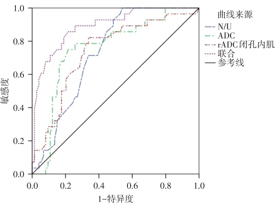 Objective To investigate the value of tumor volume to uterine volume ratio (N/U) combined with tumor apparent diffusion coefficient (ADC) in predicting the pathological grade of endometrial carcinoma (EC). Methods Data of 107 patients with EC admitted from July 2020 to January 2023 were retrospectively analyzed. All patients underwent preoperative magnetic resonance imaging (MRI), and pathological diagnosis was used as the gold standard. Patients with low differentiation were included in the high grade group, and patients with medium and high differentiation were included in the low grade group. The factors affecting the pathological grading of EC patients were analyzed, and the value of MRI index in predicting the pathological grading of EC patients was analyzed. Results The pathological examination showed that there were 24 high-grade patients and 83 low-grade patients.. Logistic multivariate regression analysis showed that N/U, ADC, rADC internal obturator muscle were factors affecting the pathological grade of EC patients ( P < 0.05). ROC curve results showed that the sensitivity of N/U, ADC, rADC internus obturator muscle and their combination to predict the pathological grading of EC patients were 70.83%, 75.00%, 79.17%, 83.33%, the specificity were 71.08%, 79.52%, 78.31%, 85.54%, and the AUC were 0.734, 0.756, 0.741 and 0.891. Conclusion The combination of N/U, ADC, rADC and obturator internal muscle was effective in predicting the preoperative pathological grading of EC patients.