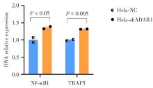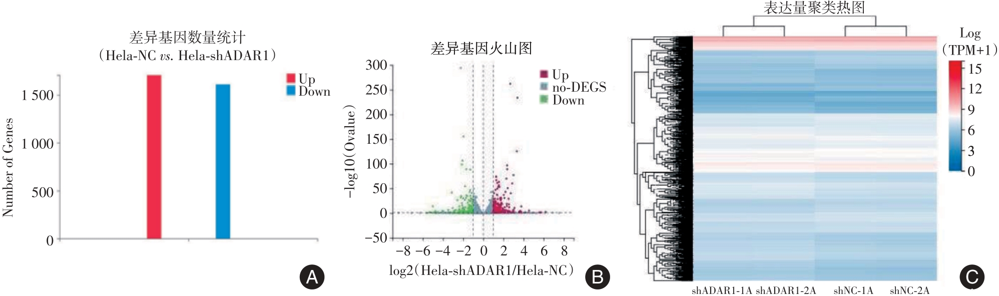 目的 使用RNA-seq技术分析腺苷脱氨酶1(ADAR1)在宫颈癌Hela细胞株中对基因表达的调控情况,并为揭示ADAR1在宫颈癌发生和进展中的作用提供理论依据。 方法 对正常和ADAR1敲低的Hela细胞株进行RNA-seq测序,筛选出差异表达基因。通过KEGG Pathway、GO cellular和GSEA富集分析,分析ADAR1在Hela细胞株中参与的相关信号通路和生物学过程。 结果 差异表达基因主要富集在免疫和炎症相关信号通路(如TNF-α/NF-κB、NIK/NF-κB、Jak/Stat-IL-6)、Hippo信号通路、TGF-β等信号通路上,参与了干扰素应答、细胞氨基酸代谢调控、蛋白质泛素化/去泛素化、病毒转录等生物过程;对NF-κB信号通路的相关基因进行深入分析后发现,ADAR1敲低后,NF-κB1和TRAF5的mRNA表达水平明显升高(P < 0.05)。 结论 ADAR1可能通过调控NF-κB信号通路相关因子的表达,进而调控宫颈癌的发生和发展。