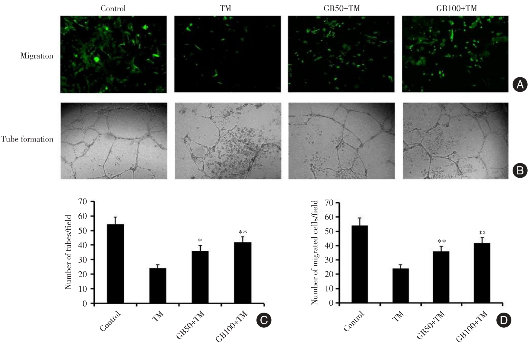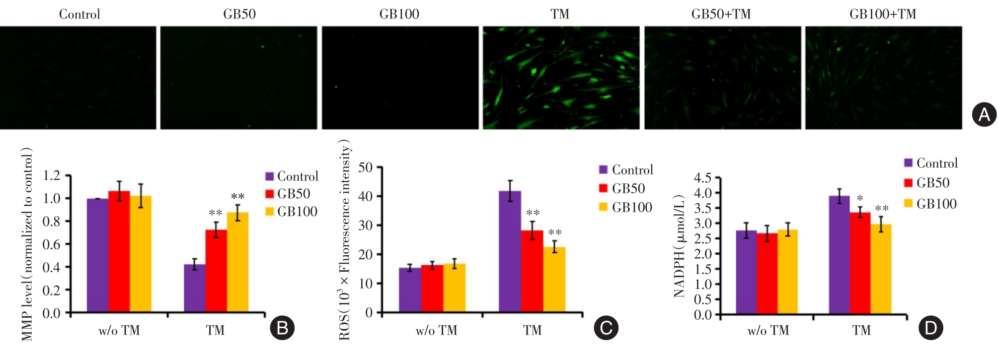 Objective To investigate the potential of ginkgolide B (GB) in mitigating vascular endothelial injury by antagonizing endoplasmic reticulum stress (ERS) and elucidate its underlying molecular mechanism. Methods An injury model of human bone marrow?derived endothelial progenitor cells (EPCs) induced by tunicamycin (TM) was established. Cell proliferation was assessed using MTS assay, while cell viability was determined through Calcein?AM/EthD?I double staining. Transwell assay was employed to evaluate cell migration ability. DCFH?DA staining was utilized to measure intracellular ROS levels, and NADPH activity was quantified via ELISA. JC?1 and DiOC6 staining were performed for qualitative and quantitative assessment of mitochondrial membrane potential respectively. Qrt?pcr analysis was conducted to determine mRNA expression levels, whereas western blot analysis enabled detection of protein expression levels in the cells. Results GB dose?dependently attenuated tunicamycin?induced ERS?mediated endothelial injury in hEPCs, as evidenced by decreased cell viability, impaired cell migration, and angiogenesis inhibition (P < 0.01). Furthermore, GB treatment significantly reduced ROS production and NADPH levels within the cells (P < 0.01), while also inhibiting ERS?mediated decline in mitochondrial membrane potential concentration?dependently (P < 0.01). Additionally, GB inhibited the expression of ERS?related proteins such as GRP78, ATF4, CHOP etc., regulated apoptosis?related protein Bcl?xl, Bax cleaved caspase?4 cytochrome c; thereby effectively counteracting endoplasmic reticulum stress?induced cellular damage. Conclusions GB exerts a protective effect on vascular endothelium by antagonizing endoplasmic reticulum stress; this mechanism may be attributed to its ability to reduce intracellular reactive oxygen species levels. It also suppresses the expression of ERS?related proteins (CHOP78 and ATF4),and modulates apoptosis?associated proteins (Bcl?xl, Bax, cleaved caspase?4, and cytochrome c).