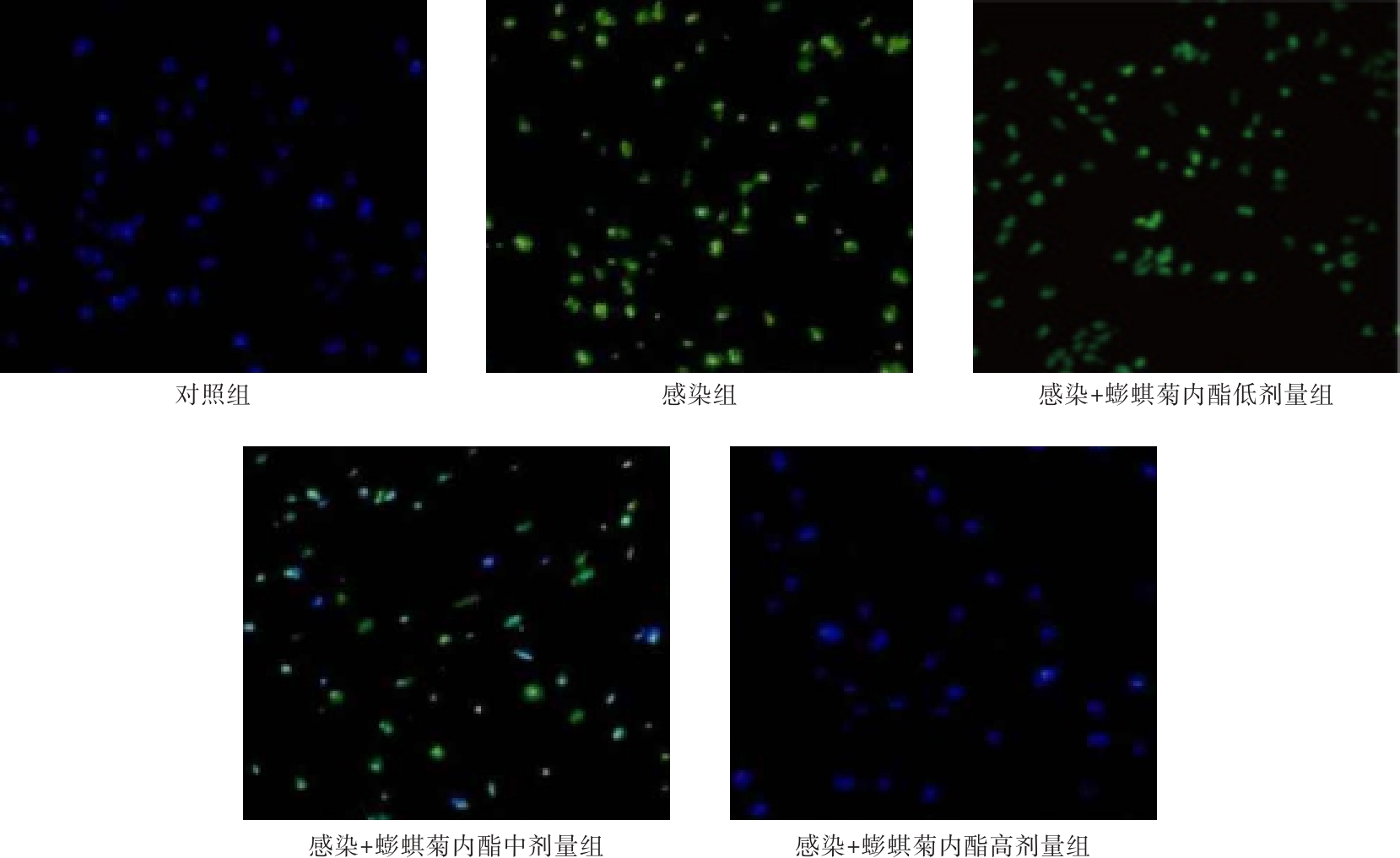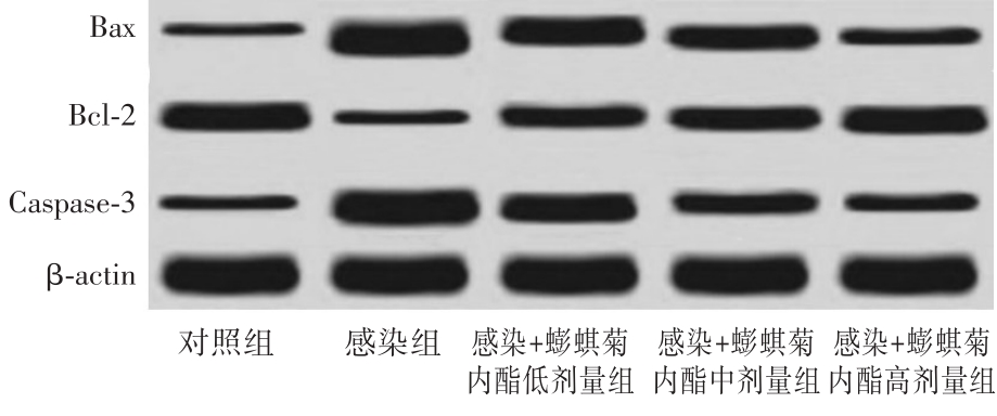 目的 分析蟛蜞菊内酯对肺炎链球菌感染的肺泡上皮细胞凋亡及炎症因子分泌的调节作用。 方法 将肺泡上皮细胞A549分为感染组(1 × 108/CFU/mL的肺炎链球菌培养细胞)、对照组(不作处理)、感染+蟛蜞菊内酯低剂量组、中剂量组、高剂量组(10、20、40 μmol/L蟛蜞菊内酯预处理,之后采用1 × 108/CFU/mL的肺炎链球菌培养细胞)。检测细胞凋亡率、凋亡相关蛋白表达量、炎症因子mRNA相对表达量及水平。 结果 与对照组相比,感染组、感染+蟛蜞菊内酯低剂量组、中剂量组、高剂量组凋亡率、Bax、Caspase-3蛋白表达量、IL-6、IL-1β、TNF-α mRNA相对表达量及水平较高,Bcl-2蛋白表达量较低(P <0.05);与感染组相比,感染+蟛蜞菊内酯低剂量组、中剂量组、高剂量组凋亡率、Bax、Caspase-3蛋白表达量、IL-6、IL-1β、TNF-α mRNA相对表达量及水平较低,Bcl-2蛋白表达量较低,且感染+蟛蜞菊内酯高剂量组凋亡率、Bax、Caspase-3蛋白表达量、IL-6、IL-1β、TNF-α mRNA相对表达量及水平最高,Bcl-2蛋白表达量最低(P < 0.05)。 结论 肺炎链球菌感染的肺泡上皮细胞经蟛蜞菊内酯干预后细胞凋亡率下降,炎症因子分泌减少。