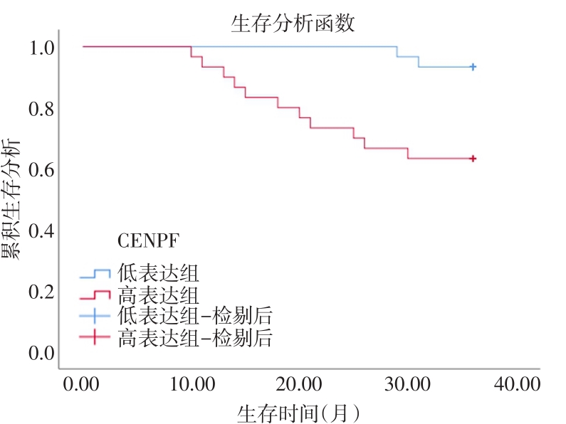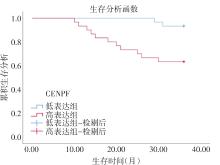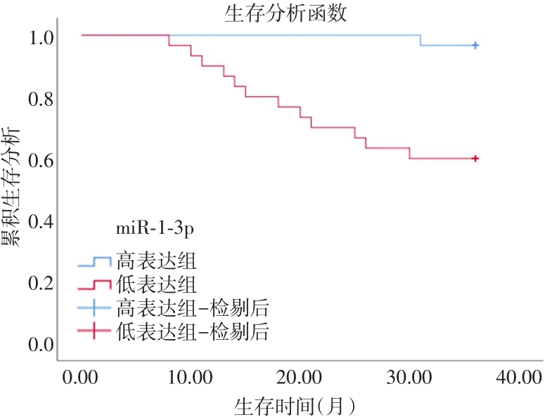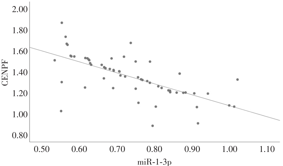 目的 探讨着丝粒蛋白F(CENPF)、miRNA-1-3p(miR-1-3p)在中晚期胃癌患者血清中的表达及与预后的相关性。 方法 选取2019年3月至2020年3月我院收治的60例中晚期胃癌患者即为研究组,同期在我院体检中心体检健康的志愿者60例为对照组。采用实时荧光定量PCR(qRT-PCR)法检测各组血清CENPF、miR-1-3p的表达水平;采用Pearson法分析血清中CENPF、miR-1-3p水平的相关性;采用Kaplan-Meier法分析CENPF、miR-1-3p表达与中晚期胃癌患者预后的关系;COX回归分析影响中晚期胃癌患者预后的危险因素。 结果 与对照组比较,研究组患者CENPF水平明显升高,miR-1-3p水平明显降低(P < 0.05)。相关性分析结果显示,中晚期胃癌患者血清中CENPF和miR-1-3p水平呈负相关(r = -0.650,P < 0.001)。不同TNM分期和淋巴结转移状况下CENPF、miR-1-3p水平比较差异有统计学意义(P < 0.05)。CENPF高表达组患者3年生存率63.33%(19/30)显著低于低表达组93.33%(28/30)(χ2 = 7.954,P < 0.001);miR-1-3p高表达组患者3年生存率96.67%(29/30)显著高于低表达组60.00%(18/30)(χ2 = 11.882,P = 0.001)。多因素COX回归分析显示,TNM分期、淋巴结转移、CENPF、miR-1-3p表达是影响中晚期胃癌患者预后的危险因素(P < 0.05)。 结论 中晚期胃癌患者血清中CENPF水平显著升高,miR-1-3p水平显著降低,二者与预后有关。