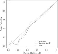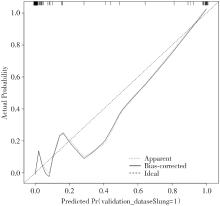 目的 基于胸部CT及临床特征构建原发性干燥综合征(primary Sjogren's syndrome, pSS)患者肺脏受累的风险预测模型,并探讨模型的风险预测价值。 方法 回顾性选取邯郸市中医院于2020年10月至2023年8月收治的360例pSS患者为研究对象,按照7∶3的分配比例分为建模组252例和验证组108例。建模组患者根据肺脏受累与否分为对照组201例和受累组51例。收集建模组患者临床特征资料与胸部高分辨CT(high resolution CT, HRCT)特点,行组间单因素分析确定收集信息中影响pSS患者肺脏受累的相关因素。对相关因素行二元logistic回归分析以筛选独立危险因素,并以独立危险因素建立预测模型,通过验证组资料收集配合完成列线图预测模型的验证与价值分析。 结果 患者年龄、病程、咳嗽、雷诺现象、C反应蛋白(C-reactive protein, CRP)、抗SSA抗体、HRCT等为影响pSS患者肺脏受累的相关因素(P < 0.05)。进一步行二元logistic回归分析发现,患者年龄大、病程长、咳嗽及HRCT异常为影响SS患者肺脏受累的独立危险因素(P < 0.05)。以独立影响因素构建列线图风险预测模型,模型验证结果提示,校准图显示预测模型性能良好;建模组受试者工作特征(ROC)曲线的曲线下面积(AUC)为0.993;验证组ROC的AUC为0.995。 结论 pSS患者临床特征与胸部CT结果与患者肺脏受累密切相关,其中患者年龄大、病程长、咳嗽及HRCT异常为影响pSS患者肺脏受累的独立危险因素,以此为基础建立预测模型对患者后装放疗是否发生肺脏受累具有较高预测价值。