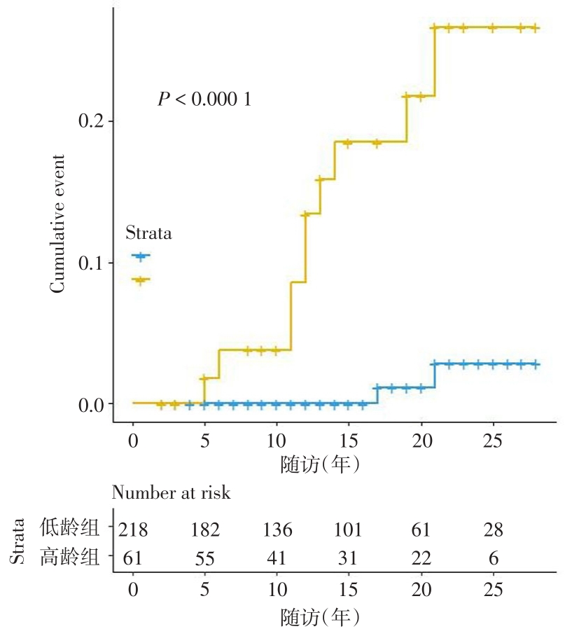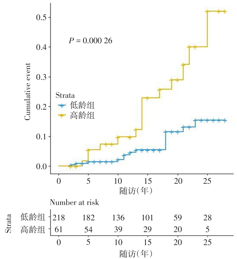 Objective To investigate the effect of age on the incidence of cirrhosis and liver cancer in patients with chronic hepatitis B. Methods 279 patients with chronic hepatitis B were divided into the senior group and the younger group according to the age of the patients. The cumulative incidence of cirrhosis and liver cancer during 25 years of follow-up was calculated by using SPSS and R language through the long-term follow-up of HIS system, and the risk factors were analyzed by multivariate logistic regression. Results During follow-up, 24 cases developed cirrhosis and 12 cases developed liver cancer. The cumulative incidence of liver cirrhosis was 1.5%, 2.1%, 5.4%, 11.6% and 15.5% in the 5-year, 10-year, 15-year, 20-year and 25-year group, and 5.5%, 9.8%, 22.9%, 29.0% and 52.1% in the elderly, respectively. The difference between the younger age group and senior age group was statistically significant (P < 0.001). A total of 2 risk factors (age and follow-up time) were included in the regression model. Two cases in the younger group developed into liver cancer after 17 and 21 years of follow-up, respectively. The cumulative incidence rates at 5, 10, 15, 20 and 25 years were 1.8%, 3.8%, 18.5%, 21.8% and 26.7%. A total of five factors (initial age, HBV-DNA load, HBV-DNA turned negative before the endpoint, follow-up time, and sex) were included in the regression model. Conclusions The incidence of cirrhosis and liver cancer in CHB patients aged ≥ 40 years, especially in male patients, is significantly higher than younger CHB patients. Timely initiation of antiviral therapy can delay disease progression and reduce the incidence of terminal liver disease.Whether antiviral therapy should be initiated for people aged 30 to 40 years remains to be studied.