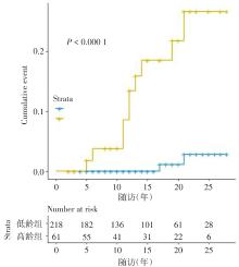 目的 探讨慢性乙型病毒性肝炎(慢乙肝)患者年龄对其肝硬化、肝癌发病率的影响。 方法 检索1995-1998年于深圳市中医院住院的慢乙肝患者,按照患者年龄,分为高龄组和低龄组,通过HIS系统长期随访,使用SPSS、R语言计算患者随访25年肝硬化、肝癌累积发病率并进行组间比较,使用多因素logistic回归探讨危险因素。 结果 随访期间279例慢乙肝患者进展为肝硬化24例、肝癌12例。肝硬化5、10、15、20年及25年肝硬化累积发病率,低龄组为分别1.5%、2.1%、5.4%、11.6%、15.5%,高龄组为5.5%、9.8%、22.9%、29.0%、52.1%。两组间差异有统计学意义(P < 0.001);共2个危险因素(年龄、随访时间)纳入回归模型。低龄组2例分别在随访17、21年进展为肝癌;高龄组5、10、15、20年及25年累积发病率为1.8%、3.8%、18.5%、21.8%、26.7%;共5个因素(初始年龄、HBV-DNA载量、终点前HBV-DNA转阴、随访时间及性别)纳入回归模型。 结论 初始年龄≥ 40岁的慢乙肝患者,尤其男性患者,其肝硬化、肝癌的发病率明显高于低龄患者,及时启动抗病毒治疗可延缓疾病进展,降低终末肝病发病率。对于30 ~ 40岁的人群是否应启动抗病毒治疗仍有待研究。