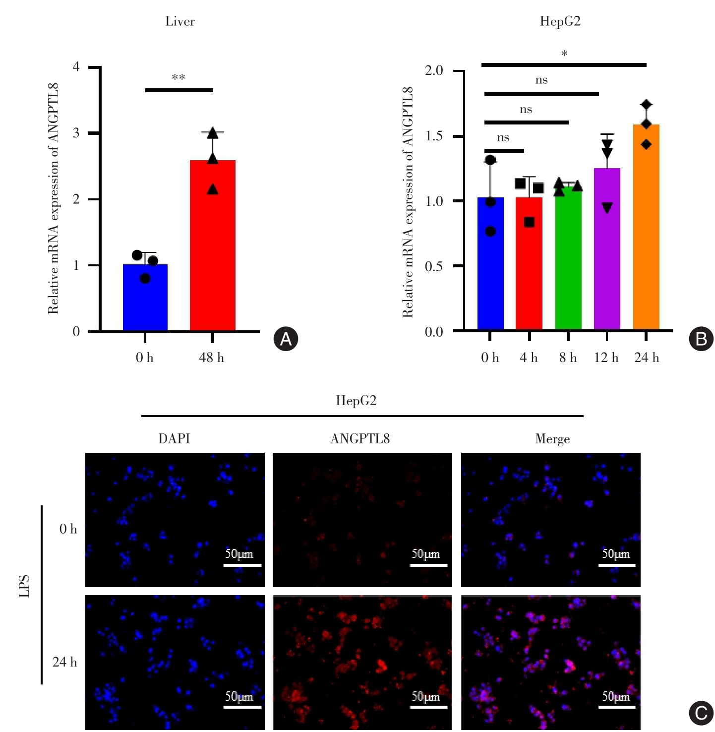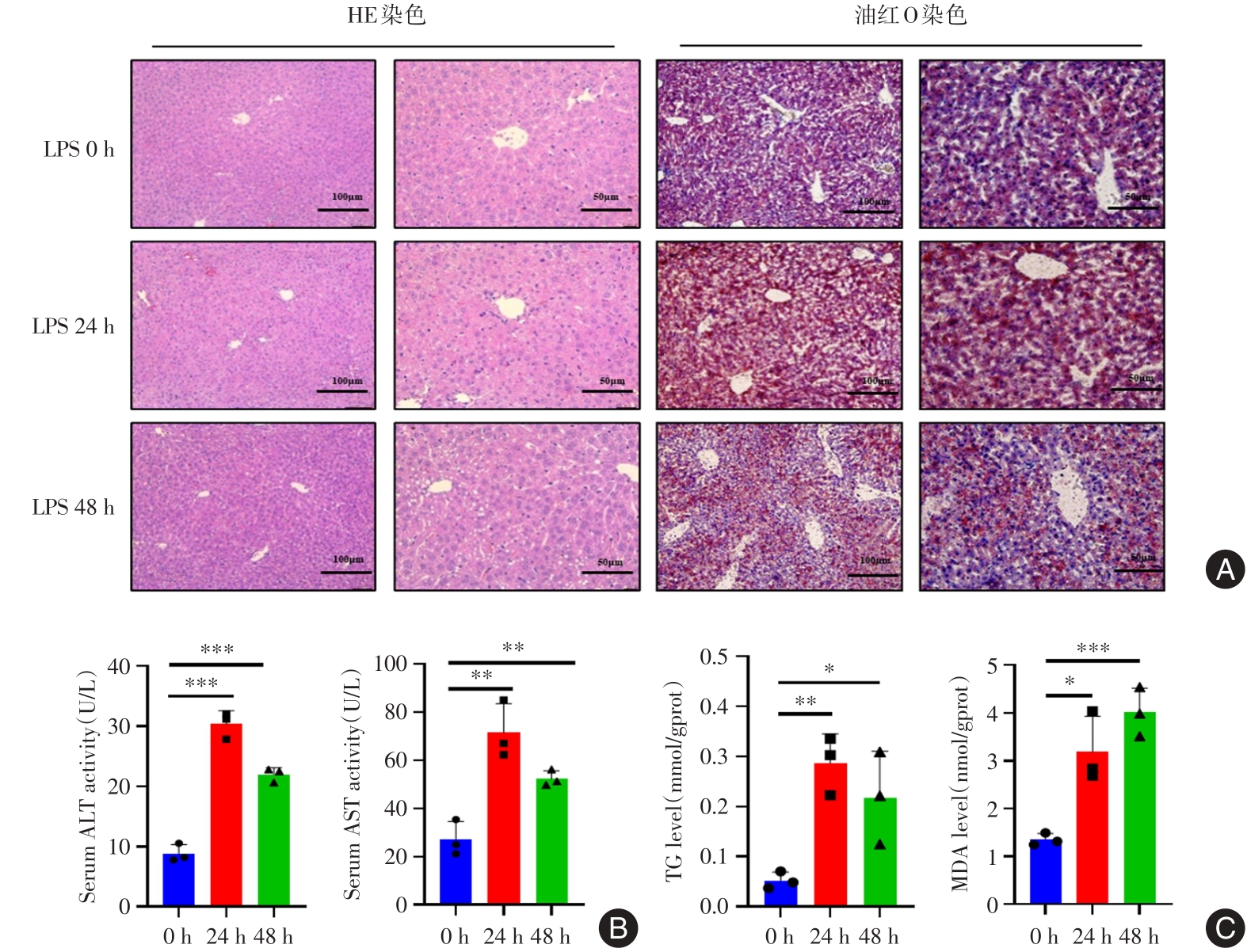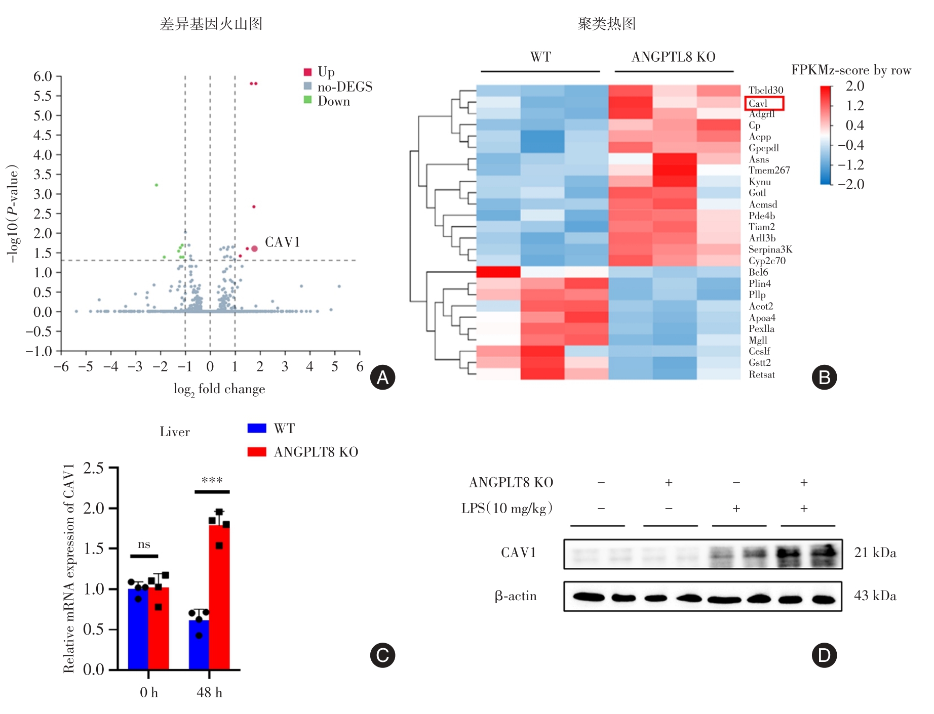 Objective To study the influence of ANGPTL8 in lipopolysaccharide (LPS)?induced hepatic lipid deposition. Methods Male wild?type(WT) and ANGPTL8 knockout mice at 6-8 weeks were used to induce sepsis models by intrabitoneal injection of LPS (10 mg/kg). qPCR and immunofluorescence were used to detected the mRNA and protein expression of ANGPTL8 in liver tissue and HepG2 cells respectively; The contents of alanine aminotransferase (ALT), aspartate aminotransferase (AST) in serum and the triglyceride (TG) and malondialdehyde (MDA) in liver homogenate were detected by kits; the histopathological changes of liver tissue were analyzed through HE staining. Lipids accumulation in liver were detected by oil red O staining. The apoptosis of liver was determinated by TUNEL staining. RNA?seq was used to analyzing the differentially expressed genes in the liver tissue of WT and ANGPTL8 KO mice, and the qPCR and Western Blot were used to verify the differential expressed genes. Results The expression of ANGPTL8 in the liver was significantly upregulated at 48 hours after LPS stimulation. Compared with WT mice, the hepatic lipid deposition, steatosis, and apoptosis were significantly alleviated in liver of ANGPTL8 KO mice, the ALT and AST levels in serum and the TG and MDA content in liver homogenate of ANGPTL8 KO mice were also reduced significantly. The expression of caveolin?1(CAV1) in liver of ANGPTL8 KO mice was significantly higher than that of WT mice. Conclusions LPS promoted the expression and secretion of ANGPTL8 in liver tissue, and ANGPTL8 increased hepatic lipid deposition and peroxidation by inhibiting the expression of CAV1.