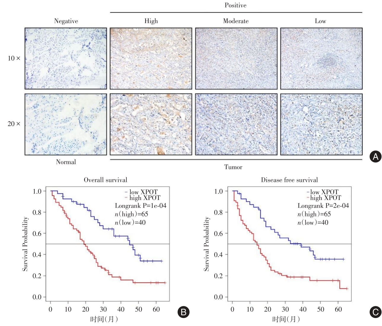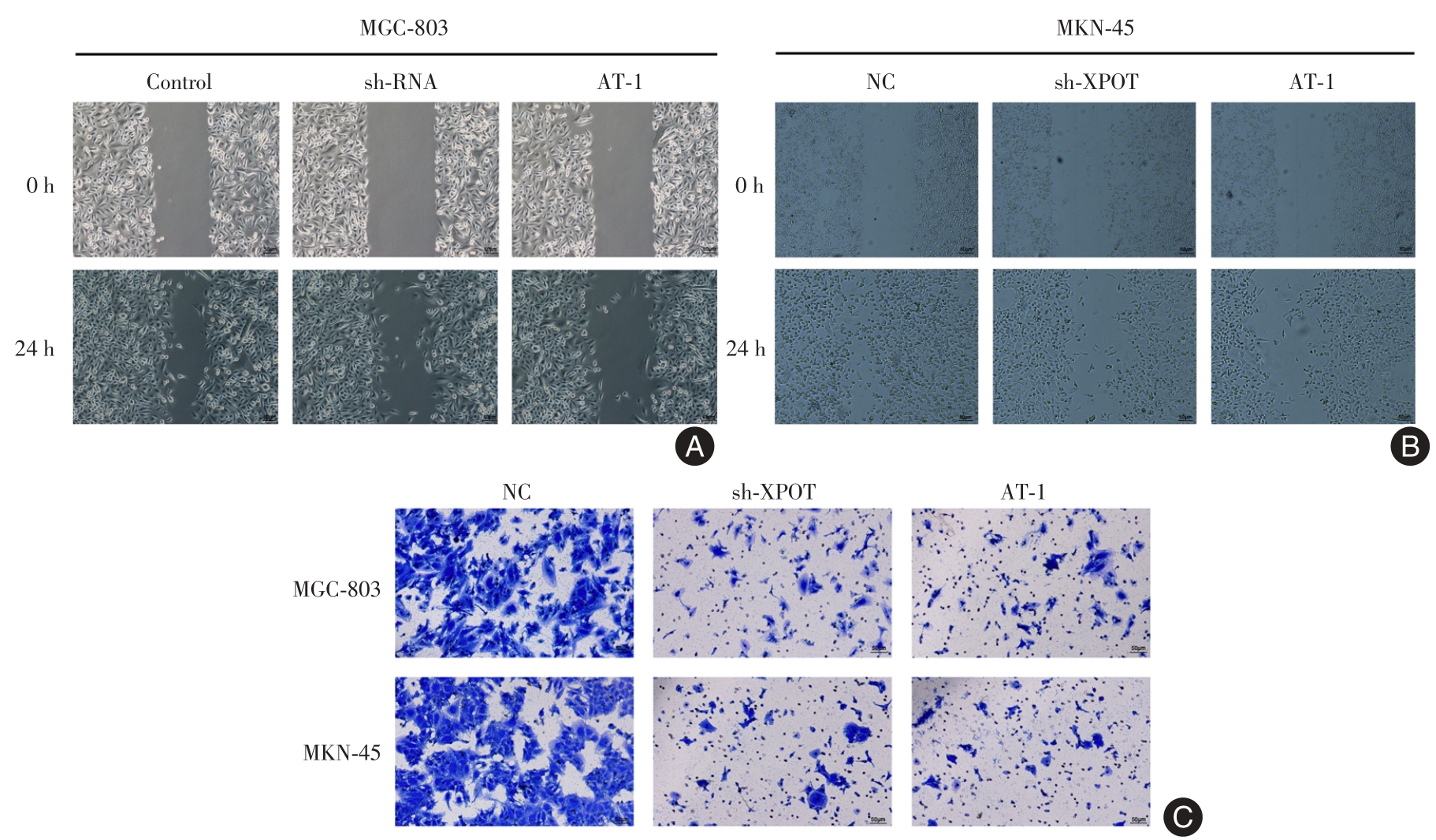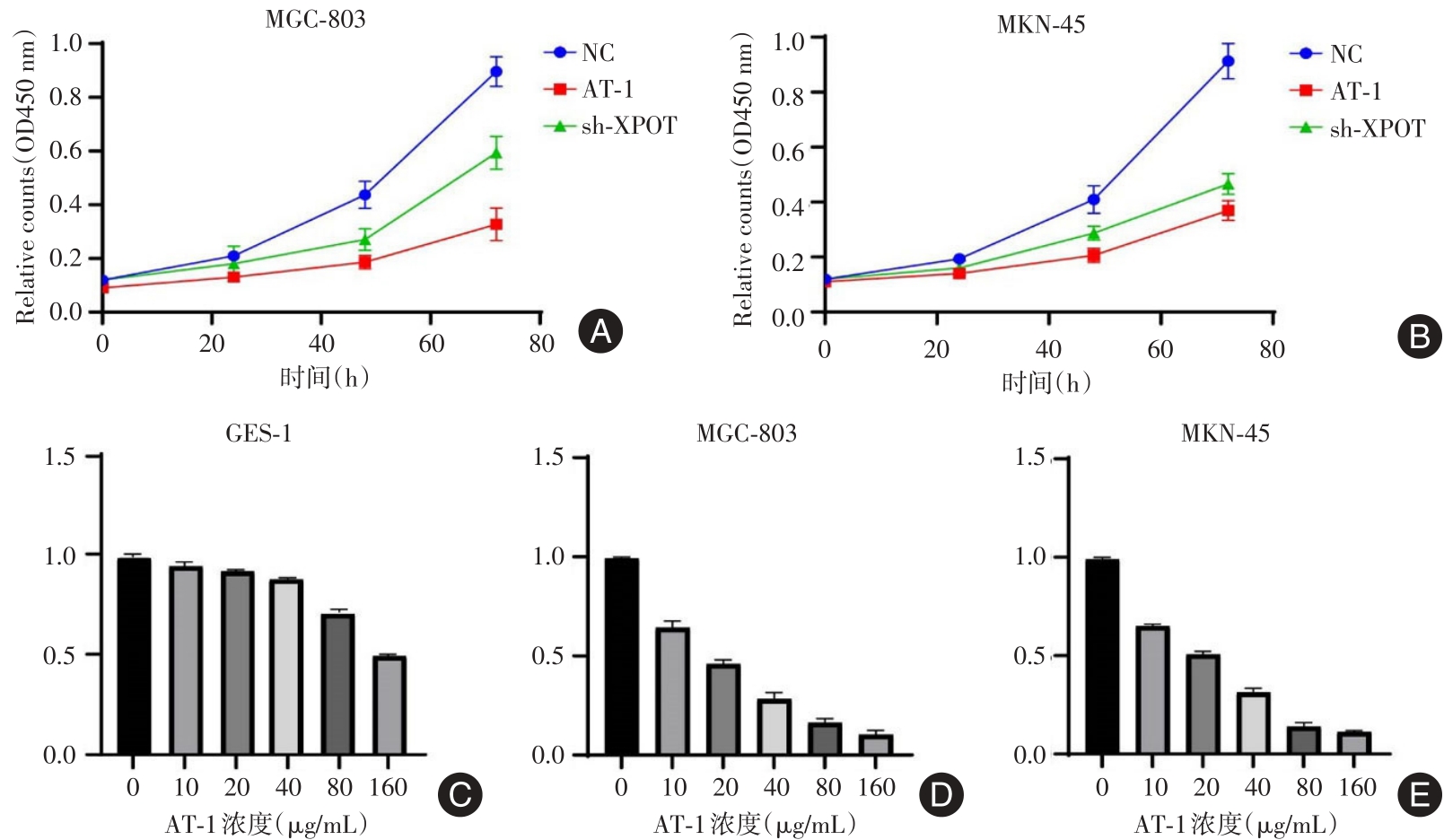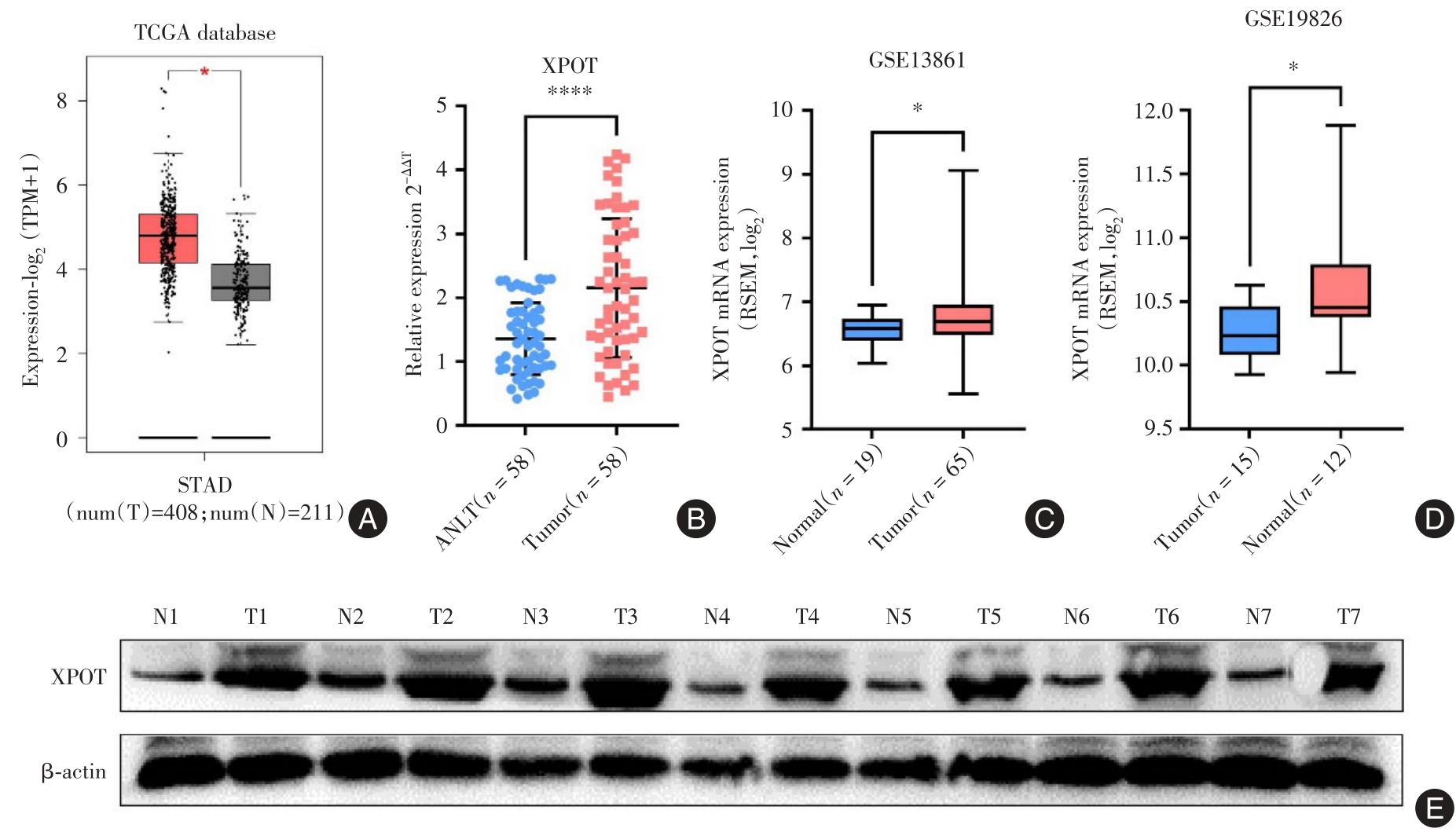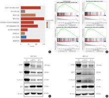 目的 探究白术内酯Ⅰ在胃癌细胞中抑制输出蛋白T(XPOT)的作用和机制。 方法 探究XPOT在胃癌组织中的表达情况。自安徽中医药大学第二附属医院脾胃科病例随访系统中随机调出具有完整临床病理及随访资料的胃癌病例105例,并获取对应的肿瘤组织和癌旁组织。应用免疫组化、qPCR和Western blot技术检测上述标本中XPOT表达情况。使用GSEA分析TCGA、GEO数据库中胃癌患者基因表达数据。通过多种细胞实验检测癌细胞的增殖、迁移、侵袭能力。并检测XPOT、SKP2、CyclinA、P27的mRNA的蛋白表达水平。 结果 生物信息学结果及临床样本均证实,XPOT在胃癌组织中表达高,提示不良预后;体外研究发现:AT-1可抑制胃癌细胞的增殖、侵袭能力;XPOT下调可抑制胃癌细胞的增殖、侵袭能力;AT-1可下调XPOT表达,继而对SKP2、P27、CyclinA进行调控,即通过调控XPOT途径,抑制胃癌细胞的增殖和侵袭。 结论 胃癌组织中XPOT过表达可提示患者预后不良。白术内酯Ⅰ可下调XPOT调控泛素化-蛋白酶体途径抑制胃癌细胞的增殖及侵袭。