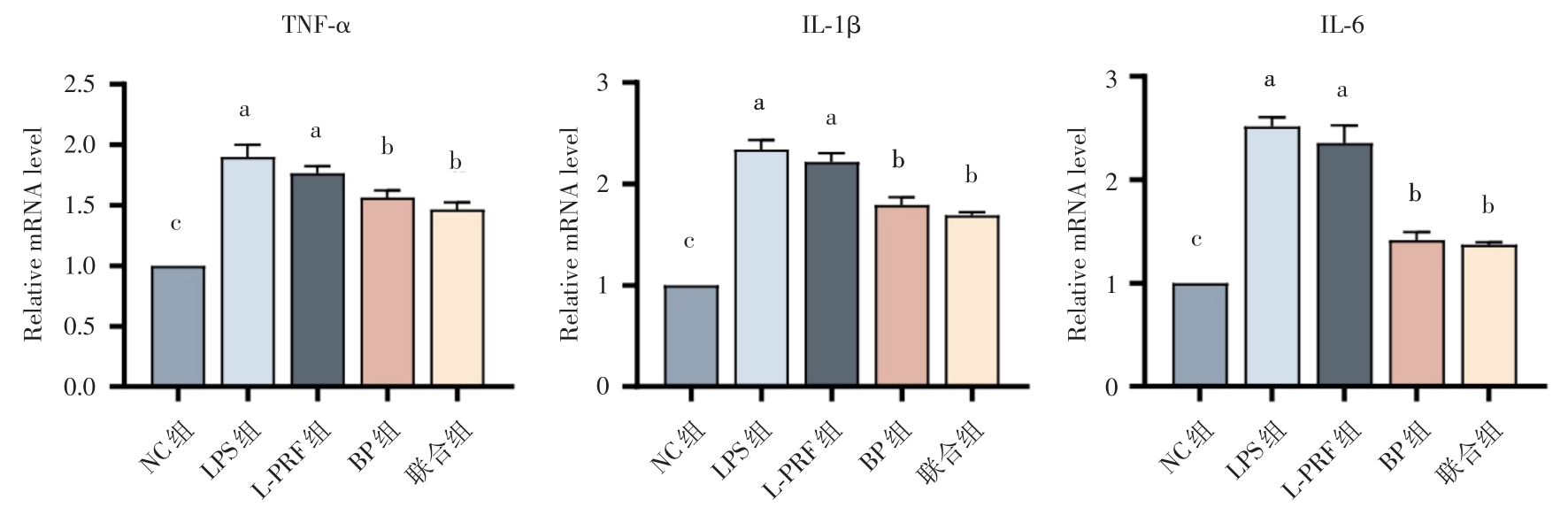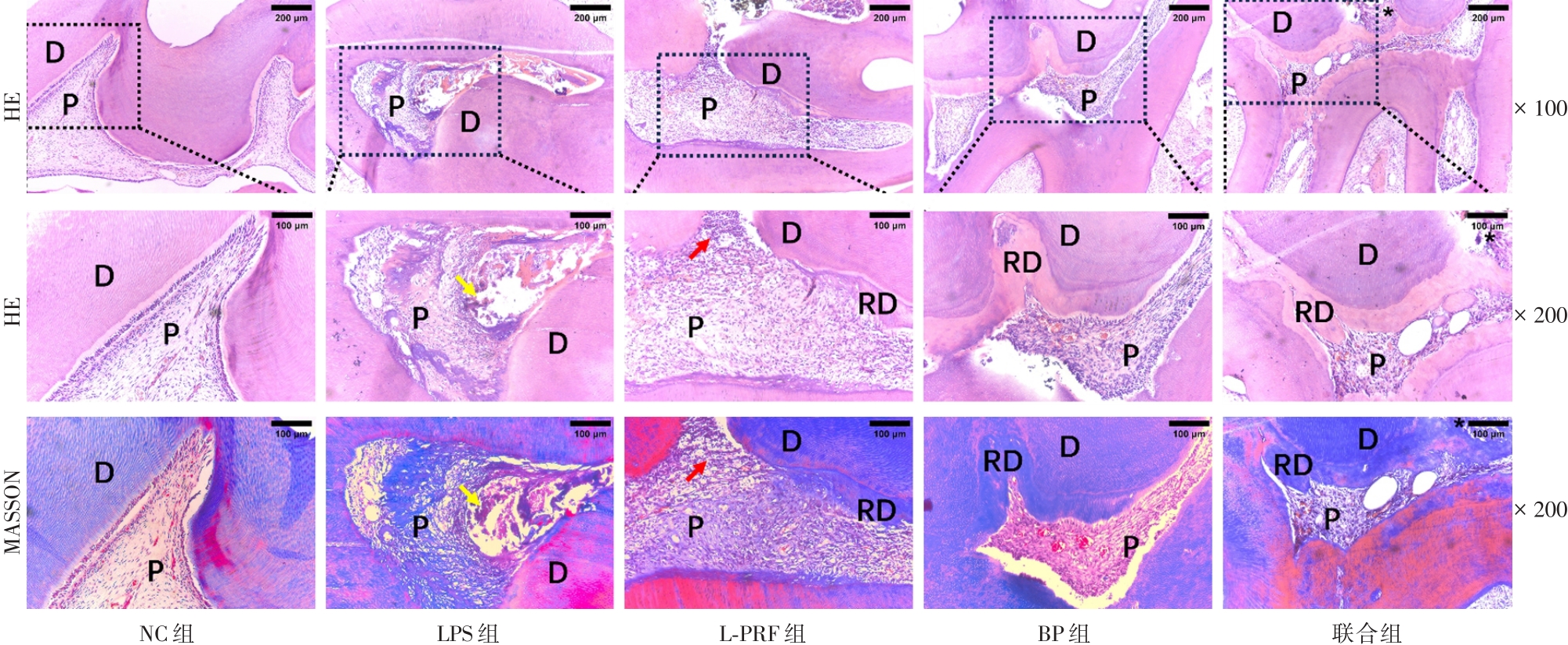 目的 探讨富白细胞-血小板纤维蛋白(leukocyte-and platelet-rich fibrin, L-PRF)作为盖髓剂对大鼠牙髓炎症调节的作用。 方法 脂多糖(LPS)构建牙髓炎大鼠模型,30只大鼠随机分成5组,即正常对照组、LPS造模组、iRoot BP PLUS组、L-PRF组、L-PRF + iRoot BP PLUS组。直接盖髓14 d后取标本行显微CT(Micro-CT)扫描、苏木精-伊红(HE)及Masson染色、定量实时聚合酶链式反应(qRT-PCR)检测,观察牙髓炎症及硬组织形成程度。 结果 Micro-CT示:LPS组未见硬组织形成,L-PRF组冠髓内可见斑块状钙化物,BP组及联合组在穿髓孔处见较完整的钙化桥。组织学染色示:LPS组炎症最重、无硬组织形成;联合组炎症最轻,硬组织形成最完整、连续,两组差异有统计学意义(P < 0.01);BP组与联合组的炎症及硬组织形成程度均差异无统计学意义(P > 0.05)。qRT-PCR结果示:各实验组牙髓组织中TNF-α、IL-1β、IL-6 mRNA相对表达水平相较于LPS组均有所降低,但L-PRF组与LPS组的差异无统计学意义(P > 0.05)。 结论 L-PRF联合iRoot BP PLUS作为复合盖髓材料,可用于大鼠牙髓炎牙髓组织修复以及牙髓炎症调节。