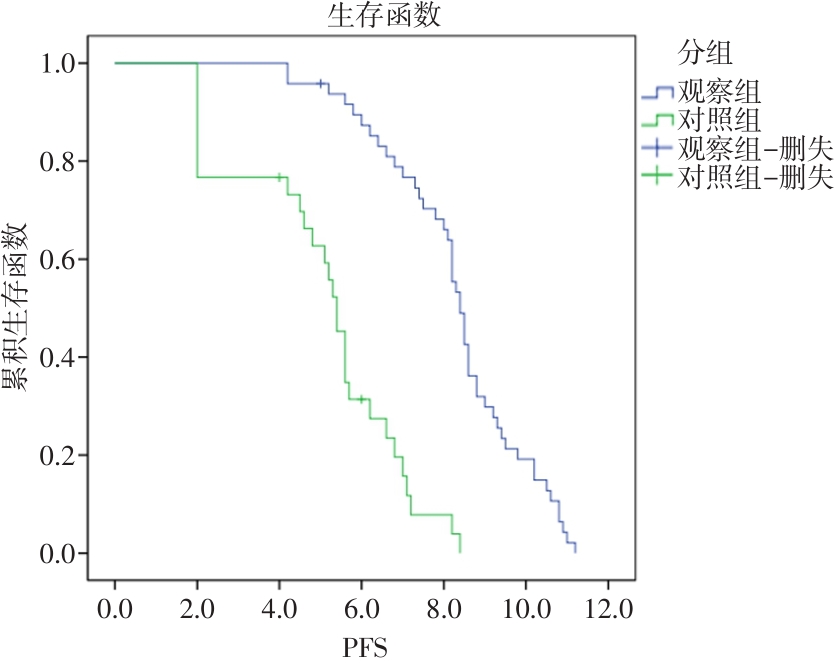目的 探讨外周血循环肿瘤DNA预测晚期非小细胞肺癌(NSCLC)免疫治疗疗效及预后的价值。 方法 对2021年1-12月收治于河北北方学院附属第一医院呼吸与危重症医学科住院的78例晚期驱动基因阴性使用替雷利珠单抗治疗的NSCLC患者进行前瞻性研究,免疫治疗2周期后按照实体瘤疗效评价标准(RECIST1.1)评价疗效,包括完全缓解(CR)、部分缓解(PR)、疾病稳定及疾病进展,将CR和PR患者定义为观察组(n = 48),其他患者被定义为对照组(n = 30),测定两组患者治疗前后外周血中ctDNA水平,采用ROC曲线分析外周血ctDNA水平对于免疫治疗后达客观缓解的预测价值。对所有患者进行随访,统计其无进展生存期,采用单因素及多因素回归分析免疫治疗后患者预后的影响因素,采用Spearman相关系数对ctDNA水平与PFS进行相关性分析,采用 Kalplan-Meier 生存曲线进行生存分析。 结果 观察组治疗前后外周血ctDNA水平分别为(4.47 ± 1.21)、(2.65 ± 1.14)ng/μL(t = 7.559,P < 0.001),对照组治疗前后外周血ctDNA水平为(4.54 ± 1.15)、(4.29 ± 1.57)ng/μL(t = 0.699,P = 0.487),两组患者在治疗前外周血ctDNA水平差异无统计学意义(t = -0.25,P = 0.801),观察组治疗后外周血ctDNA水平较对照组下降(t = -5.35,P < 0.001)。ROC曲线分析外周血ctDNA水平预测免疫治疗后达客观缓解的曲线下面积为0.819,预测的敏感性度81.3%,特异度为80%,外周血ctDNA水平与患者无进展生存期(PFS)呈负相关(r = -0.784,P < 0.001),采用单因素Cox回归对入组患者的临床病理特征及ctDNA水平进行分析,结果显示肿瘤最大径> 5 cm(HR = 0.501,95%CI:0.282 ~ 0.890)、肿瘤Ⅳ期(HR = 0.392,95%CI:0.227 ~ 0.677)、治疗方式(HR = 15.473,95%CI:6.731 ~ 35.567)及ctDNA水平(HR = 4.567,95%CI:3.182 ~ 6.555)均为晚期NSCLC患者免疫治疗后PFS的影响因素,再将有统计学差异的上述指标进行多因素分析,结果显示:治疗方式(HR = 2.981,95%CI:1.019 ~ 8.722)及外周血ctDNA水平(HR = 3.918,95%CI:2.619 ~ 5.861)是晚期NSCLC患者PFS的独立影响因素,采用Kalplan-Meier生存曲线进行分析,结果显示观察组的中位PFS为8.4个月,对照组的中位PFS为5.4个月,差异有统计学意义(χ 2 = 46.828,P = 0.000)。 结论 免疫联合化疗可增强杀伤肿瘤细胞的能力,外周血ctDNA水平可评估免疫治疗的疗效及预后,可用于指导晚期NSCLC患者的免疫治疗。