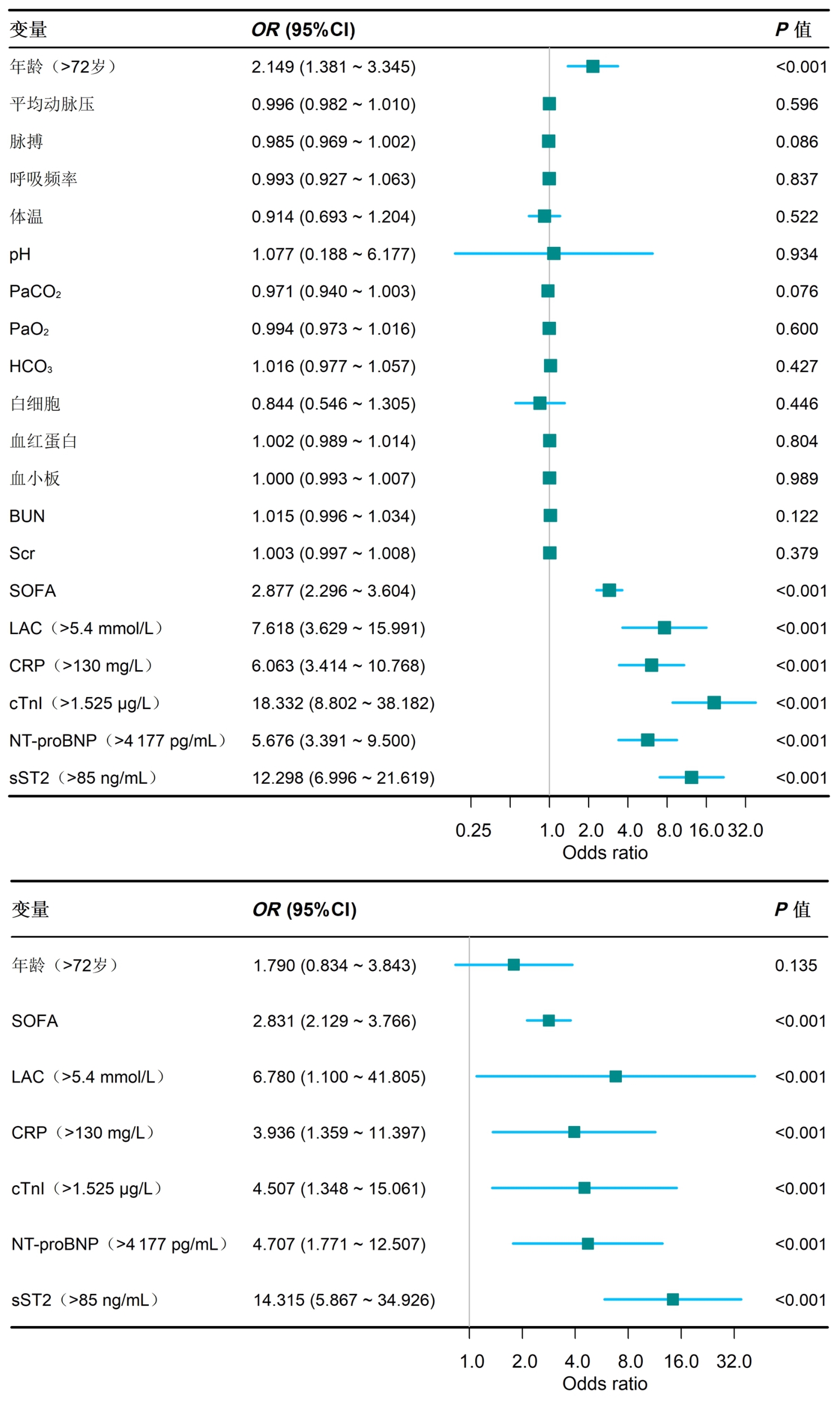 目的 研究可溶性生长刺激表达基因2蛋白(soluble growth?stimulated expressed gene 2 protein, sST2)对脓毒症相关急性肾损伤(sepsis?associated acute kidney injury,SA?AKI)的预测价值。 方法 采用回顾性观察性研究,纳入2020年1月至2023年12月在南通大学附属医院急诊科接受sST2检测的395例脓毒症患者。根据是否发生急性肾损伤(AKI),分为非AKI组(281例)和AKI组(114例)。收集患者入院24 h内的基础临床数据和实验室检查结果,通过受试者工作特征(ROC)曲线分析sST2对SA?AKI的诊断能力,logistic回归评估sST2是否为SA?AKI发生的独立危险因素,通过构建两预测模型,使用ROC曲线下面积(AUC)、净重新分类指数(NRI)、综合判别改善指数(IDI)评估sST2的加入对模型预测能力的提升效果。 结果 AKI组患者sST2水平高于非AKI组(P < 0.001)。sST2诊断SA?AKI的AUC为0.839(0.799 ~ 0.874),显著高于其他实验室指标(P < 0.000 1)。sST2 > 85 ng/mL是SA?AKI的独立危险因素(OR = 14.315,95% CI:5.867 ~ 34.926,P < 0.001)。增加sST2显著改善了预测模型的AUC(0.954 vs. 0.909,P < 0.000 1)、NRI(21.48%,95% CI:11.48% ~ 31.49%,P < 0.000 1)及IDI(8.62%,95% CI:5.75% ~ 11.49%,P < 0.000 1)。 结论 血清sST2可能成为潜在的预测脓毒症AKI发生的生物标志物。
