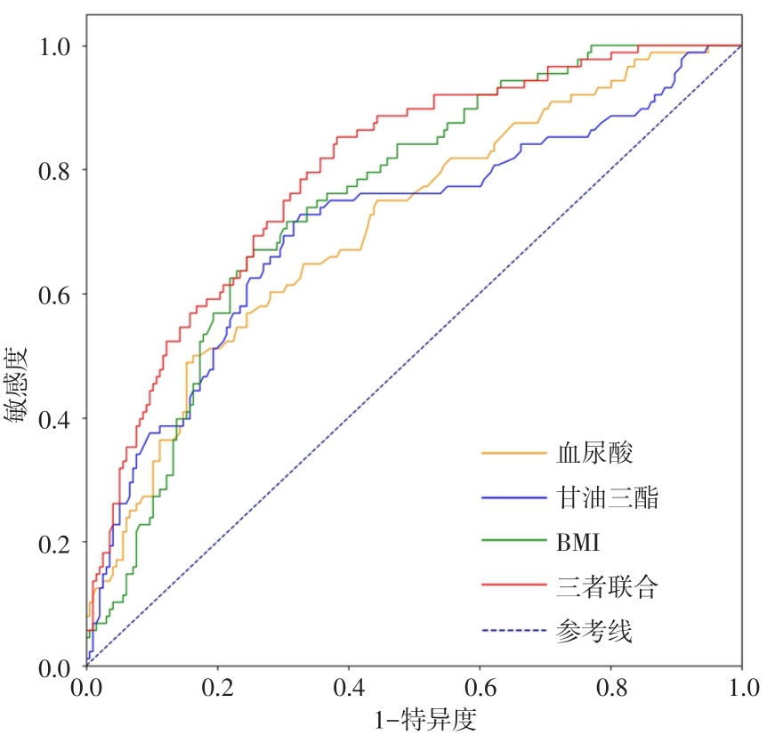 目的 探讨H型高血压患者血尿酸(serum uric acid,SUA)水平与非酒精性脂肪性肝病(non-alcoholic fatty liver disease,NAFLD)的关系。 方法 回顾性研究,收集2022—2023年在延安大学咸阳医院心血管内科住院的H型高血压患者共284例,根据是否患有NAFLD,分为合并NAFLD组88例和正常组196例。比较两组患者一般资料及实验室指标,采用多因素logistic回归分析H型高血压患者发生NAFLD的影响因素,进一步绘制ROC曲线观察SUA预测NAFLD的作用,并根据约登指数最大值选取最佳截断值。 结果 合并NAFLD组患者BMI、收缩压(systolic blood pressure, SBP)、舒张压(diastolic blood pressure,DBP)、总胆固醇(total cholesterol,TC)、甘油三酯(triglycerides,TG)、低密度脂蛋白胆固醇(low-density lipoprotein cholesterol, LDL-C)、SUA、γ-谷氨酰转肽酶(γ- Glutamyl transpeptidase,γ-GT)及谷丙转氨酶(alanine aminotransferase, ALT)水平均高于正常组,而年龄、高密度脂蛋白胆固醇(high-density lipoprotein cholesterol,HDL-C)低于正常组(P < 0.05)。多因素logistic回归分析结果显示,BMI(OR= 1.173,95%CI:1.066 ~ 1.291)、UA(OR= 1.005,95%CI:1.001 ~ 1.010)、TG(OR= 1.929,95%CI:1.042 ~ 3.574)水平升高是H型高血压患者发生NAFLD的危险因素(P < 0.05)。ROC曲线示SUA、TG、BMI及三者联合的曲线下面积(AUC)分别为0.709、0.707、0.750、0.796。 结论 发生NAFLD的H型高血压患者BMI及SUA、TG水平均较无脂肪肝组患者高,SUA水平升高是H型高血压患者发生NAFLD的危险因素,且SUA水平超过337 μmol/L对预测NAFLD有重要价值。