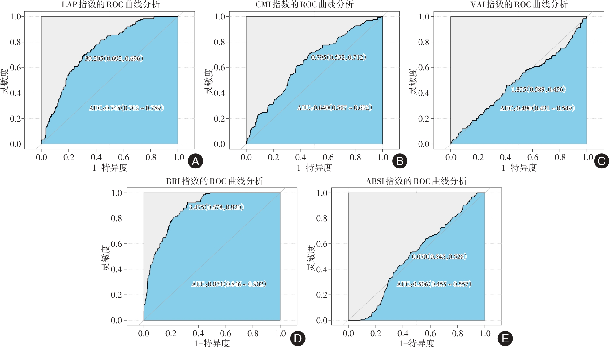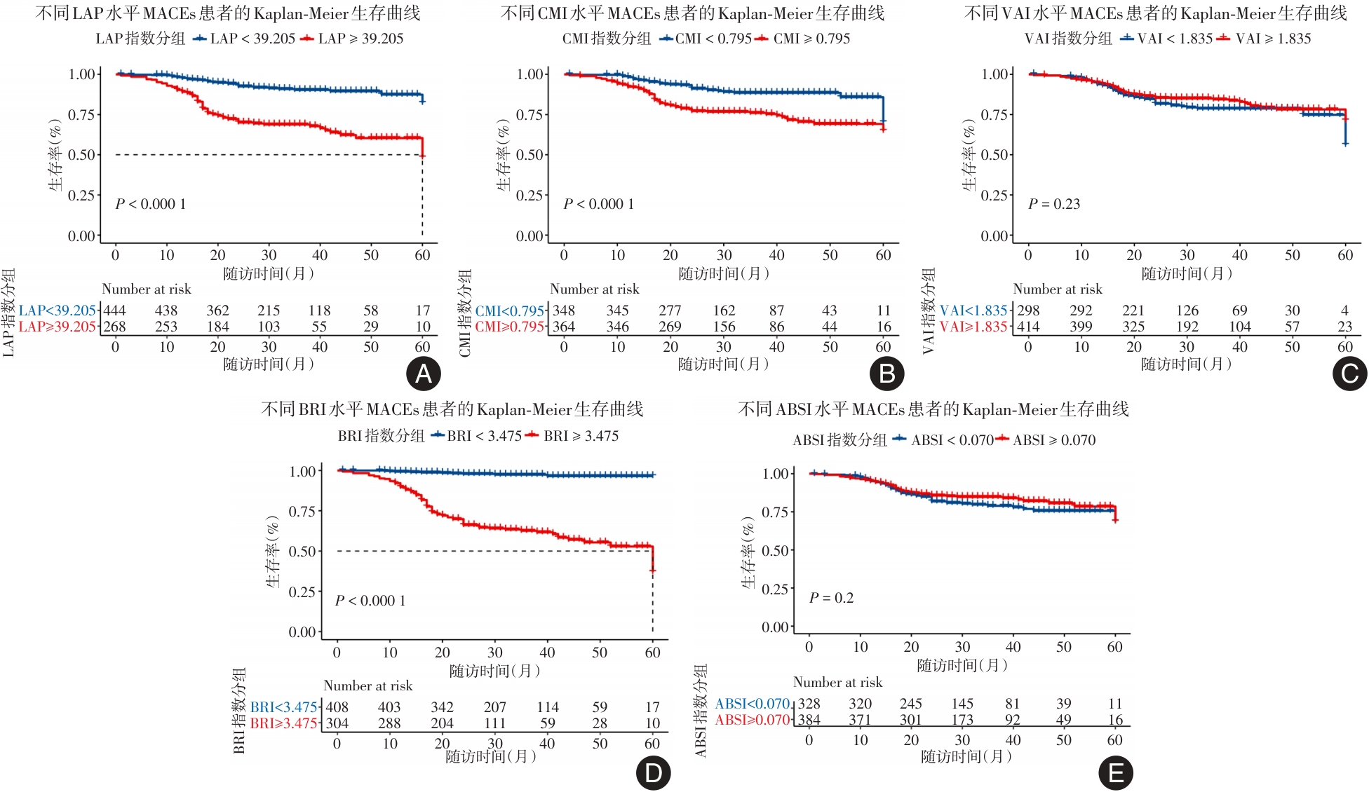 目的 探讨新型人体测量学指标对急性心肌梗死(AMI)患者长期预后的预测价值。 方法 连续纳入2018年1月至2019年12月期间就诊于新疆维吾尔自治区人民医院明确诊断为AMI的712例患者作为研究对象,根据随访期间是否发生主要心血管不良事件(MACEs)分为事件组和非事件组。Gensini评分用以定量评估冠脉病变程度,Spearman相关性分析探讨新型人体测量学指标与Gensini评分的相关性;受试者工作特征(ROC)曲线评估新型人体测量学指标对MACEs的预测能力,依据最佳截断值分组,Kaplan-Meier曲线分析组间生存差异;多因素Cox回归模型分析MACEs发生的独立影响因素。 结果 中位随访时间27(20,39)个月,共有125例患者发生MACEs,与非事件组患者相比,事件组患者合并高血压、糖尿病、腹型肥胖的比例更高,HbA1c和FBG水平更高,体质量及腰围较大,LAP指数、CMI指数、BRI指数及Gensini评分明显升高(P ? 0.05);Spearman相关性分析显示:LAP指数、CMI指数及BRI指数与Gensini评分呈正相关(r = 0.233、0.126、0.272,P < 0.001);ROC曲线分析结果显示:LAP指数、CMI指数、VAI指数、BRI指数及ABSI指数的AUC分别为0.745、0.640、0.490、0.874、0.506;Kaplan-Meier曲线分析结果显示:LAP指数、CMI指数和BRI指数高值组患者MACEs累积发生率显著增加(Log-rank test,P ? 0.05);调整混杂后多因素Cox 回归分析结果显示:CMI指数(HR = 1.430, 95%CI: 1.049 ~ 1.952, P = 0.024)和BRI指数(HR