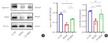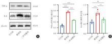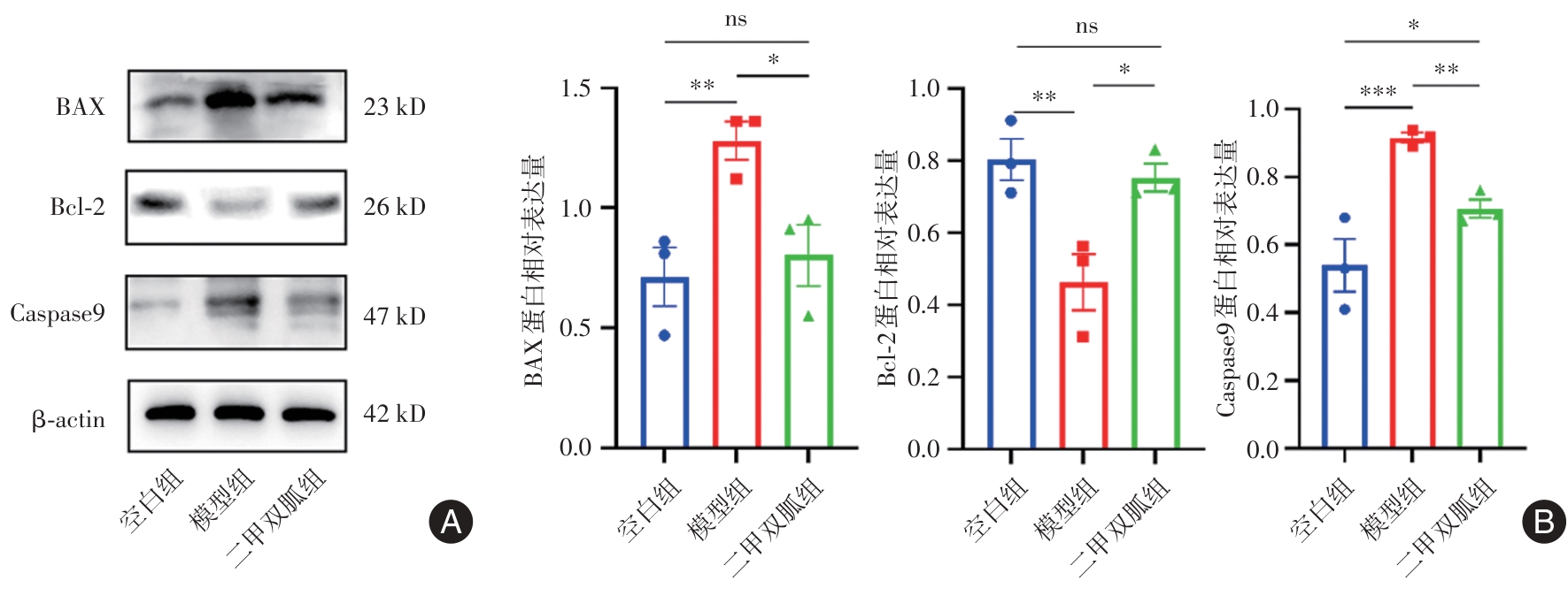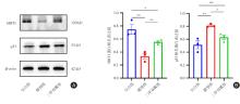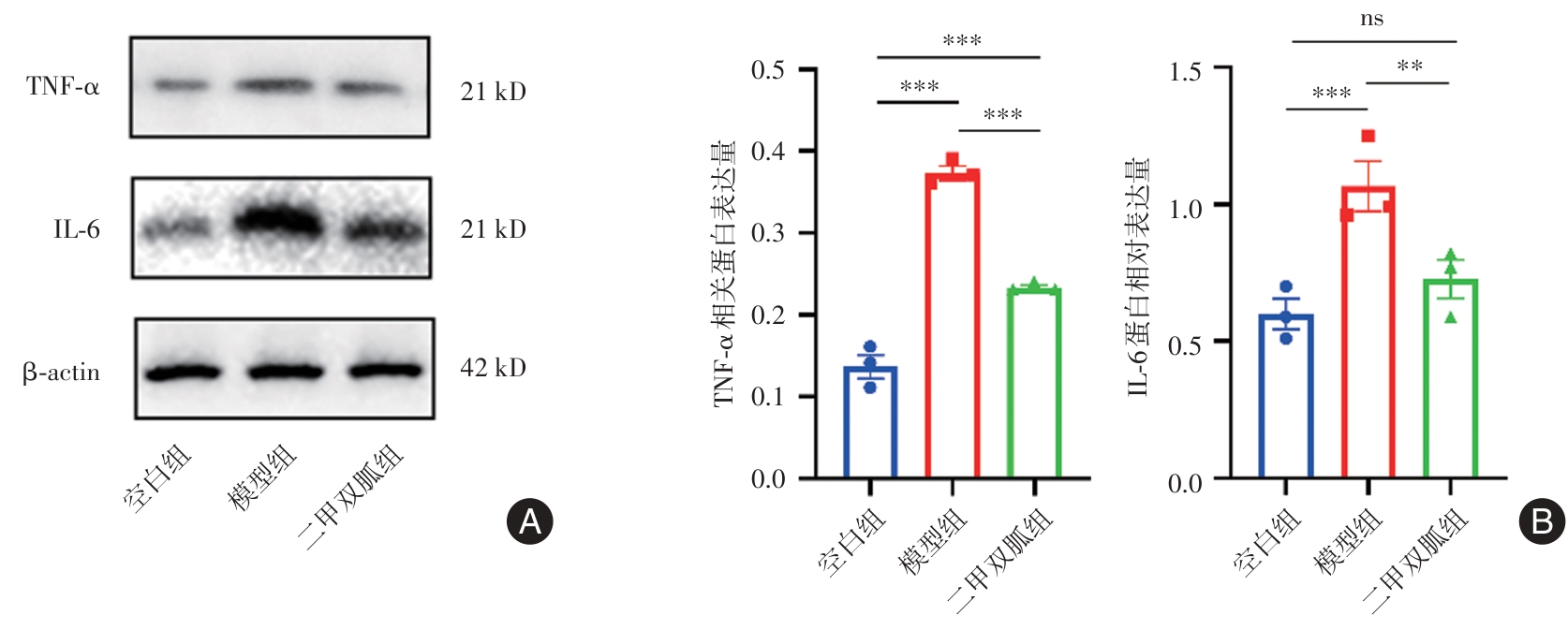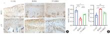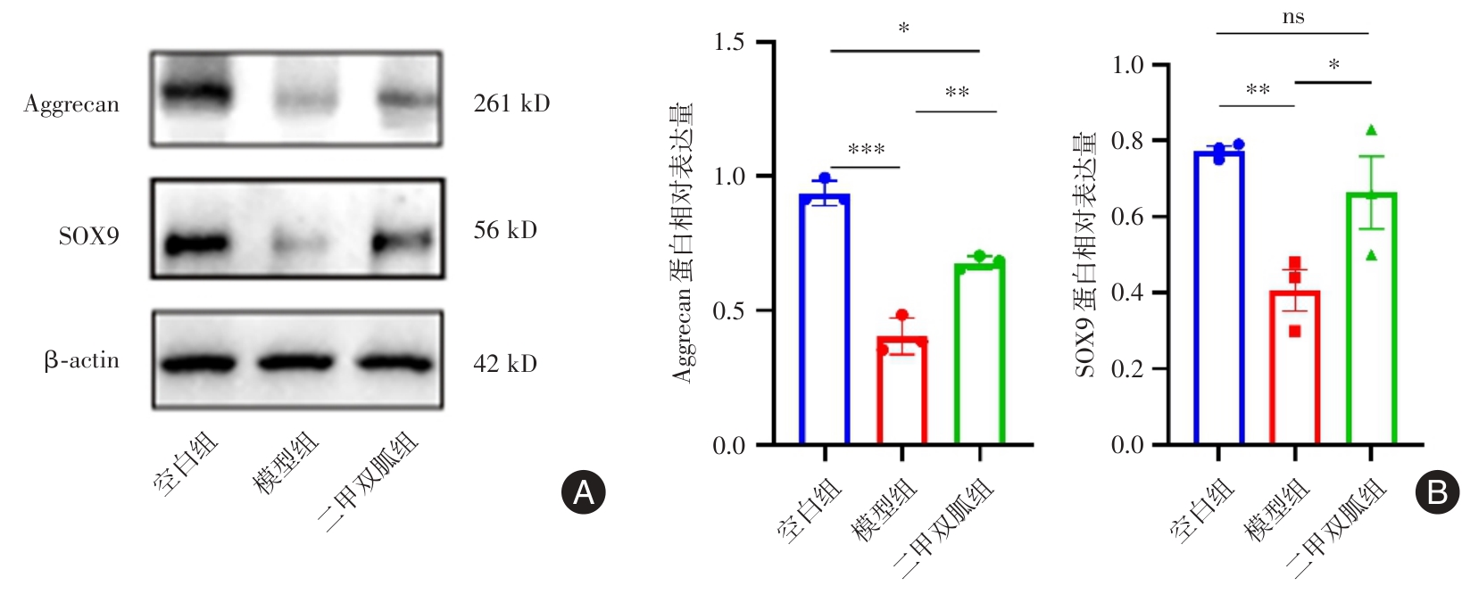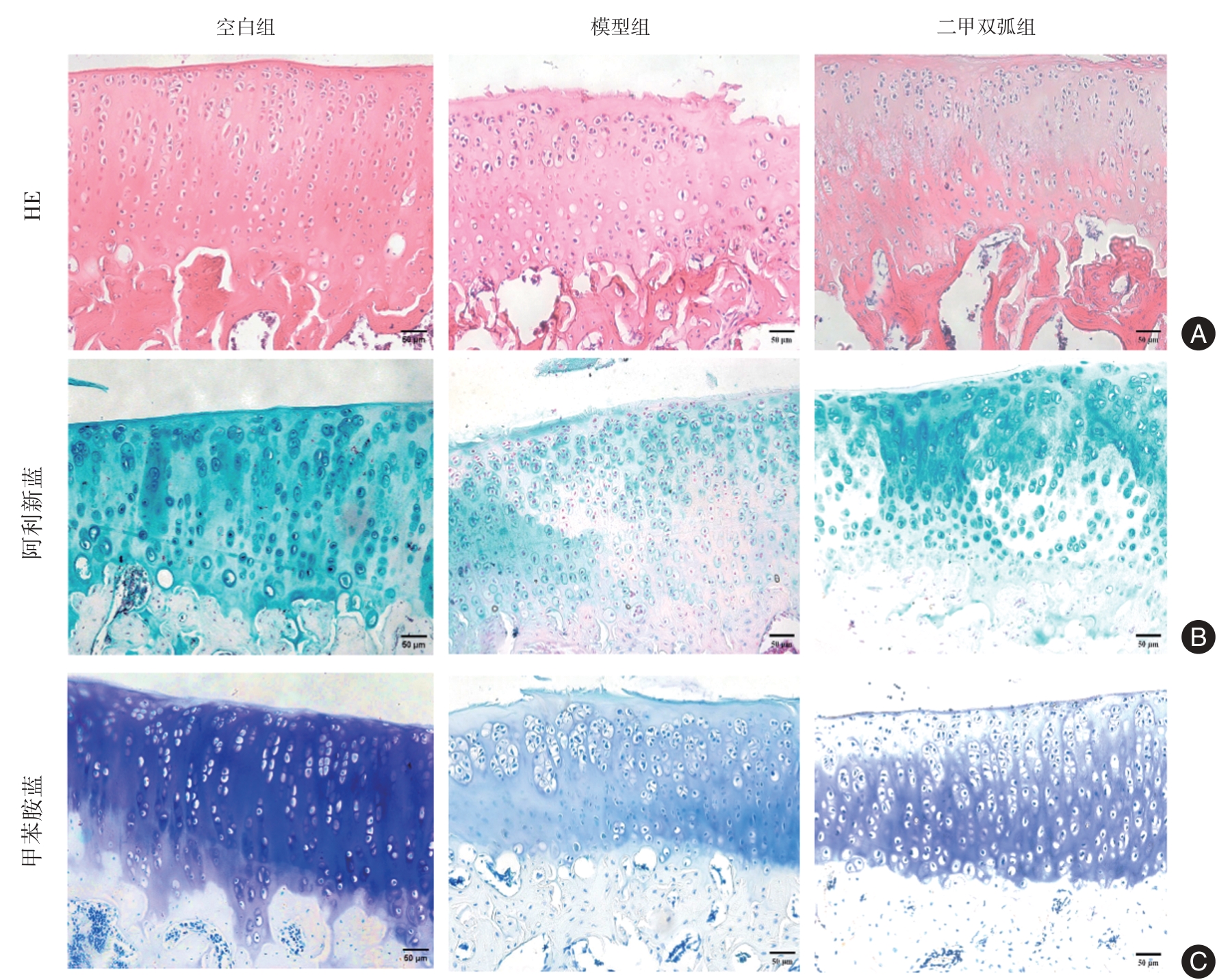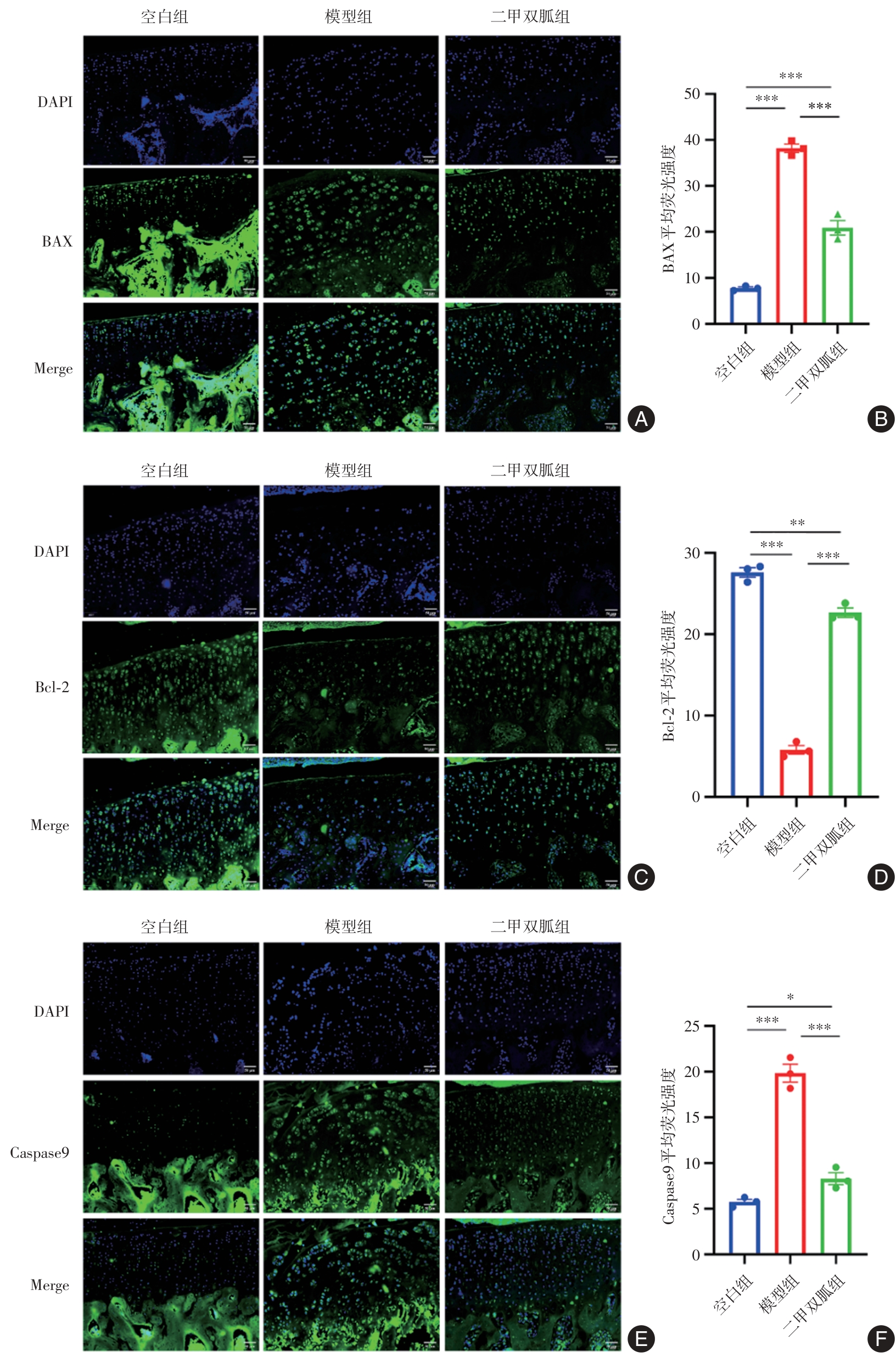 目的 探究二甲双胍对骨关节炎大鼠软骨保护作用机制。 方法 取30只雄性SD大鼠,随机分为3组 (10只/组) 。建立大鼠膝骨关节炎模型,二甲双胍组大鼠接受灌胃治疗[200 mg/(kg·d)],空白组和模型组大鼠给予生理盐水作为对照。4周后,采用形态学染色方法观察关节软骨形态,通过免疫组化染色、免疫荧光染色及Western blot检测SIRT1/p53信号通路因子、炎症及凋亡相关因子的表达。 结果 二甲双胍组大鼠较模型组软骨结构损伤明显减轻,软骨层面趋于平整,软骨细胞数目增多,蛋白多糖含量增加。免疫组化染色、免疫荧光染色和Western blot检测发现,二甲双胍组大鼠软骨组织中SOX9、Aggrecan、Bcl-2、SIRT1蛋白表达较模型组显著升高,而IL-6、TNF-α、BAX、Caspase-9、p53蛋白表达明显降低。TUNEL染色结果显示,与模型组比较,二甲双胍组大鼠软骨细胞凋亡数量明显减少。 结论 二甲双胍可通过SIRT1/p53信号通路的激活减少骨关节炎SD模型大鼠软骨细胞凋亡,抑制软骨细胞外基质降解,进而保护关节软骨。