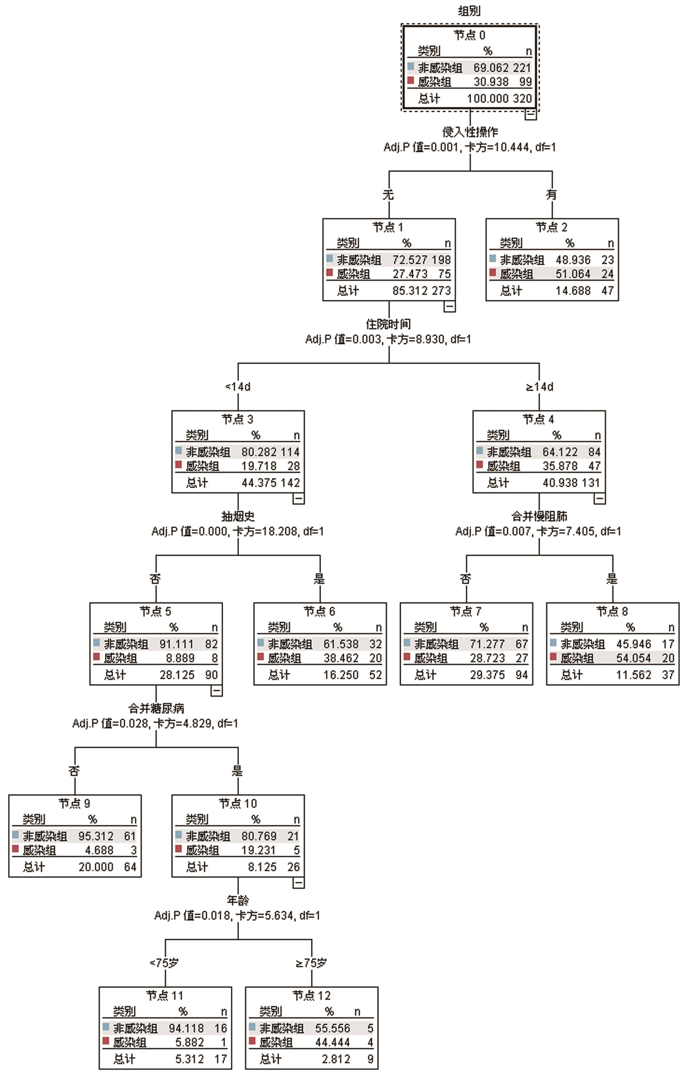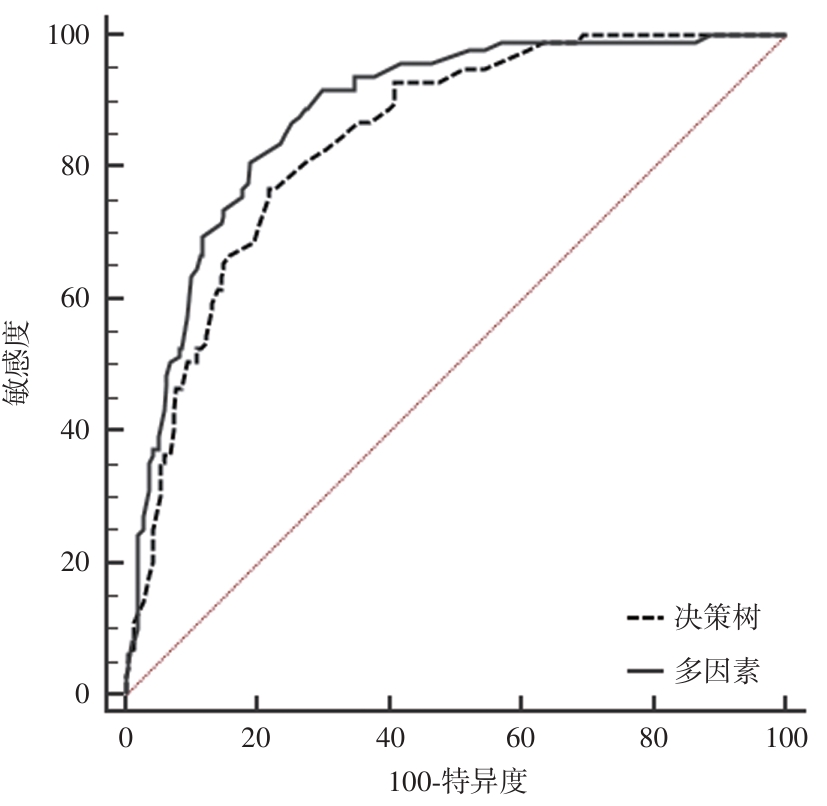 目的 分析老年左室射血分数降低型心力衰竭患者并发肺部感染的危险因素,并通过决策树CART算法建立老年左室射血分数降低型心力衰竭患者并发肺部感染的风险预警模型。 方法 回顾性选取2020年1月至2022年12月济南人民医院收治的320例老年左室射血分数降低型心力衰竭患者为研究对象,根据患者是否并发肺部感染将其分为感染组各非感染组,通过logistic回归模型和决策树CART模型构建预测老年左室射血分数降低型心力衰竭并发肺部感染的预测模型,采用5折交叉验证法进行内部验证,并对比模型的预测效能。 结果 320例老年左室射血分数降低型心力衰竭患者中,肺部感染发生率为30.94%。感染组和非感染组患者年龄、抽烟史、合并糖尿病、心功能分级、合并慢阻肺、侵入性操作、住院时间等资料对比差异有统计学意义(P < 0.05)。logistic回归分析结果显示,年龄≥75岁、抽烟史、合并糖尿病、心功能分级Ⅲ/Ⅳ级、合并慢阻肺、侵入性操作、住院时间≥ 14 d均是老年左室射血分数降低型心力衰竭患者并发肺部感染的独立危险因素(P < 0.05)。概率预测模型P = 1/[1+e-(-3.368+0.763*X1+0.814*X2+0.652*X3+1.085*X4+0.865*X5+1.027*X6+0.652*X7)],模型预测总体正确性为80.9%。Omnibus检验的结果显示P < 0.001。经过5折交叉验证,预测正确率为73.6%。决策树模型显示,有侵入性操作是老年左室射血分数降低型心力衰竭患者并发肺部感染最为重要的影响因素,信息增益为0.280。ROC结果显示,logistic回归模型的AUC值稍高于决策树(Z = 2.850,P = 0.004),两种模型的预测效能均为中等。 结论 年龄、抽烟史、合并糖尿病、心功能分级、合并慢阻肺、侵入性操作、住院时间均是老年左室射血分数降低型心力衰竭患者并发肺部感染的影响因素,本研究构建的决策树模型具有较好的风险预测效能,可为临床早期甄别及干预老年左室射血分数降低型心力衰竭患者临床治疗提供参考。