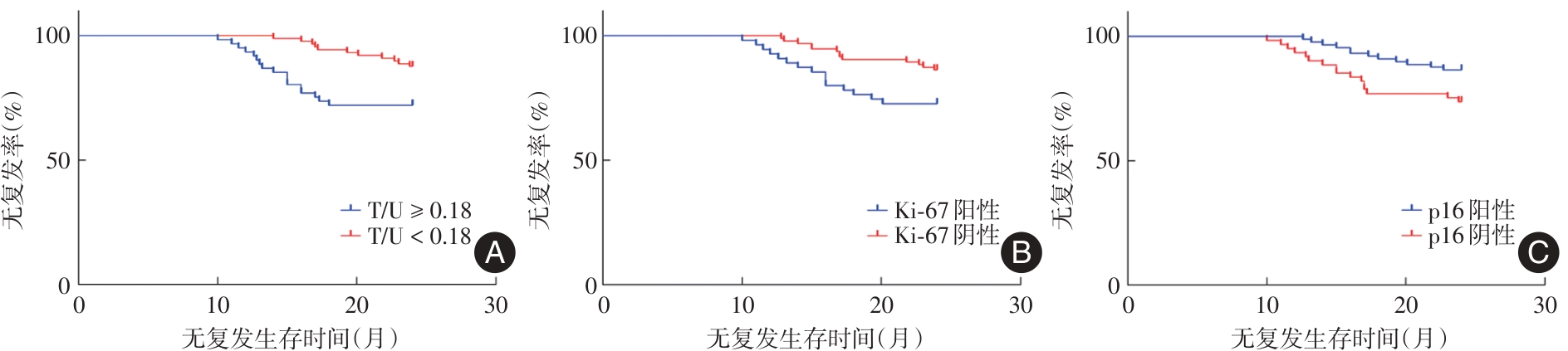 目的 探讨肿瘤病灶体积与子宫体积比值(T/U)、病灶组织中Ki-67蛋白、p16蛋白表达与子宫内膜癌病理学特征及复发的关系。 方法 选取经黔东南州人民医院病理学检查证实的150例子宫内膜癌患者进行随访观察,其中有28例患者随访2年后出现复发,122例患者未出现复发,对比两组患者手术时T/U及病灶组织中Ki-67蛋白、p16蛋白表达差异,并按照不同病理学特征分别对比上述指标,并对比不同T/U、Ki-67蛋白、p16蛋白表达患者的无复发生存时间差异。 结果 复发组患者的T/U值、Ki-67蛋白阳性表达率均显著高于非复发组,p16蛋白阳性表达率显著低于非复发组,差异有统计学意义(P < 0.05);T/U ≥ 0.18的子宫内膜癌患者中Ⅲ期患者占比、组织学低分化患者占比均显著高于T/U < 0.18的子宫内膜癌患者,差异有统计学意义(P < 0.05);Ki-67蛋白阳性表达的子宫内膜癌患者中Ⅲ期患者占比、组织学低分化患者占比、发生淋巴结转移的患者占比均显著高于Ki-67蛋白阴性表达的子宫内膜癌患者,差异有统计学意义(P < 0.05);p16蛋白阳性表达的子宫内膜癌患者中Ⅲ期患者占比、组织学低分化患者占比、发生淋巴结转移的患者占比均显著低于p16蛋白阴性表达的子宫内膜癌患者,差异有统计学意义(P < 0.05)。T/U ≥ 0.18的子宫内膜癌患者术后2年无复发生存时间短于T/U < 0.18的患者(χ2 = 6.962,P = 0.008);Ki-67阳性表达的子宫内膜癌患者术后2年无复发生存时间短于Ki-67阴性表达的患者(χ2 = 4.815,P = 0.028);p16蛋白阳性表达的子宫内膜癌患者术后2年无复发生存时间长于p16蛋白阴性表达的患者(χ2 = 4.279,P = 0.039)。FIGO分期为Ⅲ期、发生淋巴结转移、肌层浸润深度≥ 1/2、T/U值≥ 0.18、Ki-67蛋白阳性表达是子宫内膜癌手术后复发的危险因素(P < 0.05);p16蛋白阳性表达是子宫内膜癌手术后复发的保护性因素(P < 0.05)。 结论 子宫内膜癌患者T/U、Ki-67蛋白和p16蛋白表达与肿瘤发生发展有一定的关系,可能会增大患者手术后复发的风险。