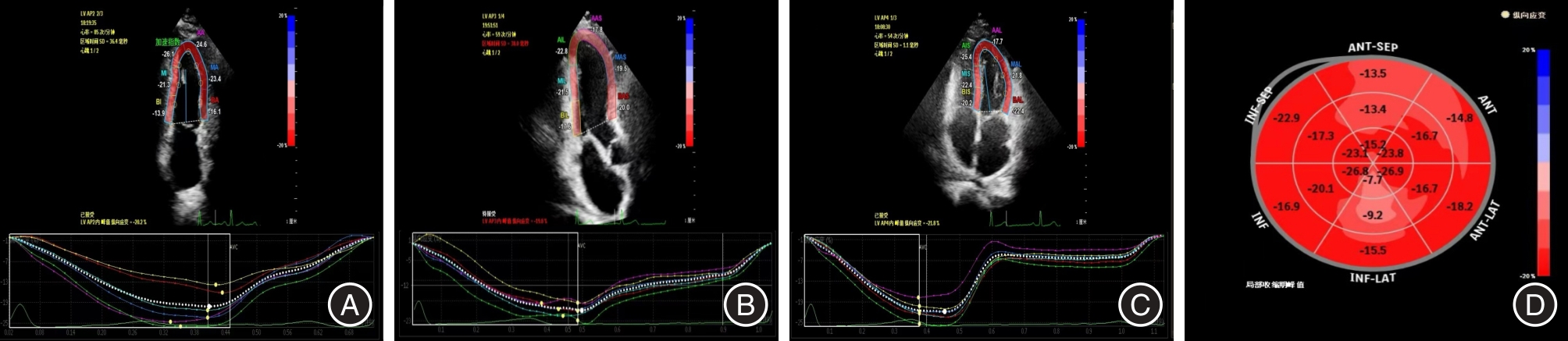目的 应用自动心肌运动定量技术(aCMQ)评价2型糖尿病(T2DM)合并肾功能不全(CKD)患者的左室收缩功能并探讨其与临床生化指标的相关性。 方法 纳入80例T2DM患者,分为DM组(不合并CKD,n = 40)和DN组(合并CKD,n = 40),另外选取40例健康志愿者作为对照组,记录所有受试者的一般临床资料,并且行常规超声心动图和aCMQ技术检查,获取常规超声测量值和 aCMQ相关参数。 结果 aCMQ相关参数比较:三组左室整体纵向应变(LVGLS)、左室心尖两腔心纵向应变(LVAP2LS)、左室心尖三腔心纵向应变(LVAP3LS)、左室心尖四腔心纵向应变(LVAP4LS)差异均有统计学意义(P < 0.05)。DN组左室整体环向应变(LVGCS)与另外两组相比差异均有统计学意义(P < 0.05)。左室短轴基底段环向应变(LVSAXBCS)、左室短轴中间段环向应变(LVSAXMCS)、左室短轴心尖段环向应变(LVSAXACS)差异均无统计学意义(P > 0.05)。左室应变参数与高敏C反应蛋白(hs-CRP)、糖化白蛋白(GA)、糖化血红蛋白、肌酐、尿素及尿酸呈负相关,而与肾小球滤过率(eGFR)呈正相关。其中hs-CRP、GA和eGFR与左室应变参数之间有较好的相关性。 结论 aCMQ技术可早期发现T2DM合并CKD患者左室功能的恶化,通过左室应变参数与hs- CRP、GA和eGFR的相关性有助于更好地评估其心脏受累情况。
