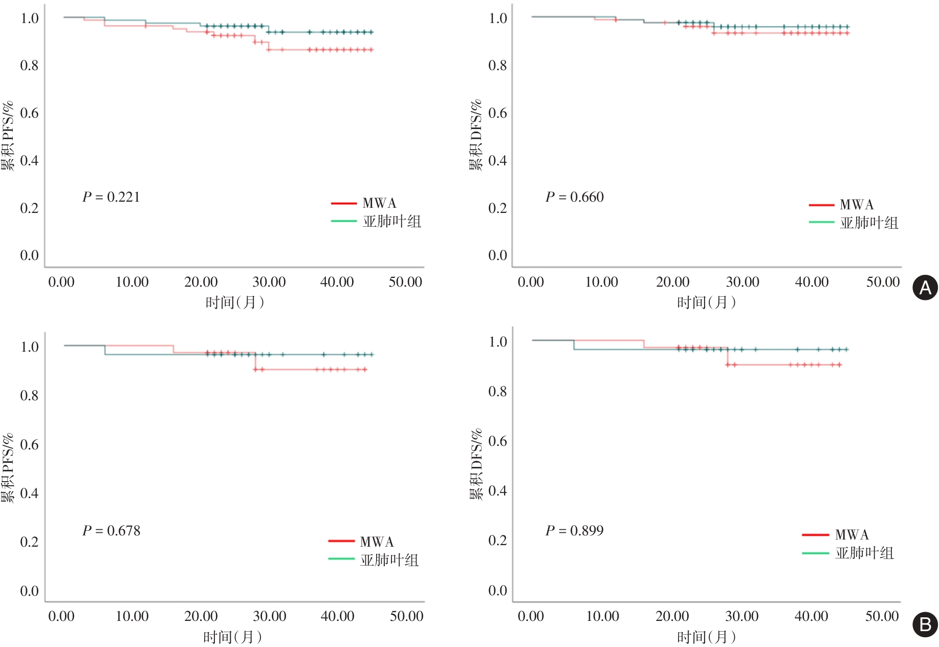 目的 旨在比较微波消融(MWA)和亚肺叶切除术治疗ⅠA期非小细胞肺癌(NSCLC)的临床疗效和并发症。 方法 回顾性收集2021年1月至2022年12月在云南省肿瘤医院治疗的ⅠA1-ⅠA3期NSCLC患者的资料。通过倾向评分匹配,共筛选出82例接受MWA的患者和 82例接受亚肺叶切除的患者。比较两组围手术期情况、近期疗效及并发症情况。监测评估无进展生存期(PFS)和无病生存期(DFS)。 结果 与亚肺叶切除组相比,MWA组手术时间短、术中失血量少、术后疼痛轻、住院时间短、住院费用低(P < 0.001)。所有患者均顺利完成手术,MWA组完全消融率为97.6%,局部控制率为87.8%。中位随访时间为26.5个月,两组之间的PFS和DFS差异无统计学意义(P > 0.05)。MWA组观察到的主要并发症为气胸(24.4%,20/82)和中度至重度疼痛(11.0%,9/82),而亚肺叶切除组则出现中度至重度疼痛(41.5%,34/82)和肺部感染(12.2%,10/82)。对MWA气胸发生的影响因素分析,单因素中6项变量与其相关,带入多因素logistic回归分析显示:肿瘤距胸膜最短距离(OR = 15.341, 95%CI: 1.699 ~ 24.367, P = 0.021)和穿刺胸膜次数(OR = 0.068, 95%CI: 0.001 ~ 0.612, P = 0.024)为气胸发生的独立危险因素。 结论 MWA治疗ⅠA期NSCLC患者疗效好、创伤小、费用低、恢复快,并发症少且轻;MWA和亚肺叶切除术有相当的PFS和DFS,是一种安全有效的治疗方法,值得在临床治疗中推广。