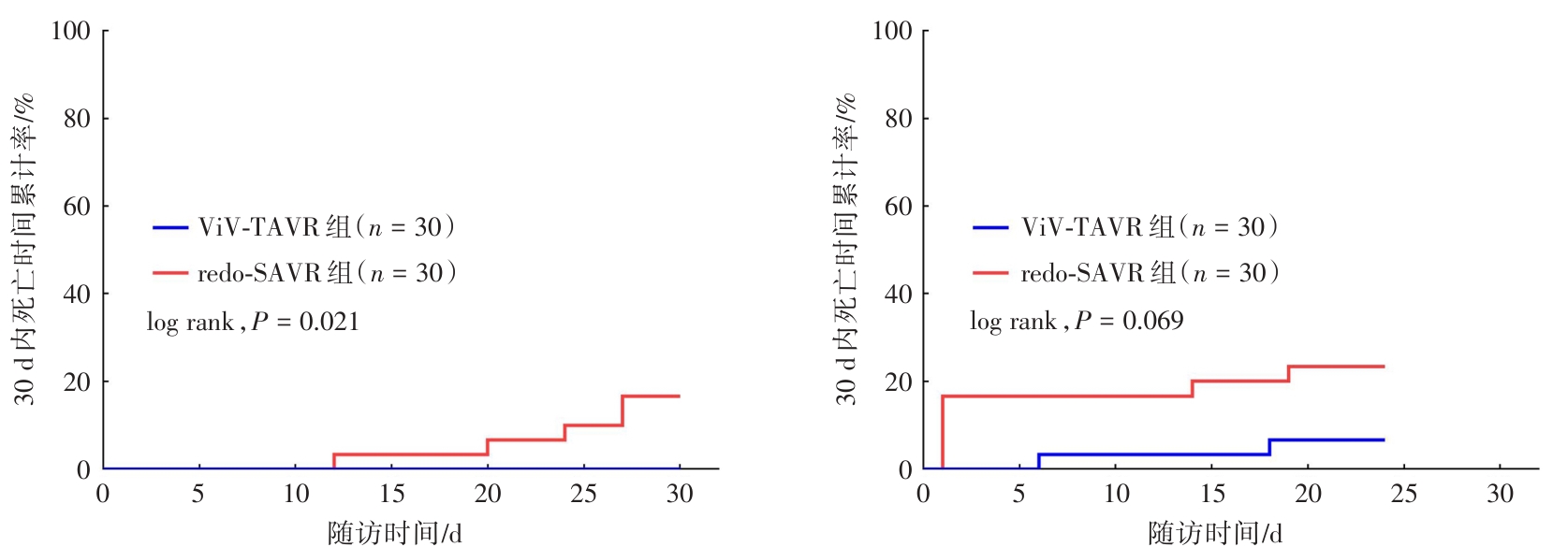 目的 比较经导管瓣中瓣置换术(ViV-TAVR)与二次外科主动脉瓣置换术(redo-SAVR)在生物瓣膜衰败患者中的应用效果及安全性。 方法 回顾性收集2020年1月至2022年6月医院收治的61例接受ViV-TAVR或redo-SAVR治疗的生物瓣膜衰败患者临床资料。根据治疗方案不同分为ViV-TAVR组(n = 31)与redo-SAVR组(n = 30)。比较两组围术期相关指标(手术时间、住院时间、机械通气时间、重症监护室观察时间),术前(T1)、术后1个月(T2)、术后3个月(T3)、术后6个月(T4)超声心动图指标,主要终点事件与次要终点事件。 结果 ViV-TAVR组手术时间、住院时间较redo-SAVR组更短,体外循环辅助较redo-SAVR组更少,差异有统计学意义(P < 0.05)。组内比较显示,术后1个月(T2)、术后3个月(T3)、术后6个月(T4)时点两组左心室射血分数(LVEF)、主动脉瓣峰值流速(AVmax)、峰值跨瓣压差(PGmax)、PGmean均低于术前(T1)时点,T3、T4时点两组左心室舒张末期内径(LVEDD)均低于T1、T2时点,差异有统计学意义(P < 0.05)。ViV-TAVR组30 d内死亡率低于redo-SAVR组,差异有统计学意义(P < 0.05);两组24个月内的全因死亡率比较,差异无统计学意义(P > 0.05)。ViV-TAVR组急性肾衰竭发生率低于redo-SAVR组,差异有统计学意义(P < 0.05)。 结论 相较于redo-SAVR,ViV-TAVR能有效降低生物瓣膜衰败患者30 d内的死亡风险以及急性肾衰竭的发生风险,但其远期死亡率与redo-SAVR相当。