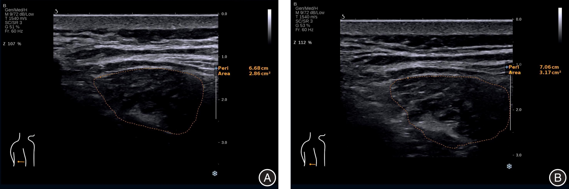 目的 分析四维牵引治疗老年退行性腰椎管狭窄症(DLSS)疗效、腰肌形态学及力学性能的效果。 方法 选择2022年1月至2024年2月广州中医药大学第二附属医院收治的老年DLSS患者按治疗方式分为观察组(肌肉锻炼+四维牵引,40例)和对照组(常规肌肉锻炼,40例)。对照组接受常规肌肉锻炼,观察组接受肌肉锻炼+四维牵引治疗,治疗4周。进行超声多模态检查,比较两组腰肌肌群形态学、力学性能、腰椎活动度、间歇性跛行距离、视觉模拟评分(VAS)、Oswestry功能障碍指数(ODI)。 结果 治疗后,观察组多裂肌厚度、多裂肌周长、多裂肌横截面积、压痛阈、腰椎活动度均大于对照组(P < 0.05),多裂肌剪切波速度(SWV)、多裂肌杨氏模量、肌张力、屈曲伸直比均小于对照组(P < 0.05),间歇性跛行距离长于对照组(P < 0.05)。治疗结束后及随访12个月期间,观察组VAS评分、ODI指数均低于对照组(P < 0.05)。 结论 四维牵引联合肌肉锻炼治疗能有效改善老年DLSS患者的临床症状、肌肉功能和力学性能。