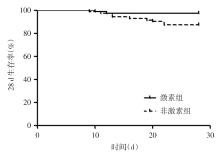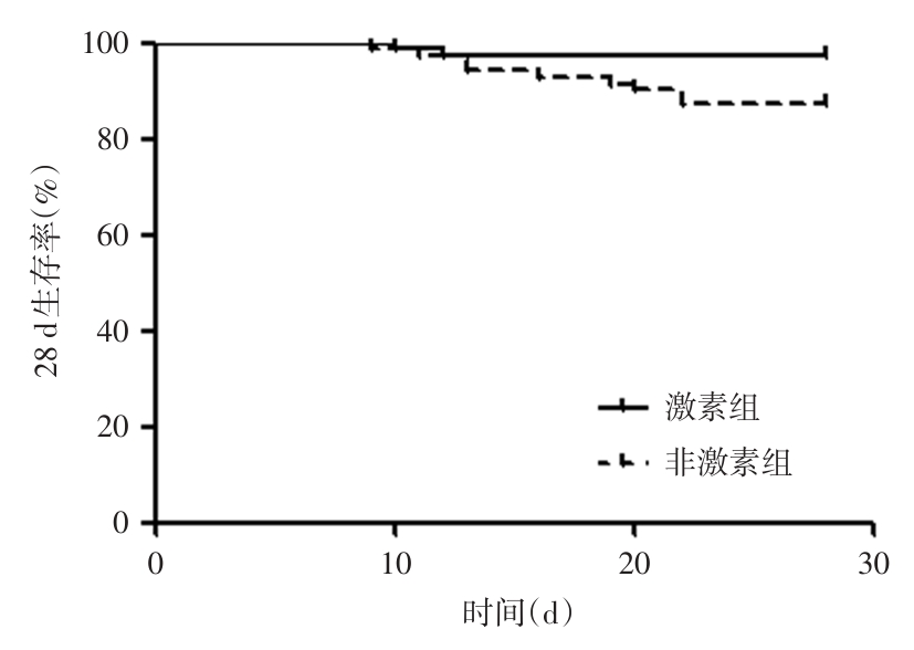 目的 探讨糖皮质激素用于治疗老年重症肺炎(SP)合并呼吸衰竭(RF)患者的应用价值。 方法 回顾性分析医院2022年1月至2023年12月住院治疗的208例老年SP合并RF患者的临床资料,根据是否应用糖皮质激素分为非激素组(n = 83)及激素组(n = 125)。采用倾向性评分匹配法对两组患者进行1∶1匹配,得到每组71例患者。比较两组临床指标、病情改善情况、血气指标、实验室生化指标及预后。 结果 激素组呼吸机使用时间及住院时间短于非激素组(P < 0.05);治疗7 d后,激素组格拉斯哥昏迷(GCS)评分、氧合指数(P/F)、血氧饱和度(SaO2)、淋巴细胞计数(TLC)高于非激素组,急性生理与慢性健康评分(APACHE Ⅱ)、序贯器官衰竭评估(SOFA)评分、二氧化碳分压(PaCO2)、血乳酸(LAC)、降钙素原(PCT)低于非激素组(P < 0.05);生存曲线显示,激素组28 d生存率高于非激素组(P < 0.05);Cox比例风险模型显示,未使用糖皮质激素为老年SP合并RF患者28 d病死的独立危险因素(P < 0.05)。 结论 应用糖皮质激素治疗老年SP合并RF能够缩短呼吸机使用时间及住院时间,缓解患者病情,促进血气指标恢复,改善生化指标,提高患者生存率。