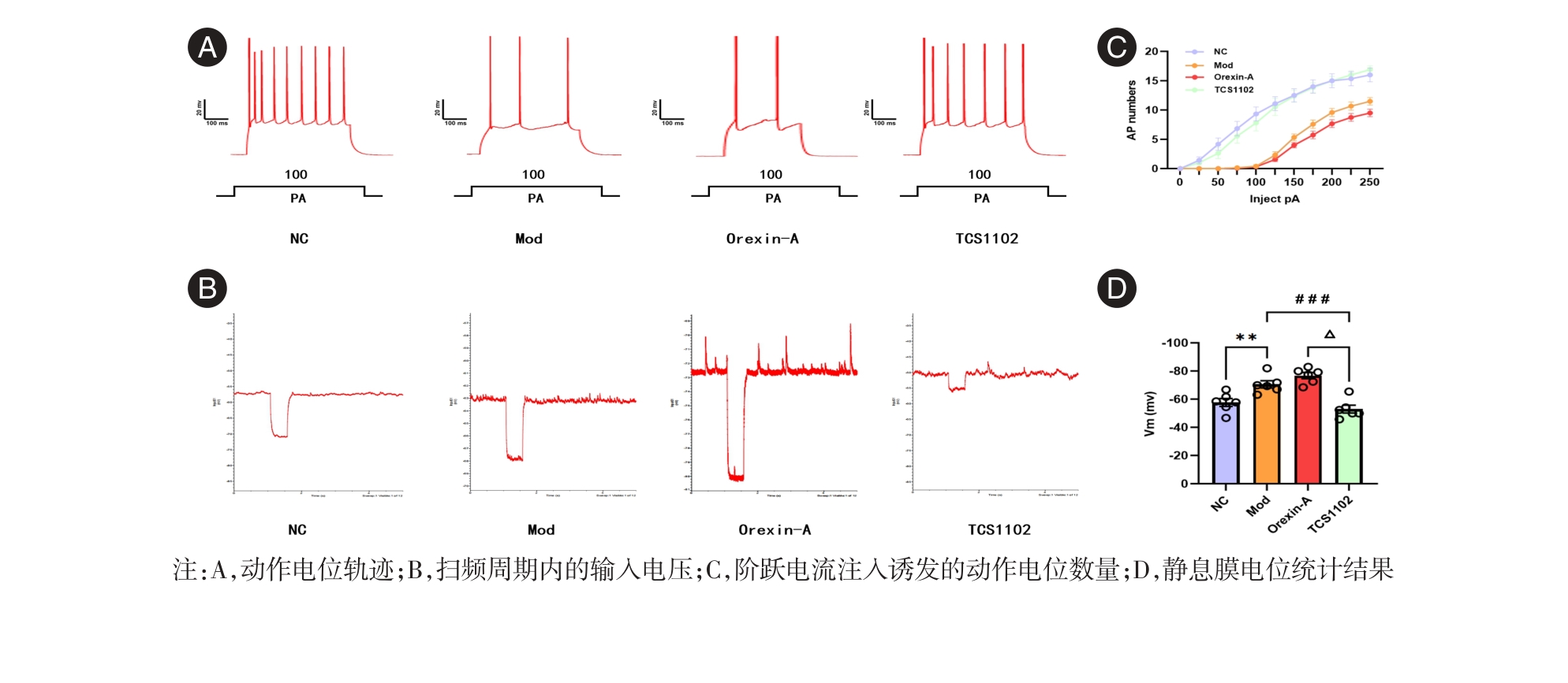 Objective To investigate whether orexin A (orexin-A), orexin receptor 1 (OX1R) and orexin receptor 2 (OX2R) are involved in iron death and lipid peroxidation regulation in chronically unpredictable mild stress (CUMS) depressed rats. Methods Forty rats were randomly divided into a normal group (NC group), a modeling group (Mod group), an exogenous Orexin-A group (Orexin-A group,), and an OX1R/OX2R blocker group (TCS1102 group), with 10 rats in each group. After modeling, behavioral changes were observed using the absent field test (OFT), sugar-water preference test (SPT) and forced swimming test (FST), action potential (PA) and resting membrane potential (Vm) were detected by diaphragm-clamp technique, Orexin-A/OX1R/OX2R protein expression in orbital frontal cortex (OFC) tissues was detected by protein immunoblotting (WB) method, RT-PCR The mRNA expression of glutathione peroxidase 4 (GPX4), long chain acyl coenzyme A synthase 4 (ACSL4) and cysteine/glutamate transporter light chain (SLC7A11) were detected by RT-PCR method, and the intensity of the expression of rat glial fibrillary acidic protein (GFAP) and lipid peroxidation product 4-hydroxynonenal (4-HNE) was labeled by immunofluorescence. Results Compared with the NC group, there were significant differences in OFT, SPT and FST behavioral in the Mod group (P < 0.01), with lower number of PA issuance (P < 0.001), higher Vm (P < 0.01), and higher expression of Orexin-A/OX1R/OX2R proteins (P < 0.01, P < 0.001, and P < 0.001). GPX4/SLC7A11 mRNA expression was decreased (P < 0.01), ACSL4 mRNA expression was elevated (P < 0.01), and the fluorescence intensity expression of both GFAP and 4-HNE was elevated (P < 0.001); the number of PA issuance was decreased in the Orexin-A group compared to the Mod group (P < 0.05), and the Orexin-A/OX1R/ OX2R protein expression was elevated (P < 0.05, P < 0.01), GPX4/SLC7A11 mRNA expression was decreased (P < 0.05), ACSL4 mRNA expression was elevated (P < 0.05), and the fluorescence intensity of GFAP and 4-HNE expression was elevated (P < 0.05, P < 0.01); the TCS1102 group had higher expression of GFAP and 4-HNE in the behavioral, Orexin-A/OX1R/OX2R protein expression, PA and Vm, GPX4/SLC7A11/ACSL4 mRNA, and GFAP and 4-HNE fluorescence intensity expression showed a reversed trend. Conclusions Orexin-A/OX1R/OX2R is involved in the regulation of iron death and lipid peroxidation in CUMS depressed rats, and the mechanism may be that Orexin-A enhances the excitability of OFC neurons by activating the OX1R/OX2R signaling pathway, up-regulates the expression of the key factor of iron death, ACSL4/4-HNE, and decreases the expression of GPX4/SLC7A11, which promotes lipid peroxidation and iron death.