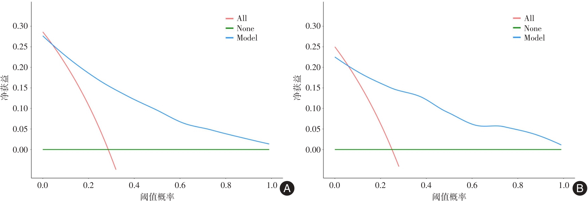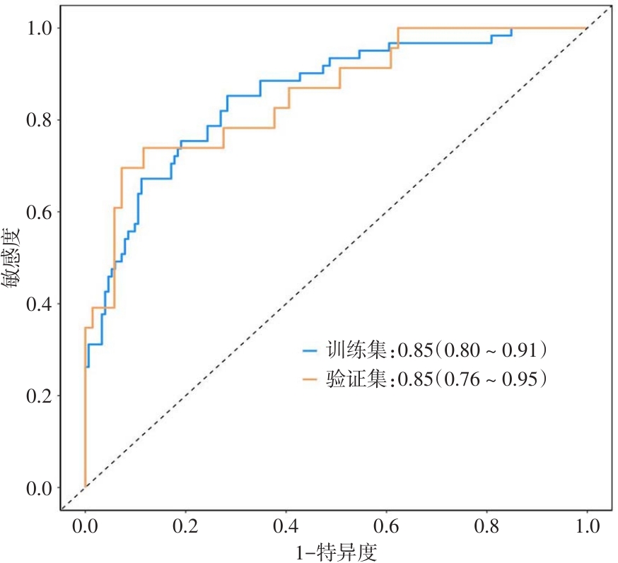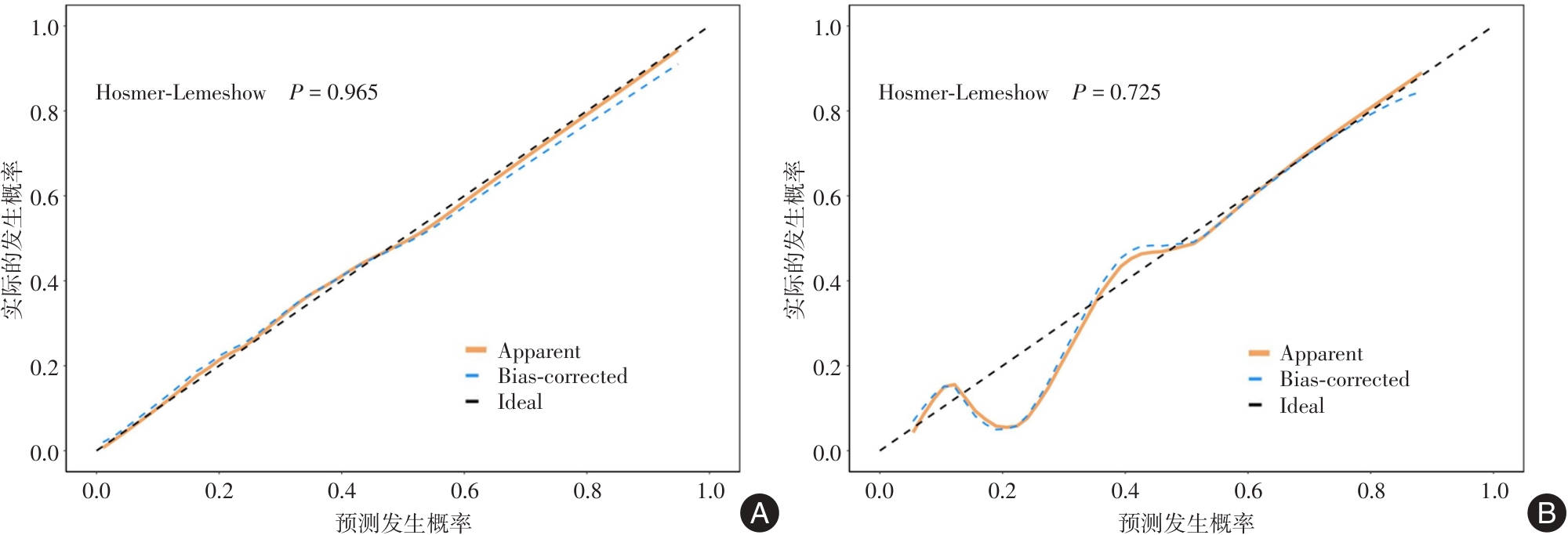 目的 基于体表心电图指标及临床指标构建心房颤动伴心力衰竭患者射频消融(radiofrequency catheter ablation, RFCA)治疗后复发的列线图模型并进行验证。 方法 选取2019年1月至2024年1月期间新乡市中心医院收治的305例房颤伴心力衰竭患者,按照7∶3比例随机分为训练集(213例)和验证集(92例),所有患者均接受RFCA治疗并完成至少1年的随访,根据随访结果分为复发组和未复发组,收集两组体表心电图指标及临床指标。采用多因素logistic回归分析筛选RFCA治疗后复发的危险因素,基于危险因素构建风险预测列线图模型,并对构建的模型进行评估。 结果 共收集305例患者的临床资料,治疗后复发84例(27.54%);按照7∶3比例随机分为训练集(213例)和验证集(92例),其中训练集复发61例,未复发152例。训练集与验证集临床资料比较差异均无统计学意义(P > 0.05)。训练集复发组持续性房颤占比更大,且复发组CHA2DS2-VASc评分、左心房内径、PR间期、NLR、NT-proBNP水平均高于未复发组(P < 0.05)。多因素逐步回归分析显示,高CHA2DS2-VASc评分、左心房内径大、PR间期延长、高NLR是RFCA治疗后复发的独立危险因素(P < 0.05)。建立4因子预测模型Ln(P/1-P) = -12.87 + 0.84*CHA2DS2-VASc评分 + 0.11*左心房内径 + 0.03*PR间期 + 0.31*NLR,训练集和验证集模型的曲线下面积(AUC)分别为0.85(95% CI: 0.80 ~ 0.91)、0.85(95% CI: 0.76 ~ 0.94)提示该模型预测效能良好;对模型进行Hosmer-Lemeshow拟合优度检验,认为拟合的概率值和实际的概率值基本一致(χ2 = 2.43、5.30,P = 0.965、0.725),进一步通过Bootstrap重复抽样1 000次后绘制校准曲线,发现训练集和验证集的偏倚校正曲线与实际曲线一致性良好,且均接近理想曲线;决策曲线显示训练集阈值概率在0.02 ~ 1.0、验证集阈值概率在0.04 ~ 1.0时,模型均能产生更好的临床效益。 结论 本研究基于体表心电图指标及临床指标构建的房颤伴心力衰竭患者RFCA治疗后复发的预测模型具有良好预测效能,有助于早期评估患者的复发风险。