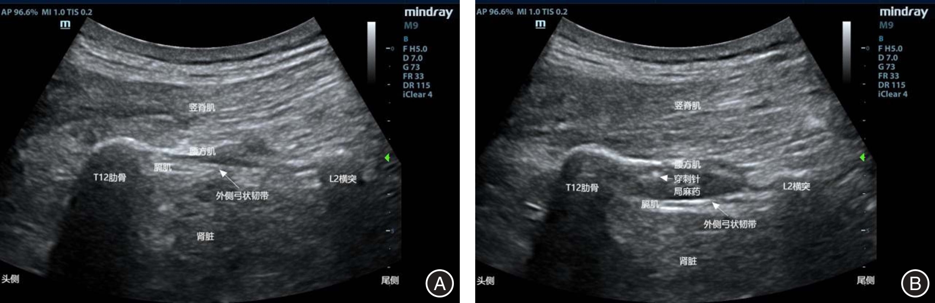 目的 探讨弓状韧带上腰方肌阻滞(QLB-LSAL)与肋缘下腹横肌平面阻滞(STAPB)对腹腔镜结直肠癌根治患者围术期镇痛及术后炎症的影响。 方法 纳入2022年10月至2024年10月择期全麻下行腹腔镜结直肠癌根治术患者102例,两组均行全麻联合神经阻滞,根据神经阻滞方式随机分为弓状韧带上腰方肌阻滞组(Q组,n = 51)和肋缘下腹横肌平面阻滞组(S组,n = 51)。记录麻醉诱导前(T0)、手术开始前(T1)、手术开始时(T2)、人工气腹时(T3)、腹腔冲洗时(T4)、手术结束时(T5)、出手术室时(T6)的平均动脉压(MAP)及心率(HR);记录瑞芬太尼、镇痛泵使用及补救镇痛情况;记录术后24、48及72 h静息及咳嗽时的VAS评分;记录术前1 d、术后1 d及3 d的白细胞介素-6(IL-6)及系统免疫炎症指数(SII);记录术后恢复及不良反应发生情况。 结果 Q组在T3 ~ T6时MAP及HR低于S组(P < 0.05);与S组比较,Q组瑞芬太尼用量减少、镇痛泵首次按压时间延长、有效按压次数及补救镇痛例数更少,术后24 h和48 h静息及咳嗽时VAS评分更低(P < 0.05);与术前1 d比较,两组术后1 d及3 d的IL-6及SII均升高,但Q组低于S组(P < 0.05);与S组比较,Q组首次下床时间及术后住院时间更短,不良反应发生率更低(P < 0.05)。 结论 QLB-LSAL较STAPB可为腹腔镜结直肠癌根治术患者提供更好的围术期镇痛,降低炎症反应,加速术后恢复。
