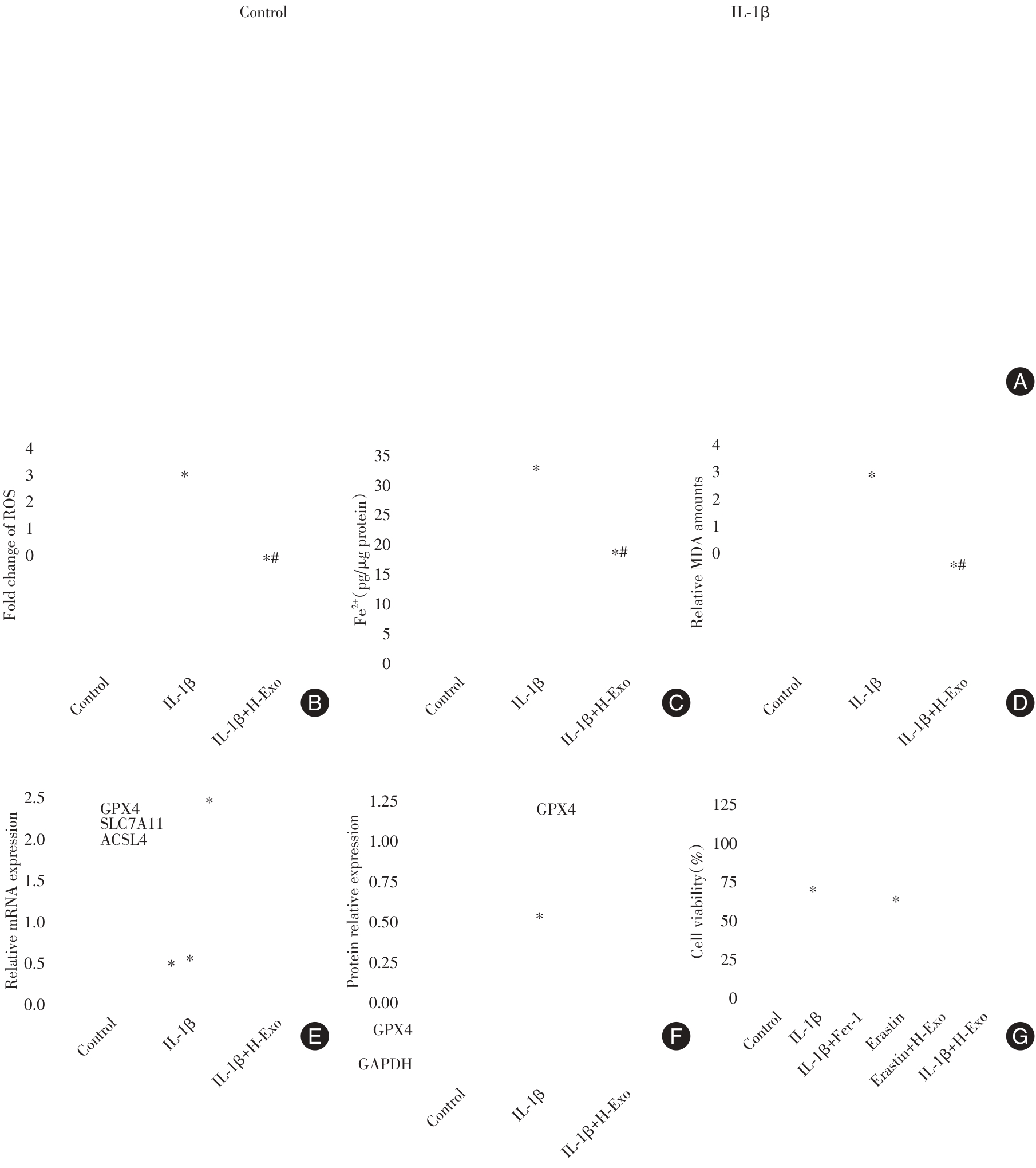 目的 探讨缺氧下间充质干细胞(MSCs)所分泌的外泌体(Exos)对软骨细胞损伤的影响。 方法 间充质干细胞进行缺氧处理后,收集其外泌体与IL-1β处理的软骨细胞共培养,再行CCK-8法检测细胞存活力,流式检测细胞凋亡,商用试剂盒检测Caspase-3和聚腺苷二磷酸核糖聚合酶(PARP)活性及活性氧(ROS)、Fe2+和丙二醛(MDA)的累积,荧光定量PCR(qRT-PCR)和Western blot检测谷胱甘肽过氧化物酶4(GPX4)、溶质载体家族7成员11(SLC7A11)和辅酶A合成酶长链家族成员4(ACSL4)的表达,ELISA检测Ⅱ型胶原α1(COL2A1)、基质金属蛋白酶13(MMP13)、血小板反应蛋白解整合素金属肽酶5(ADAMTS5)、炎症因子肿瘤坏死因子α(TNF-α)、白细胞介素-6(IL-6)、前列腺素E2(PGE2)的分泌。 结果 软骨细胞能摄取缺氧处理间充质干细胞所分泌外泌体(H-Exo),从而增强细胞存活力(P < 0.05)。IL-1β减少软骨细胞存活力,增强Caspase-3和PARP活性而促进凋亡(P < 0.05),而H-Exo显著逆转IL-1β诱导的凋亡。IL-1β还显著下调GPX4和SLC7A11的表达,并增强ACSL4的表达,同时增加ROS、Fe2+和MDA的累积(P < 0.05);铁死亡抑制剂和H-Exo均明显抑制IL-1β诱导的细胞铁死亡,且H-Exo能减弱IL-1β和铁死亡诱导剂的抑存活作用。另外,IL-1β显著抑制软骨合成基因COL2A1的表达,促进软骨降解主要酶MMP13和ADAMTS5的表达,并增强炎症因子TNF-α、IL-6和PGE2的分泌(P < 0.05),而H-Exo能降低IL-1β诱导的软骨合成分解代谢失衡和炎症。 结论 缺氧下间充质干细胞分泌的外泌体能抑制软骨细胞凋亡、铁死亡和减轻损伤,表明其具有软骨细胞保护作用,有望为软骨损伤的治疗提供新策略。