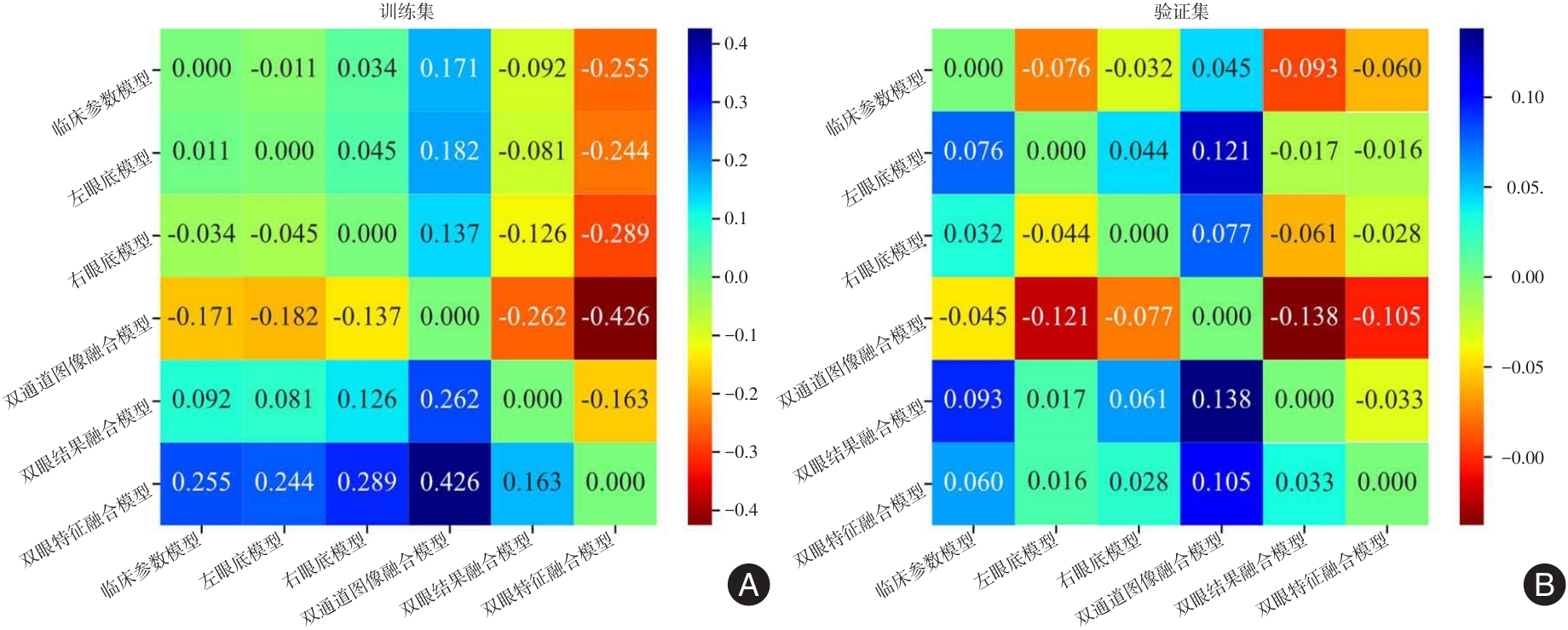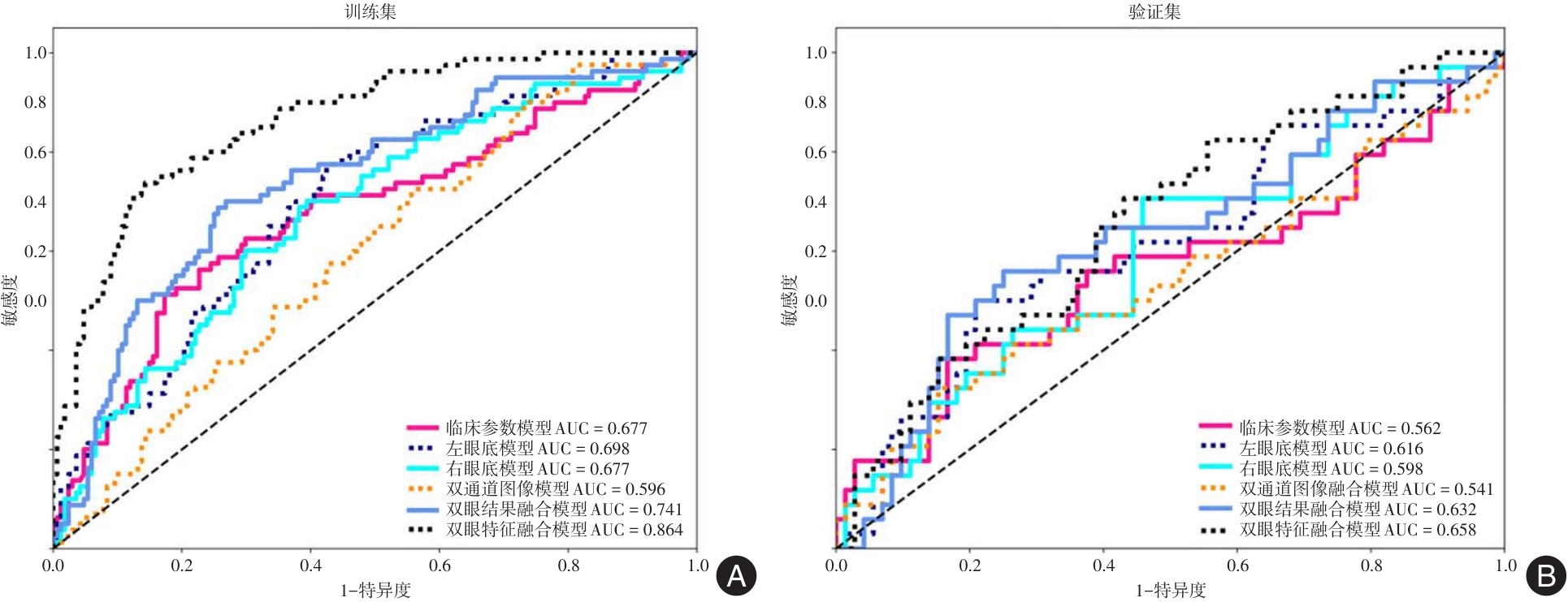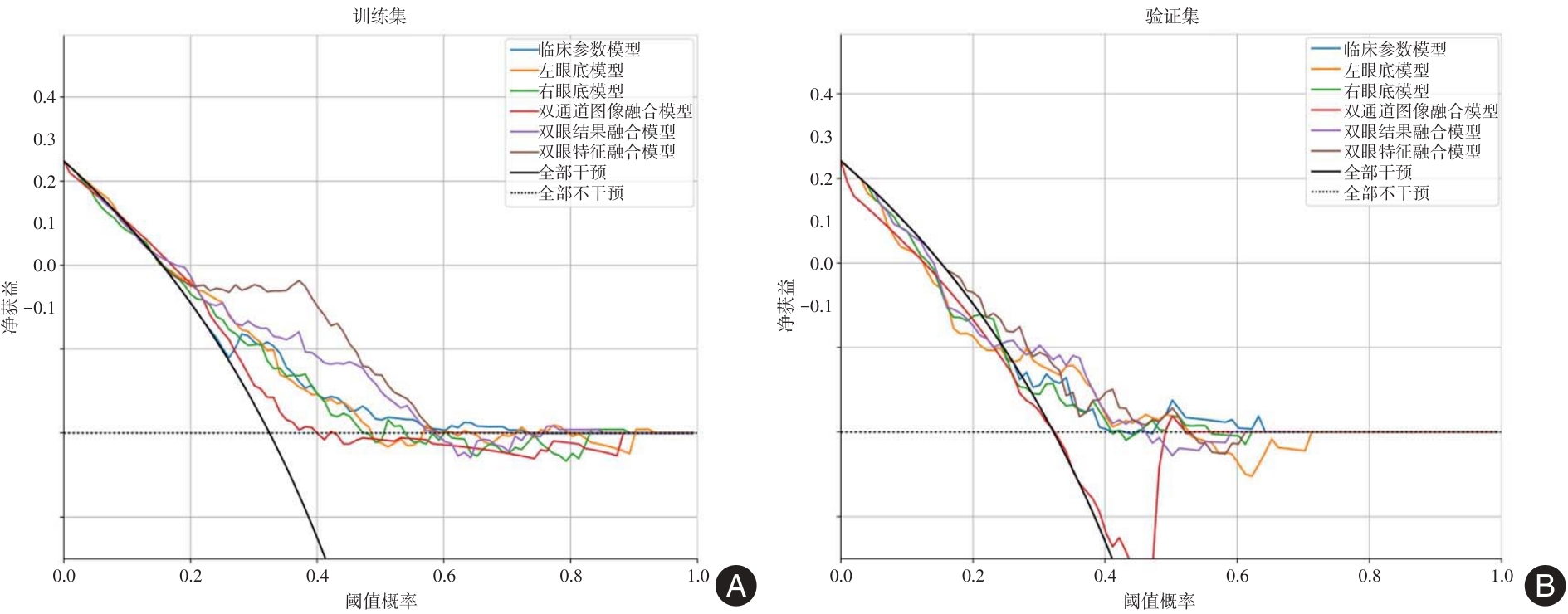 目的 探讨基于“无标注”早期眼底病变的全景视网膜图像深度学习(deep learning,DL)模型对糖尿病肾病(DKD)预测的可行性,并评估不同双眼融合策略的增效作用。 方法 回顾性收集2022年12月至2024年3月在扬州大学附属江都人民医院内分泌科住院的353例2型糖尿病(T2DM)患者的眼底视网膜图像及临床资料。根据是否有DKD,分为DKD组(114例)和糖尿病无肾病(NDKD)组(239例)。首先,基于“U型网络”(UNet)的预训练自动勾画眼底全景视网膜图像模型,并应用此“自动勾画模型”批量处理所有患者眼底全景视网膜图像。然后,按五折交叉验证(70%:30%),基于ResNet152分别构建左、右眼DL模型。并采取不同融合策略整合双眼信息构建融合模型,包括双眼结果融合、双眼特征融合、双眼图像融合模型。最后,采用受试者工作特征(ROC)曲线的曲线下面积(AUC)对模型进行评估。通过DeLong检验比较各模型之间AUC值的差异,采用净重新分类指数(NRI)和决策曲线分析(DCA)评估不同模型之间的优越性。 结果 本研究共构建6个预测模型:临床参数模型、左眼底模型、右眼底模型、双眼图像融合模型、双眼结果融合模型和双眼特征融合模型。在训练集和验证集中,基于Transformer的双眼特征融合模型AUC最高(分别为0.864和0.658)。DeLong检验显示,在训练集中,双眼特征融合模型AUC值显著高于其余5个模型(均P < 0.001);在验证集中,各模型AUC值之间差异无统计学意义(均P > 0.05)。NRI显示,在训练集和验证集中,与双眼特征融合模型比较,其余5个模型NRI(分别为-0.255、-0.244、-0.289、-0.426、-0.163和-0.060、-0.016、-0.028、-0.105、-0.033)均为负值,显示基于Transformer的双眼特征融合模型预测DKD性能最优。DCA显示,双眼特征融合模型净获益大于其余5个模型。 结论 基于“无标注”早期眼底病变的全景视网膜图像构建的DL模型可预测DKD。而基于Transformer融合策略性能最优,为未来进一步优化开发预测DKD工具,提供了一种新的思路。