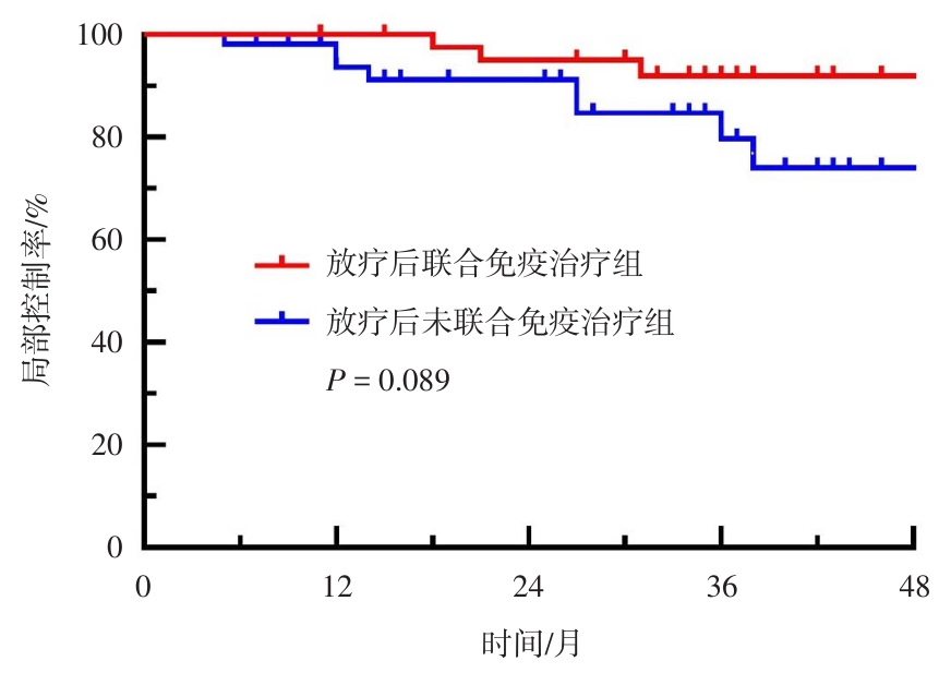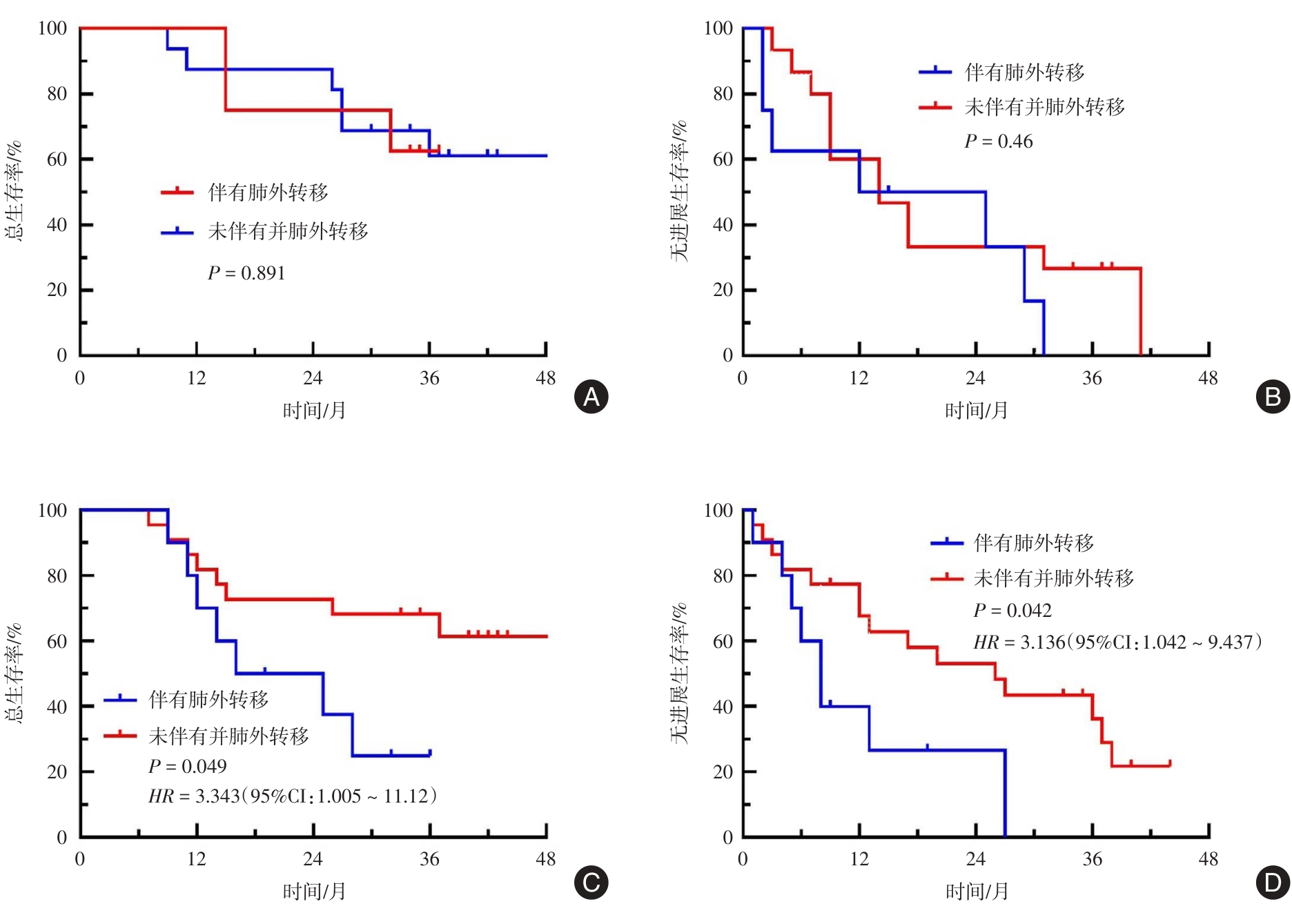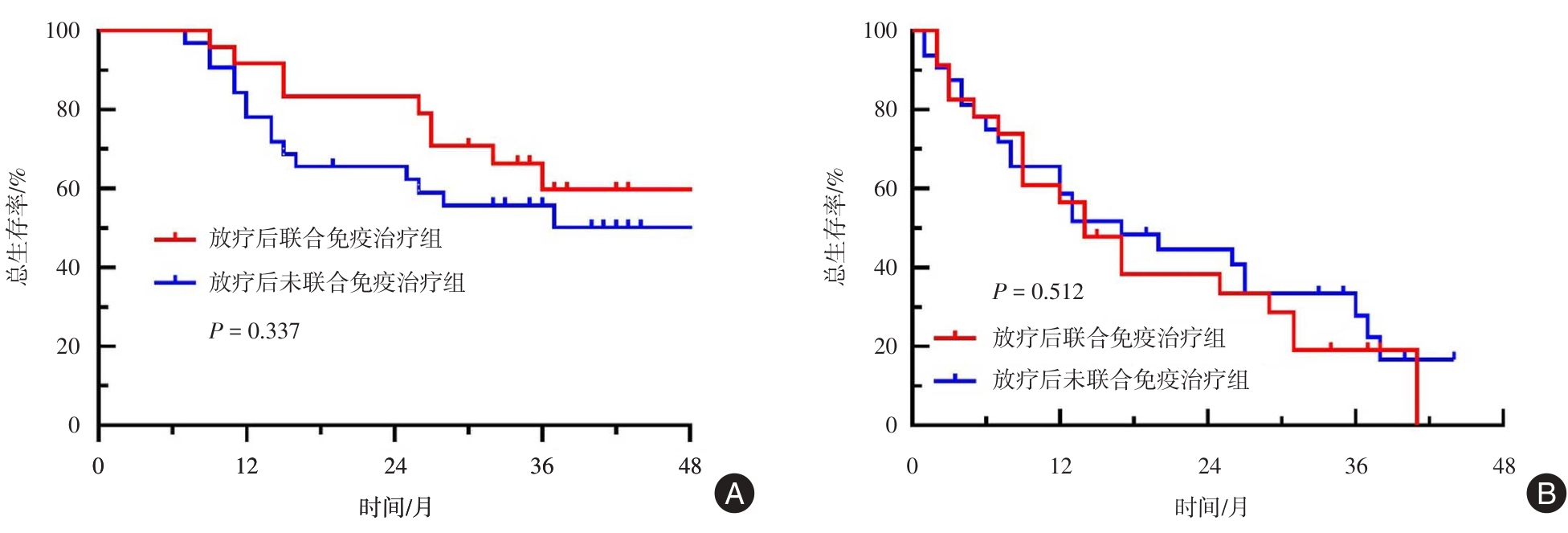 目的 评估大分割放疗或立体定向放射治疗(stereotactic body radiotherapy,SBRT)后联合免疫治疗对肺转移瘤患者生存的影响,并分析该联合治疗方案的疗效和安全性。 方法 回顾性纳入2021年1月至2023年1月在广州医科大学附属第一医院接受大分割放疗或SBRT治疗的56例不同病理类型肺转移瘤患者(共104个病灶)的临床资料。根据治疗策略,将患者分为大分割放疗或SBRT后联合免疫治疗组(n = 24)和大分割放疗或SBRT后未联合免疫治疗组(n = 32)。主要研究目的为总生存时间(overall survival,OS),次要研究目的包括无进展生存时间(progression-free survival,PFS),局部控制率(local control rate,LCR)和安全性。通过Kaplan-Meier和Cox回归模型进行生存分析,并探索伴有肺外转移在不同治疗策略下的预后价值。 结果 纳入患者原发肿瘤以肺癌(35/56,62.5%),消化系统(8/56,14.3%)和头颈肿瘤(6/56,10.7%)为主。至数据分析截止日(2025年7月31日),放疗后联合免疫治疗组的2年和3年OS高于未联合免疫治疗组,呈现生存获益趋势,但差异无统计学意义(2年OS:83.3% vs. 65.6%;3年OS:59.8% vs. 55.8%,P = 0.337)。探索性分析发现,在未联合免疫治疗组中,伴有肺外转移患者较仅肺转移瘤患者的生存期明显缩短,中位OS为16个月vs.未达到(HR = 3.343,95% CI:1.005~11.120,P = 0.049),中位PFS为8个月vs. 26个月(HR = 3.136,95% CI:1.042~9.437,P = 0.042)。而在联合免疫治疗组中,是否伴有肺外转移对OS(HR = 1.099,95% CI:0.268~4.496,P = 0.891)与PFS(HR = 1.525,95% CI:0.558~4.167,P = 0.46)均无显著影响。联合治疗组2年和3年LCR在数值上高于未联合免疫治疗组(2年:95% vs. 91.2%;3年:91.9% vs. 79.7%,P = 0.089)。治疗安全性良好,≥ 2级急性放射性肺炎(acute radiation pneumonitis, ARP)发生率为15.4%,无4级及以上ARP事件。 结论 大分割放疗或SBRT后联合免疫治疗显示出改善肺转移瘤患者生存的趋势,虽未达到统计学显著性,但是对伴有肺外转移的患者,采用该治疗模式能够获得与仅肺转移患者相当的生存预后。这一发现具有一定的临床启发意义,为晚期肺转移瘤的治疗策略优化提供了新思路。