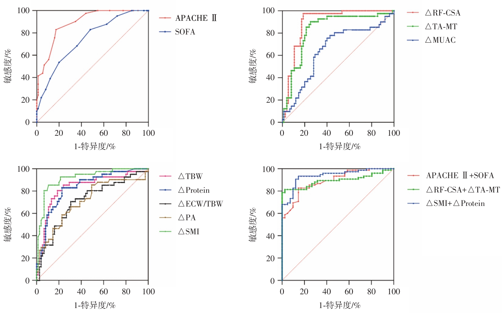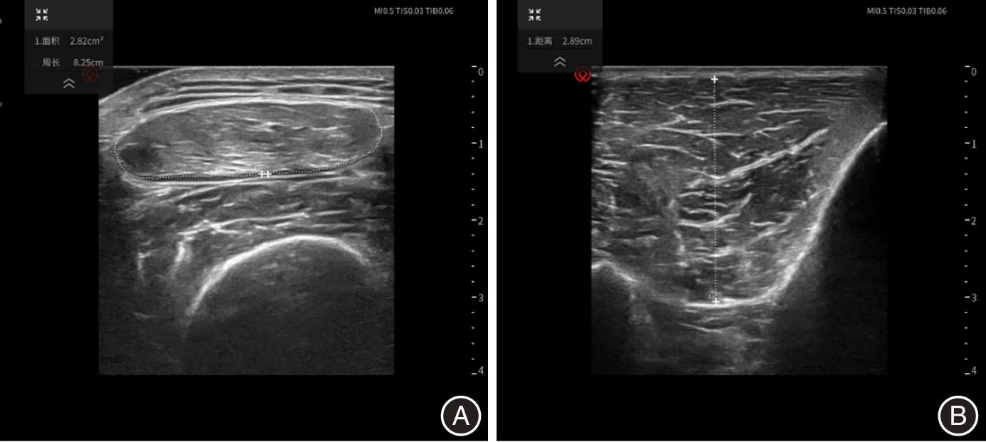 目的 探索股直肌横截面积(rectus femoris cross-sectional area, RF-CSA)、胫骨前肌厚度(tibialis anterior muscle thickness, TA-MT),以及生物电阻抗分析(bioelectrical-impedance-analysis, BIA)中的微观指标在重症监护室获得性衰弱(intensive care unit-acquired weakness, ICU-AW)中的诊断价值。 方法 对罹患肿瘤因脓毒症、脓毒症休克而进入天津医科大学肿瘤医院ICU的116例患者进行了一项单中心、观察性研究。通过患者的一般临床资料,并应用超声和生物电阻抗分析检测脓毒症发生6 h以内以及脓毒症治疗72 h以后股直肌、胫骨前肌、骨骼肌指数(SMI)、全身水含量(TBW)、蛋白质含量(Protein)等指标的变化,并进行统计学分析来预测ICU-AW的发生概率。 结果 最终41例患者诊断为ICU-AW,ICU-AW患者中存在更高比例的血管活性药物使用、机械辅助通气治疗,而且急性生理学和慢性健康状况评价Ⅱ(APACHEⅡ)和SOFA评分更高,病情更危重。另外分组对比显示ICU-AW组的患者在股直肌横截面积(RF-CSA)、胫骨前肌厚度(TA-MT)、骨骼肌指数(SMI)、全身水(TBW)、蛋白质含量(Protein)方面下降程度更为显著(P < 0.05)。此外,相比No ICU-AW组患者,在ICU-AW组患者中,初始平均PA值更低(3.42° vs. 3.80°),通过积极治疗后PA上升趋势更高。在ICU-AW诊断方面发现RF-CSA、TA-MT、SMI、TBW、Protein变化率在诊断ICU-AW上显示出较高的ROC-AUC[分别为0.891(95%CI为0.831 ~ 0.952),0.830(95%CI为0.749 ~ 0.911),0.916(95%CI为0.862 ~ 0.971),0.833(95%CI为0.749 ~ 0.917),0.834(95%CI为0.758 ~ 0.911)],此外,初始APACHEⅡ评分也显示出良好的诊断价值,ROC-AUC为0.829(95%CI为0.803 ~ 0.917),联合诊断模型中,生物电阻抗分析所测量的SMI变化率和Protein变化率联合模型具有最高的ROC-AUC(0.938,95%CI为0.895 ~ 0.980)。 结论 肿瘤脓毒症患者外周肌肉超声检测和生物电阻抗分析可以作为早期识别ICU-AW的方式。