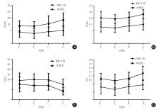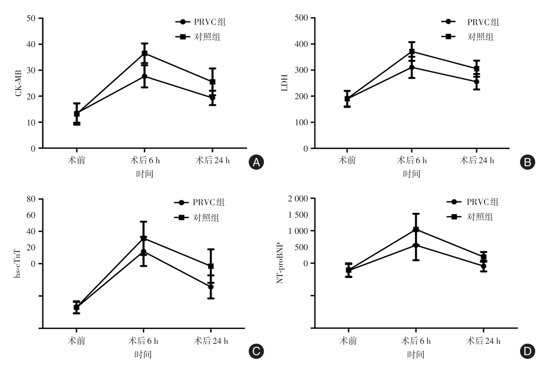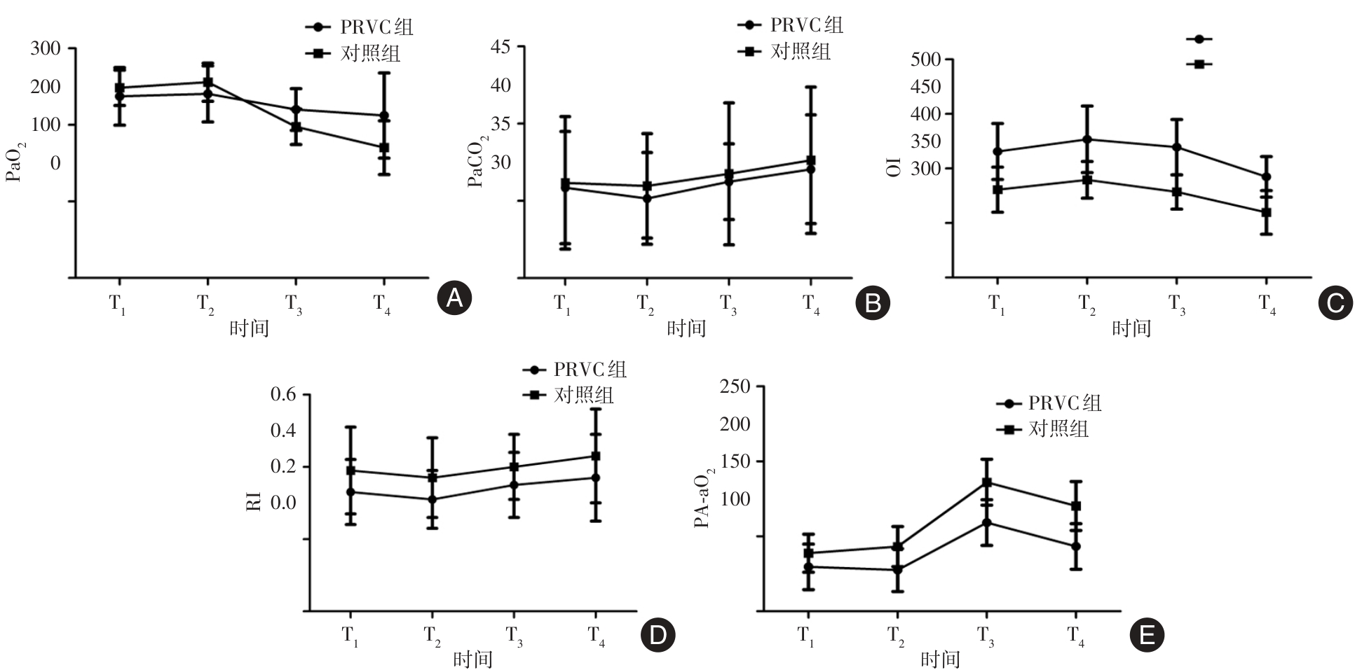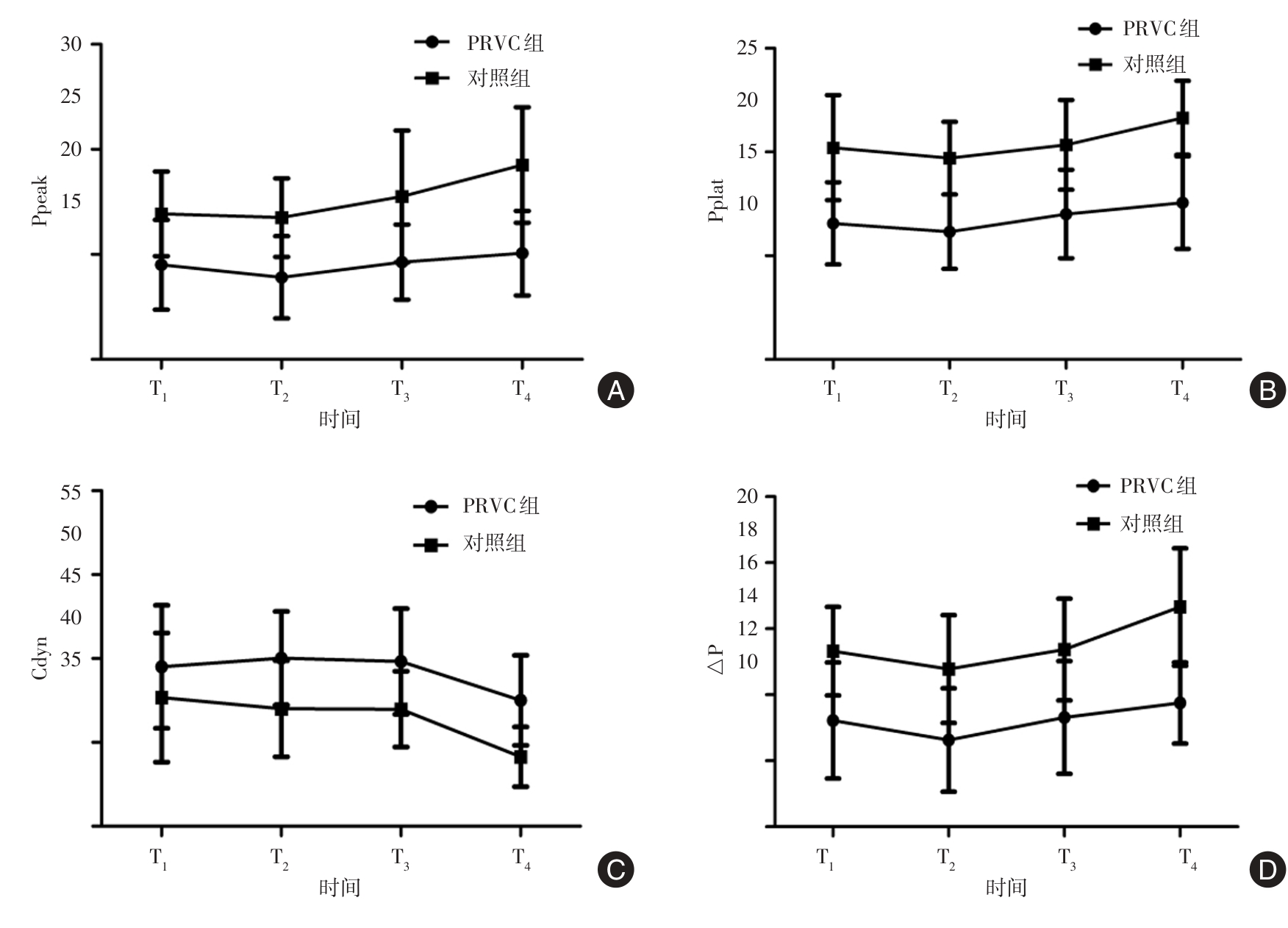 目的 基于呼吸力学、心肌损伤、术后肺部并发症来探讨压力控制容量保证通气模式(PRVC)用于心脏瓣膜手术的价值。 方法 前瞻性纳入2024年1月至2025年10月徐州医科大学附属医院收治的择期行心脏瓣膜置换或修复术患者,严格纳入与排除标准后最终入组100例,以分层区组随机化方法按1∶1比例将患者分配至PRVC组(n = 50)与对照组(n = 50,容量控制通气模式),比较两组手术不同时间呼吸力学、氧合状态,测定术前术后肌酸激酶同工酶(CK-MB)、乳酸脱氢酶(LDH)、超敏肌钙蛋白T(hs-cTnT)、N端脑钠肽前体(NT-proBNP)水平,记录术后7 d内肺部并发症发生情况。 结果 不同时间点,PRVC组Ppeak、Pplat、△P均低于对照组,Cdyn高于对照组,存在组间与时间效应(P < 0.05),Ppeak存在交互效应(P < 0.05);不同时间点,PRVC组PaO2、OI均高于对照组,RI、PA-aO2低于对照组,存在组间与时间效应(P < 0.05),其中PaO2、PA-aO2存在交互效应(P < 0.05);术后6、24 h两组CK-MB、LDH、hs-cTnT、NT-proBNP均高于同组术前,PRVC组术后6、24 h CK-MB、LDH、hs-cTnT、NT-proBNP低于对照组,存在组间、时间及交互效应(P < 0.05);PRVC组拔管时间、ICU停留时间及总住院时间短于对照组(P < 0.05),术后总肺部并发症发生率显著低于对照组(P < 0.05)。 结论 PRVC模式用于心脏瓣膜手术较VCV模式对呼吸力学、氧合影响更小,肺保护作用显著,可减轻心肌损伤,减少肺部并发症。