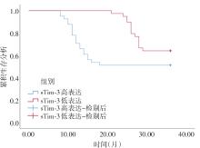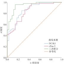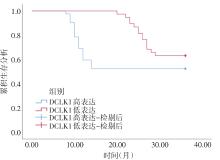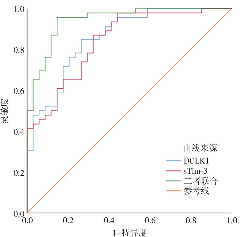 目的 探讨血清双皮质素样激酶1(DCLK1)、可溶性T细胞免疫球蛋白黏蛋白分子3(sTim-3)对前列腺癌根治术患者预后的评估。 方法 选取2016年6月至2019年6月在右江民族医学附属医院行前列腺癌根治术的80例患者作为研究组,另选取同期80例健康体检者作为对照组;采用酶联免疫吸附(ELISA)法检测血清DCLK1、sTim-3水平;分析血清DCLK1、sTim-3与前列腺癌根治术患者病理临床特征及预后的关系。 结果 研究组血清DCLK1、sTim-3水平显著高于对照组(P < 0.05)。血清DCLK1、sTim-3水平呈正相关(P < 0.05)。二者与PSA水平、Gleason评分均呈正相关(P < 0.05)。血清DCLK1、sTim-3表达水平与PSA水平、Gleason评分以及TNM分期有关(P < 0.05)。预后死亡组血清DCLK1、sTim-3水平显著高于预后生存组(P < 0.05)。DCLK1和sTim-3高表达患者生存率低于低表达患者。根据Cox回归分析表明,DCLK1、sTim-3高表达是影响前列腺癌根治术患者预后的危险因素(P < 0.05)。根据ROC曲线得知,二者联合预测前列腺癌根治术患者预后的AUC优于DCLK1、sTim-3各自单独预测。 结论 DCLK1、sTim-3在前列腺癌患者血清中显著升高,二者联合可以更好对前列腺癌根治术患者预后进行评估。