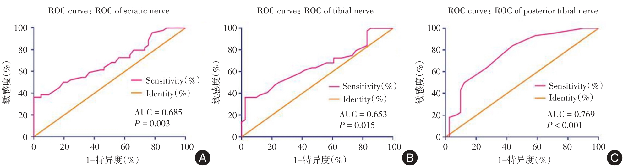 目的 探讨高频超声在辅助诊断糖尿病周围神经病变(diabetic perphery neuropathy,DPN)的应用。 方法 选取141例糖尿病患者,将其分为糖尿病周围神经病变组(DPN组,n = 44)、糖尿病组(DM组,n = 56)和非糖尿病组(NDM组,n = 41)。应用高频超声测量各组患者坐骨神经、胫神经、腓总神经、胫后神经以及正中神经的横截面积(cross sectional area, CSA),应用密歇根神经病变筛查量表(michigan neuropathy screening instrument, MNSI)和多伦多临床评分系统(toronto clinical scoring system, TCSS)评估DM组和DPN组患者周围神经功能。ROC曲线分析周围神经CSA在诊断DPN中的价值。 结果 与NDM及DM组相比,DPN 组所测量坐骨神经、胫神经、胫后神经CSA明显增大(P < 0.05);与DM组比较,DPN组MNSI评分明显升高(P < 0.05);CSA与MNSI评分及TCSS评分呈正相关(P < 0.05)。ROC曲线分析显示,在诊断DPN中,胫后神经CSA有较高的预测价值。 结论 DPN患者高频超声测量的坐骨神经、胫神经、胫后神经CSA较DM、NDM患者明显增大。CSA与MNSI评分及TCSS评分有较好的相关性。高频超声测量的坐骨神经、胫神经和胫后神经CSA在诊断DPN中有潜在价值。