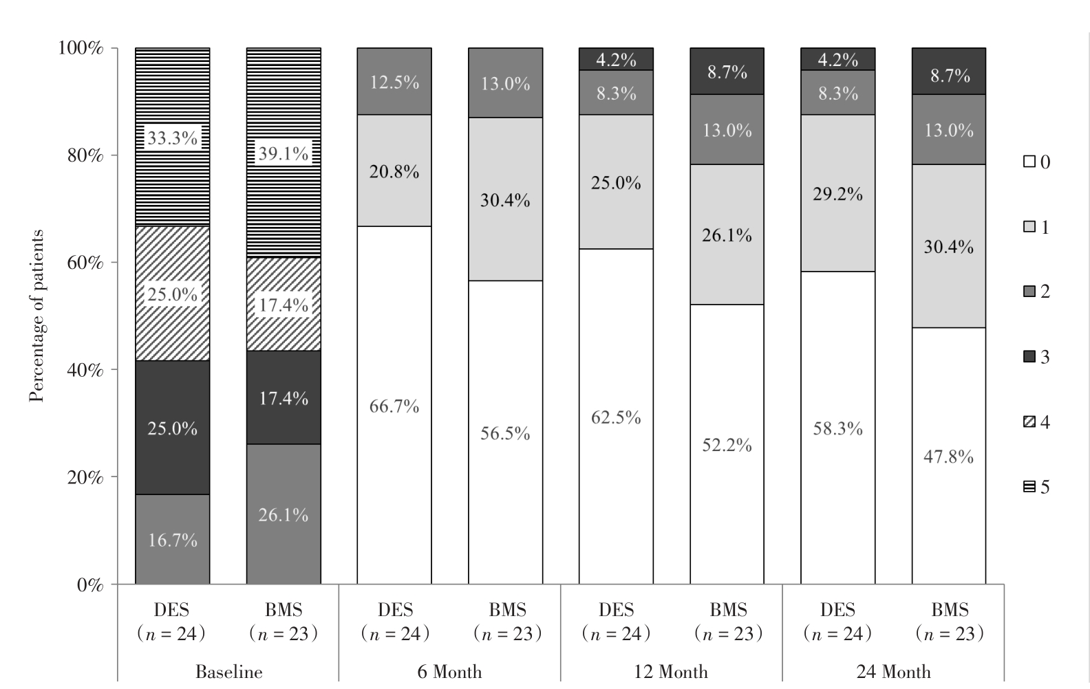 Key words: arteriosclerosis obliterans, drug-eluting stents, baremetalstent, femoral popliteal artery