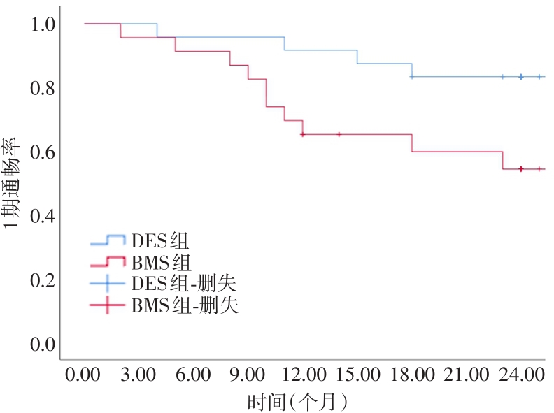 目的 比较药物洗脱支架(drug-eluting stents, DES)与金属裸支架(bare metal stent, BMS)治疗股腘动脉硬化闭塞症的临床疗效。 方法 回顾性分析郑州大学第五附属医院2020年10月至2021年6月收治的47例股腘动脉硬化闭塞症患者的临床资料,其中24例行药物洗脱支架治疗(DES组),23例行金属裸支架治疗(BMS组),术后对比两组的近中期临床疗效。 结果 47例患者均顺利完成手术,未发生与手术相关的不良事件。DES组与BMS组相比,术后7 d、3个月两组患者ABI比较差异均无统计学意义,术后6、12、24个月DES组患者ABI增长值均高于BMS组(P < 0.05)。术后6个月一期通畅率差异无统计学意义,术后12、24个月一期通畅率分别为(91.7% vs. 65.2%、83.3% vs. 56.5%,P < 0.05)。术后DES组靶病变血运重建率明显低于BMS组有明显的优势(4.0% vs. 26.1%,P < 0.05)。 结论 DES治疗股腘动脉硬化闭塞症具有较好的近中期疗效,其临床疗效优于BMS治疗。