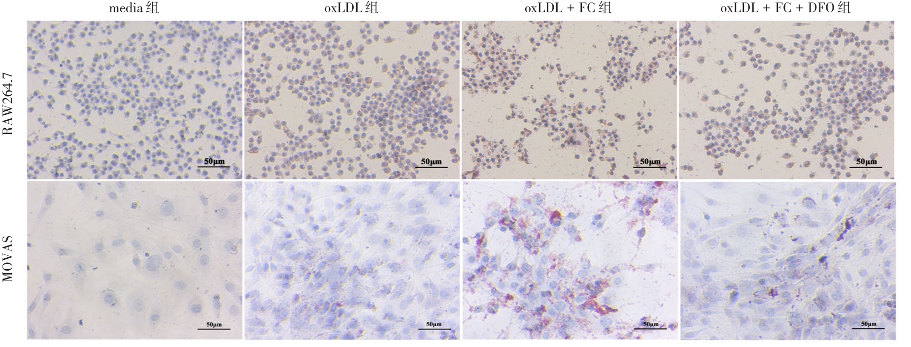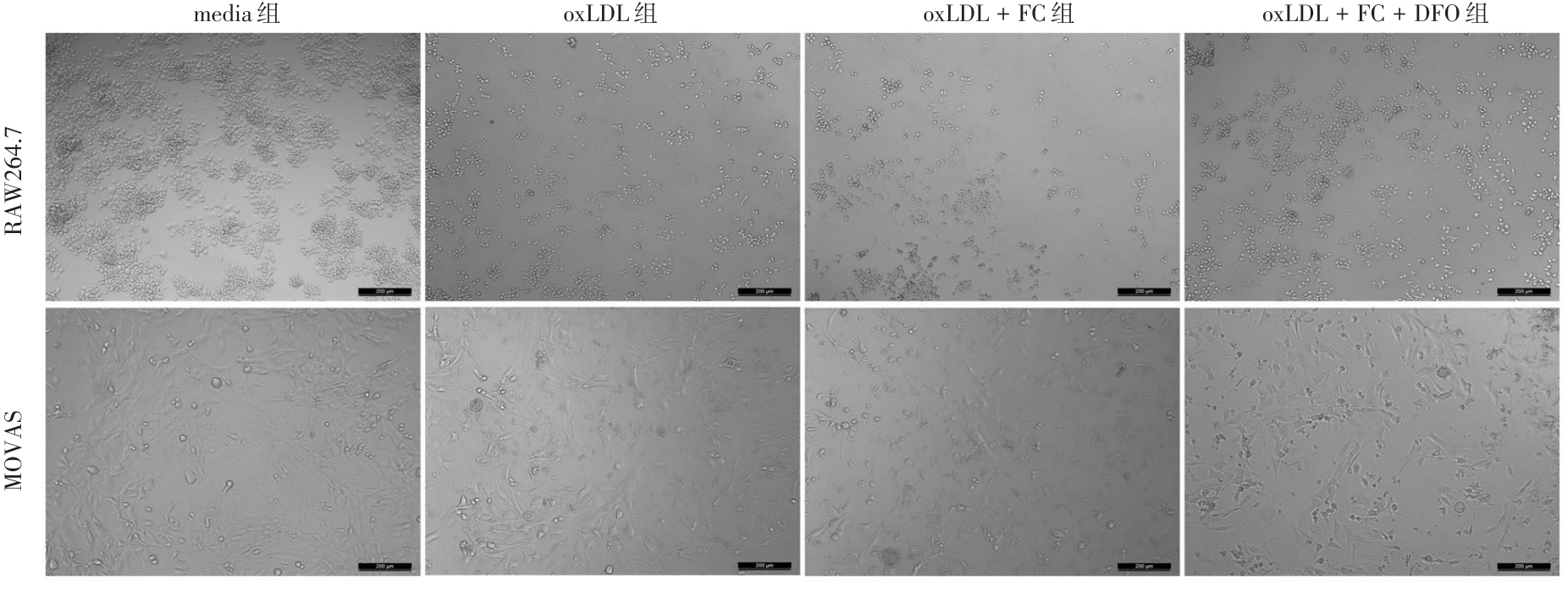目的 探讨铁超载对泡沫细胞促动脉粥样硬化(AS)活化的影响。 方法 RAW264.7和MOVAS细胞株扩增培养,分为正常对照(media)组、oxLDL组、oxLDL+柠檬酸铁铵(oxLDL+FC)组、oxLDL+柠檬酸铁铵+去铁胺(oxLDL+FC+DFO)组,分别以氧化性低密度脂蛋白(oxLDL)、柠檬酸铁胺(FC)、去铁胺(DFO)刺激。普鲁士蓝和油红O染色检测铁沉积和泡沫细胞生成。CCK-8测定细胞存活率,DHE探针观察活性氧自由基(ROS)生成,ELISA测定还原型谷胱甘肽(GSH)、谷胱甘肽过氧化物酶4(GPX4), 丙二醛(MDA)含量。RT-qPCR检测ATP结合盒转运体A1(ABCA1)和ATP结合盒转运体G1(ABCG1)、诱导型一氧化氮合酶(iNOS)、精氨酸酶1(Arg-1)、平滑肌肌动蛋白(α-SMA),平滑肌22a(smooth muscle 22 alpha, SM22a)、骨桥蛋白(OPN),白细胞介素-1β(IL-1β)、肿瘤坏死因子-α(TNF-α)mRNA表达。 结果 与oxLDL组相比,oxLDL+FC组细胞胆固醇逆向转运分子ABCA1和ABCG1表达降低,细胞泡沫化加重,死亡率上升,且ROS和MDA的表达增加,GPX4表达降低,巨噬细胞M1型标志物及平滑肌细胞合成型标志物升高,炎症因子IL-1β、TNF-α的表达明显增加,差异有统计学意义(P < 0.05)。 结论 铁超载能促进泡沫细胞生成,使其向促动脉粥样硬化表型转化,加重脂质过氧化及炎症反应。