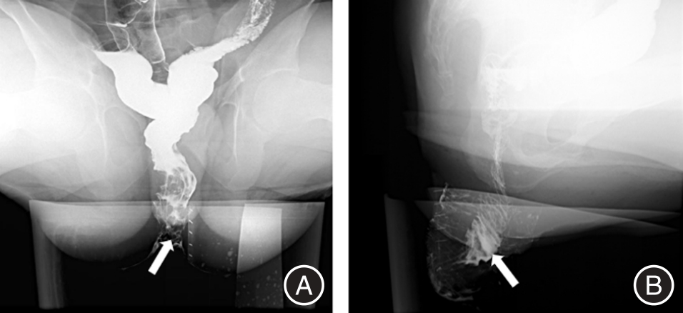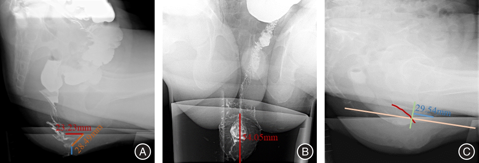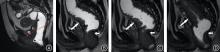 目的 回顾性总结分析孤立性直肠溃疡综合征(SRUS)患者的X线排粪造影(XRD)和MR排粪造影(MRD)的影像学表现,为临床诊疗提供重要信息。 方法 19例经临床、病理和肠镜检查证实的SRUS患者纳入本研究,15例行XRD,7例行MRD,3例患者同时进行了XRD和MRD检查。收集所有患者的数据并进行盆底功能测量。 结果 在XRD结果中,3例(20%)表现直肠内套叠,8例(53.3%)直肠外脱垂,2例(13.3%)中度直肠前突。另外耻骨直肠肌肥厚患者有2例,膀胱脱垂和子宫脱垂患者各有1例。在MRD结果中,3例(42.9%)表现直肠黏膜脱垂(部分性脱垂),4例(57.1%)直肠前突患者中,3例(均为女性)为中度直肠前突,1例为轻度直肠前突。3例患者同时观察到相关的前、中腔室器官下降,2例耻骨直肠肌肥厚,没有患者表现乙状结肠疝。 结论 排粪造影可以评估SRUS患者的直肠外脱垂、直肠前突、直肠黏膜脱垂、直肠内套叠等盆底结构及功能异常,对SRUS患者的治疗具有指导意义。