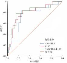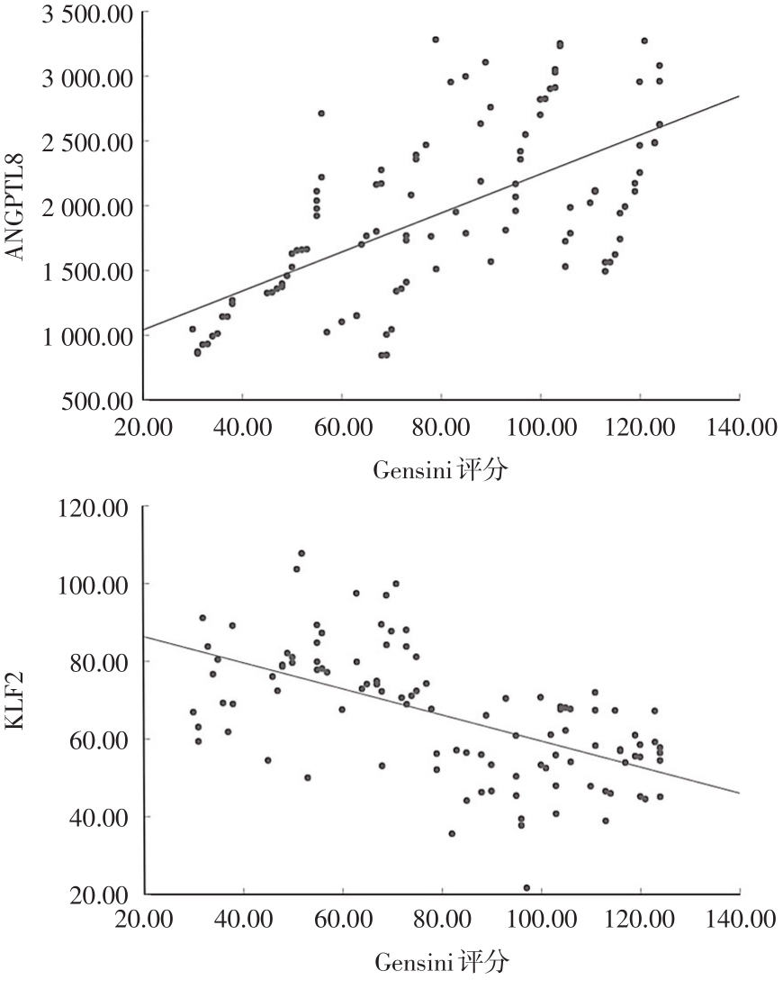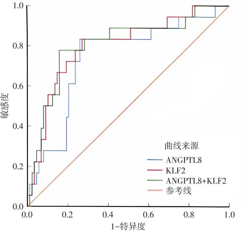 目的 探讨急性心肌梗死(AMI)患者血清血管生成素样蛋白8(ANGPTL8)、Kruppel样因子2(KLF2)表达与冠脉病变程度及主要心脏不良事件(MACE)发生的关系。 方法 选取106例AMI患者为研究对象,根据冠脉病变程度将患者分为轻度组(52例)和重度组(54例),根据MACE发生情况将患者分为MACE组(18例)和非MACE组(88例)。收集患者一般资料,酶联免疫吸附试验(ELISA)法检测血清ANGPTL8、KLF2水平,Spearman相关分析AMI患者血清ANGPTL8、KLF2水平与Gensini评分的相关性,多因素Logistic回归分析AMI患者冠脉病变程度的影响因素;绘制受试者工作特征(ROC)曲线分析血清ANGPTL8、KLF2水平预测AMI患者发生MACE的价值。 结果 重度组AMI患者高血压史、高血脂史患者比例,收缩压、舒张压、三酰甘油(TG)、N-末端B型利钠肽原(NT-proBNP)、心肌肌钙蛋白I(cTnI)水平,Gensini评分以及血清ANGPTL8水平高于轻度组(P < 0.05),高密度脂蛋白胆固醇(HDL-C)水平以及血清KLF2水平低于轻度组(P < 0.05);且轻度组和重度组AMI患者病变支数比较,差异有统计学意义(P < 0.05)。AMI患者血清ANGPTL8水平与Gensini评分呈正相关(r = 0.638,P < 0.05),血清KLF2水平与Gensini评分呈负相关(r = -0.612,P < 0.05)。高血压史、高血脂史、cTnI、ANGPTL8是AMI患者冠脉病变进展为重度的危险因素(P < 0.05),而HDL-C、KLF2是保护因素(P < 0.05)。MACE组血清ANGPTL8水平高于非MACE组(P < 0.05),而血清KLF2水平低于非MACE组(P < 0.05)。血清ANGPTL8、KLF2水平及二者联合预测AMI患者发生MACE的曲线下面积分别为0.740(95%CI:0.646 ~ 0.820)、0.799(95%CI:0.710 ~ 0.870)、0.806(95%CI:0.717 ~ 0.876)。 结论 血清ANGPTL8、KLF2表达均与AMI患者冠脉病变程度密切相关,且对MACE发生具有一定预测价值。