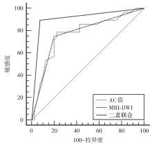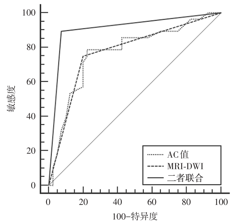 目的 探讨磁共振成像-弥散加权成像(MRI-DMI)联合超声声衰减成像(ATI)诊断脂肪肝背景下< 2 cm局灶结节性病变的价值。 方法 回顾性分析2022年6月至2023年6月河南大学淮河医院收治的68例脂肪肝合并< 2 cm局灶结节性病变的临床资料,所有患者均接受MRI检查、病理学检查与ATI检查。根据脂肪肝病变程度不同将68例患者分为重度组(n = 24)、中度组(n = 27)、轻度组(n = 17)。对比不同局灶节性病变患者的表观扩散系数(ADC)值、声衰减系数(AC)值与临床资料,对比不同脂肪肝病变程度患者的ADC值、AC值与临床资料,采用Pearson分析相关性,分析MRI-DWI联合AC值对脂肪肝合并< 2 cm局灶结节性病变为恶性的诊断价值。 结果 病理学诊断结果显示,68例患者中,41例为良性结节,27例为恶性结节。良性结节组与恶性结节组低密度脂蛋白胆固醇(LDL-C)、年龄、三酰甘油(TG)、性别、总胆固醇(TC)、高密度脂蛋白胆固醇(HDL-C)对比差异无统计学意义(P > 0.05)。轻度组、中度组、重度组TG、年龄、HDL-C、性别、TC、LDL-C比较差异无统计学意义(P > 0.05)。恶性结节组不同b值下的ADC值低于良性结节组(P < 0.05),恶性结节组AC值高于良性结节组(P < 0.05)。重度组不同b值下的ADC值低于轻度组、中度组(P < 0.05),中度组不同b值下的ADC值低于轻度组(P < 0.05),重度组AC值高于轻度组、中度组(P < 0.05),中度组AC值高于轻度组(P < 0.05)。不同b值下的ADC值与脂肪肝病变程度均呈负相关(P < 0.05),与TG、HDL-C、TC及LDL-C无关(P > 0.05);AC值与脂肪肝病变程度呈正相关(P < 0.05),与HDL-C呈负相关(P < 0.05),与TG、TC及LDL-C无关(P > 0.05)。MRI-DWI、AC值及二者联合诊断脂肪肝合并< 2 cm局灶结节性病变为恶性的曲线下面积(AUC)值分别为0.775、0.773、0.909(P < 0.05),且二者联合的AUC值更高(P < 0.05)。 结论 MRI-DWI、ATI在鉴别诊断脂肪肝背景下< 2 cm局灶结节性病变良恶性中具有重要价值,且二者联合具有更高的诊断价值。