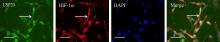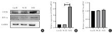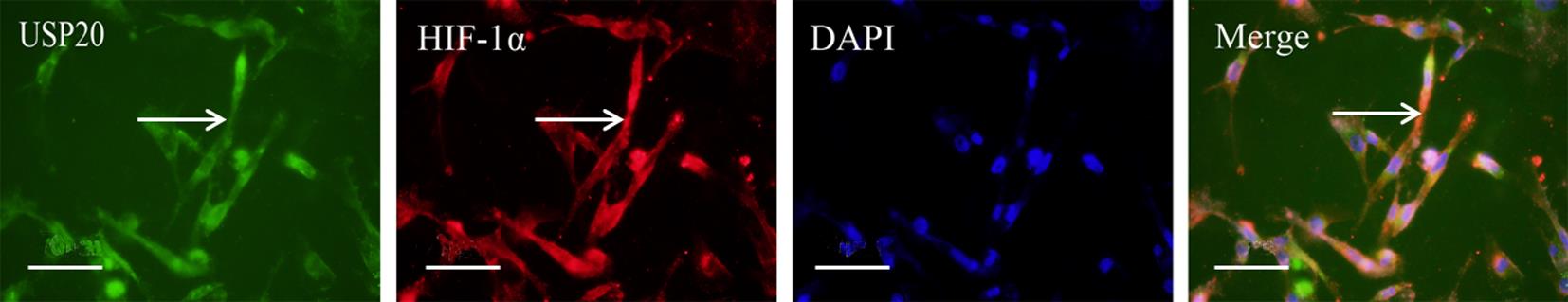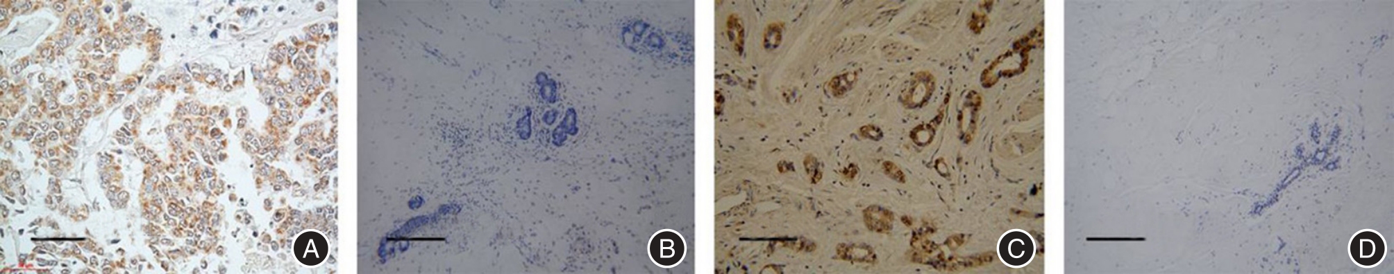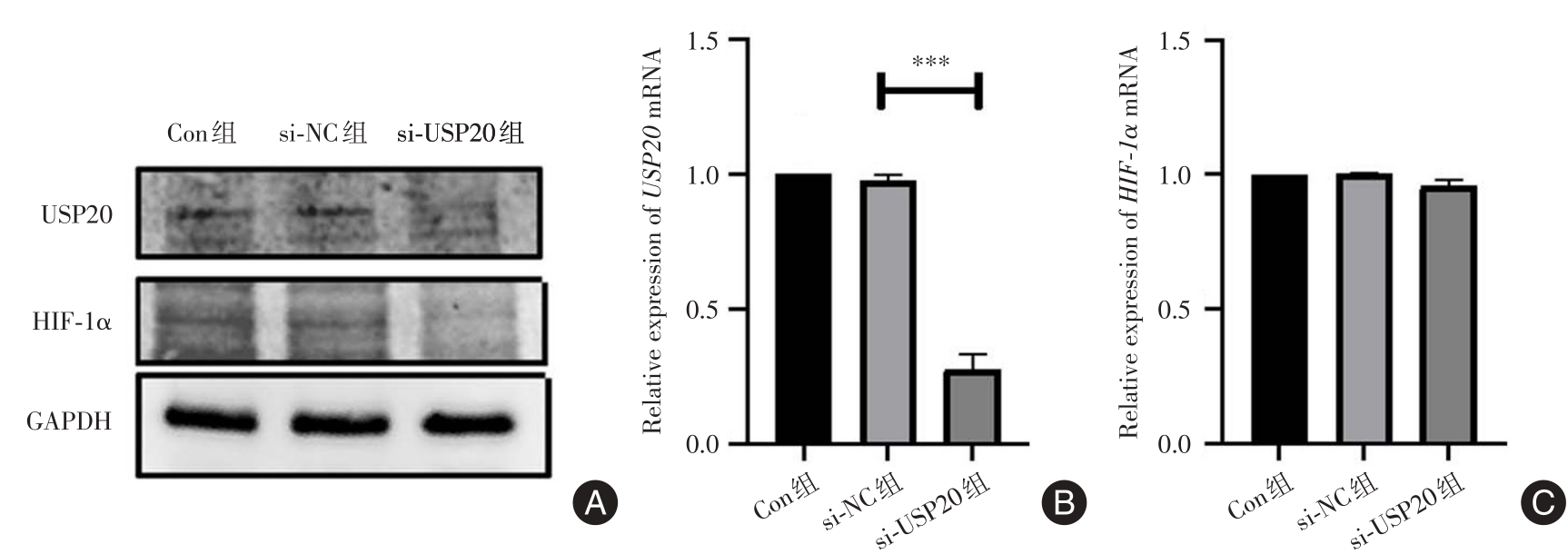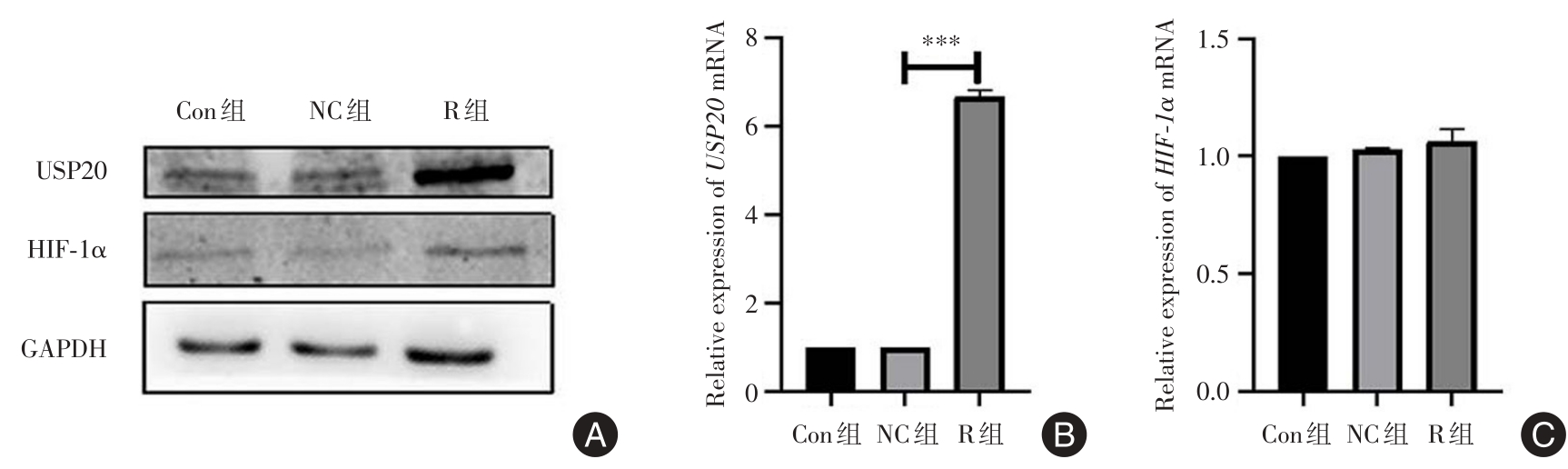 目的 探讨乳腺癌中泛素特异性蛋白酶20(ubiquitin-specific proteases 20, USP20)、低氧诱导因子1α(hypoxia inducible factor-1α, HIF-α)表达变化及意义。 方法 免疫组织化学及免疫荧光方法用于检测USP20与HIF-α阳性细胞的表达变化以及细胞定位,并分析它们之间的关系; shRNA-USP20慢病毒转染乳腺癌MDA-MB-231细胞构建乳腺癌MDA-MB-231 USP20过表达细胞系,siRNA-USP20构建乳腺癌MDA-MB-231USP20敲减细胞系,通过荧光定量PCR与Westem blot检测USP20基因及蛋白的过表达和敲减水平,并观察过表达以及敲减USP20前后 HIF-α基因和蛋白的表达变化。 结果 USP20与HIF-α在乳腺癌组织中的阳性表达率分别为69.62%(55/79)和 46.83%(37/79),而在邻近相对正常组织中的表达均为阴性,与邻近相对正常组织相比,乳腺癌组织中USP20与HIF-α阳性表达均显著增加,差异均有统计学意义(P < 0.01),USP20与HIF-α阳性表达均主要在乳腺癌组织细胞质中,少量在细胞核;且乳腺组织中USP20表达与HIF-1α表达呈正相关(P < 0.01);过表达USP20后HIF-α的mRNA 的表达不变,蛋白表达显著增加(P < 0.01)。敲减USP20后HIF-α mRNA表达轻微降低,但差异均无统计学意义(P > 0.05),而蛋白表达水平显著降低(P < 0.01)。 结论 乳腺癌中USP20和HIF-α表达均显著增加,且呈正相关关系,过表达USP20后HIF-α蛋白表达显著增加,敲减USP20后HIF-α蛋白表达显著降低,USP20可能通过影响HIF-α的表达进而促进乳腺癌发生发展。