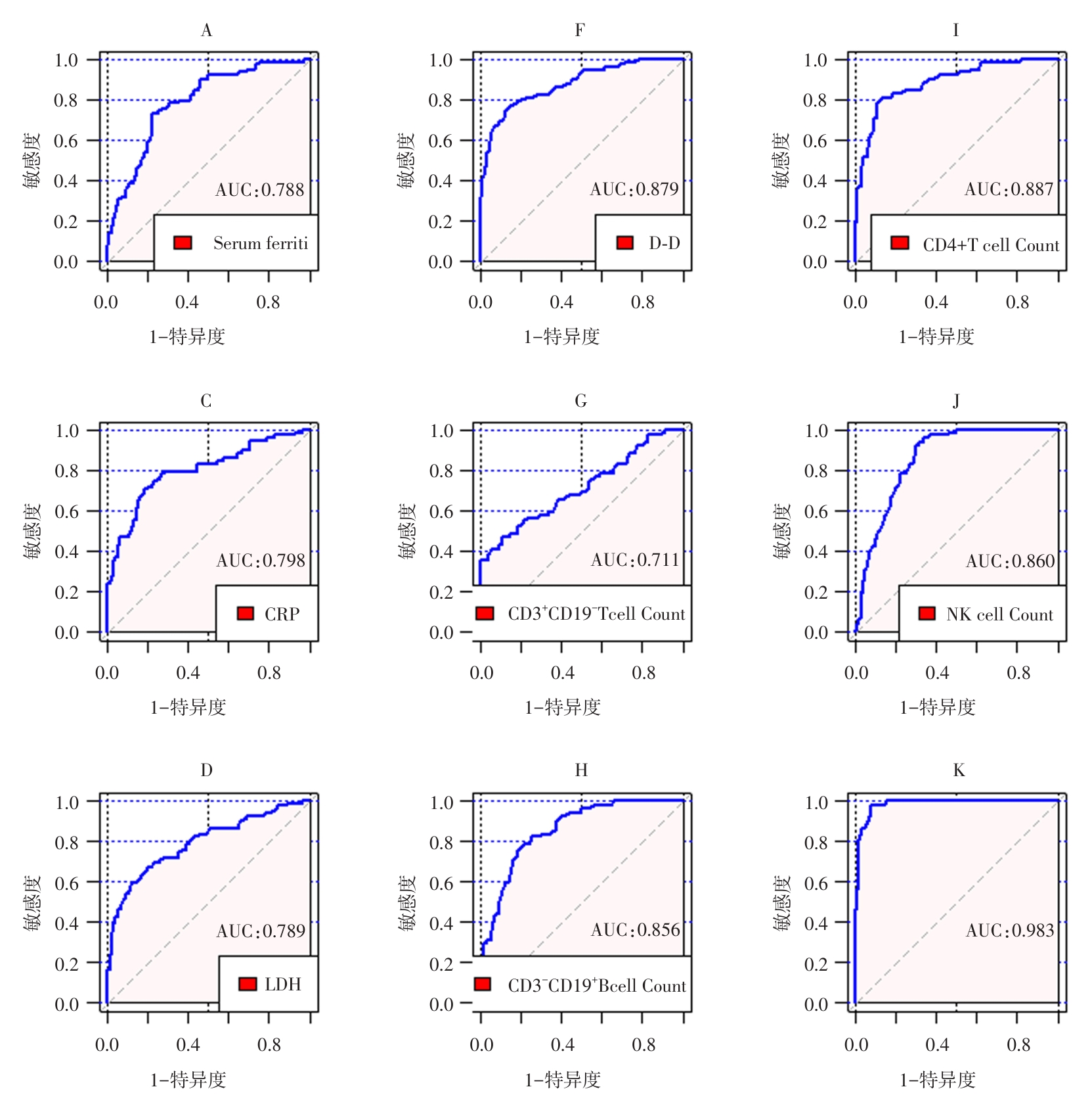 目的 探讨淋巴细胞亚群绝对数对重症肺炎支原体肺炎(severe mycoplasma pneumonia,SMPP)患儿早期预警的价值及支气管镜检查特点,从而为SMPP的早期诊断提供有价值的参考。 方法 本研究纳入了102例肺炎支原体肺炎(mycoplasma pneumoniae pneumonia, MPP)患儿,其中普通MPP(54例)和SMPP患儿(48例),收集并比较两组患儿淋巴细胞亚群、临床特点及实验室指标。并进一步将患儿分为黏液栓痰组和非黏液栓痰组,比较其淋巴细胞亚群特征。 结果 淋巴细胞亚群CD3+CD19 - T、CD4+T、CD3 - CD19+B、CD3 - /CD16+CD56+ NK细胞绝对数水平两组比较差异均有统计学意义(P < 0.05)。淋巴细胞亚群CD3+、CD4+、CD19+、CD56+绝对计数与铁蛋白、LDH、CRP、D-D均呈负相关(P < 0.05)。多因素logistic回归模型分析发现CD3+CD19 - T、CD4+T、CD3 - CD19+B、CD3 - /CD16+ CD56+ NK绝对计数是SMPP的独立危险因素。ROC曲线分析显示,CD3+CD19 - T、CD4+T、CD3 - CD19+B、CD3 - /CD16+ CD56+ NK细胞绝对计数鉴别诊断SMPP和普通MPP的曲线下面积分别为0.711、0.887、0.856、0.860,其敏感度分别为47.4%、80.8%、82.1%、92.3%,特异度分别为89.7%、87.2%、75%、70.5%。4种淋巴细胞亚群的组合ROC曲线面积为0.983,敏感度为97.4%,特异度为92.3%。SMPP组行支气管镜比例、镜下黏液栓痰高于普通MPP组(P < 0.05)。黏液栓痰组CD3?CD19?T细胞及CD4?T细胞绝对数显著低于非黏液栓痰组,且CD8?T细胞百分比升高、CD4?/CD8?比值降低(P < 0.05)。 结论 外周血CD3+CD19 - T、CD4+T、CD3 - CD19+B、CD3 - /CD16+ CD56+ NK细胞绝对数预测SMPP具有较高的敏感性以及特异性,可作为SMPP的潜在预测指标。SMPP镜下发生黏液栓比例高,需积极行支气管镜治疗;T细胞亚群失衡与支气管镜下黏液栓形成显著相关。