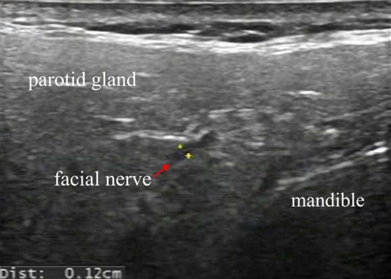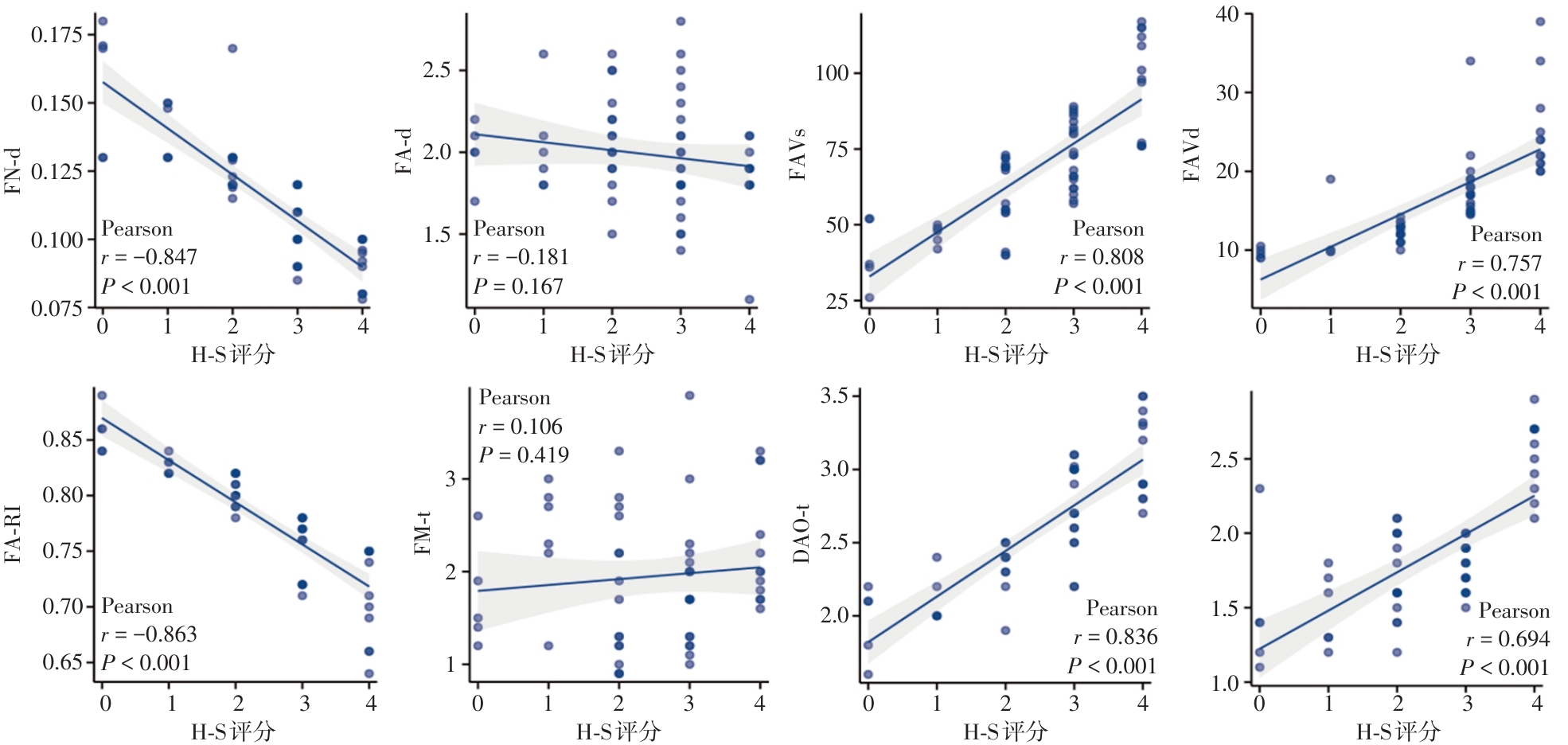 目的 通过高频超声(HFUS)探讨周围性面瘫(PFP)急性期患者颅外段面神经主干直径、局部血流动力学、面肌厚度的改变。 方法 纳入60例急性PFP患者作为PFP组,另纳入30例健康人群作为对照组。通过HFUS扫查并记录颅外段面神经主干直径(FN-d),面动脉直径(FA-d),面动脉收缩期流速(FA-Vs)、面动脉舒张期流速(FA-Vd)、面动脉阻力指数(FA-RI)、额肌厚度(FM-t)、降口角肌厚度(DAO-t)、降口唇肌厚度(DLI-t)等面部参数。评估各面部参数在PFP急性期诊断中的可行性,并进行组内及组间差异性比较,通过Pearson相关性分析PFP患者急性期面部参数与House-Brackmann(H-B)量表评分的相关性。 结果 (1)PFP组H-B量表评分显著低于对照组,差异有统计学意义(P < 0.05)。(2)不同检测者重复测量面部参数可信度良好(ICC > 0.75)。(3)PFP组患侧FN-d、FA-RI值高于健侧和对照组、FA-Vs、FA-Vd、DAO-t、DLI-t值低于健侧和对照组,差异有统计学意义(P < 0.05)。(4)PFP组患侧FN-d、FA-RI值与H-S量表评分成负相关(r = -0.847,P < 0.05;r = -0.863,P < 0.05);FA-Vs、FA-Vd、DAO-t、DLI-t与H-S量表评分成正相关(r = 0.808,P < 0.05;r = 0.757,P < 0.05;r = 0.836,P < 0.05;r = 0.694,P < 0.05)。 结论 HFUS可有效检出PFP患者急性期颅外段面神经主干直径的增加、局部微循环障碍以及面肌萎缩等特征性改变,且FN-d、FA-Vs、FA-Vd、FA-RI、DAO-t、DLI-t的增高与减低能够准确反映PFP的改善或进展,对临床病情监测和疗效评估具有重要的指导意义。